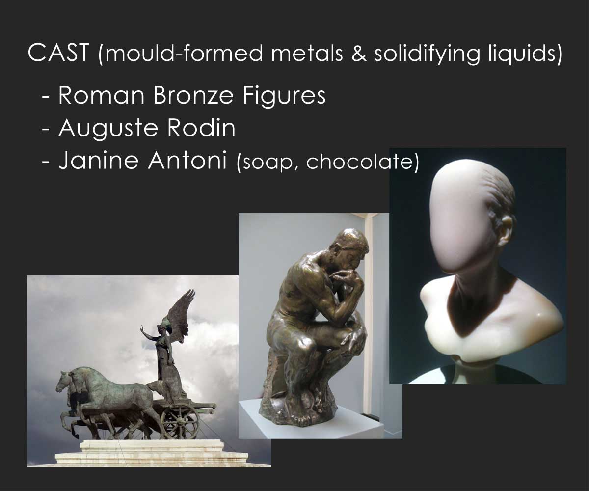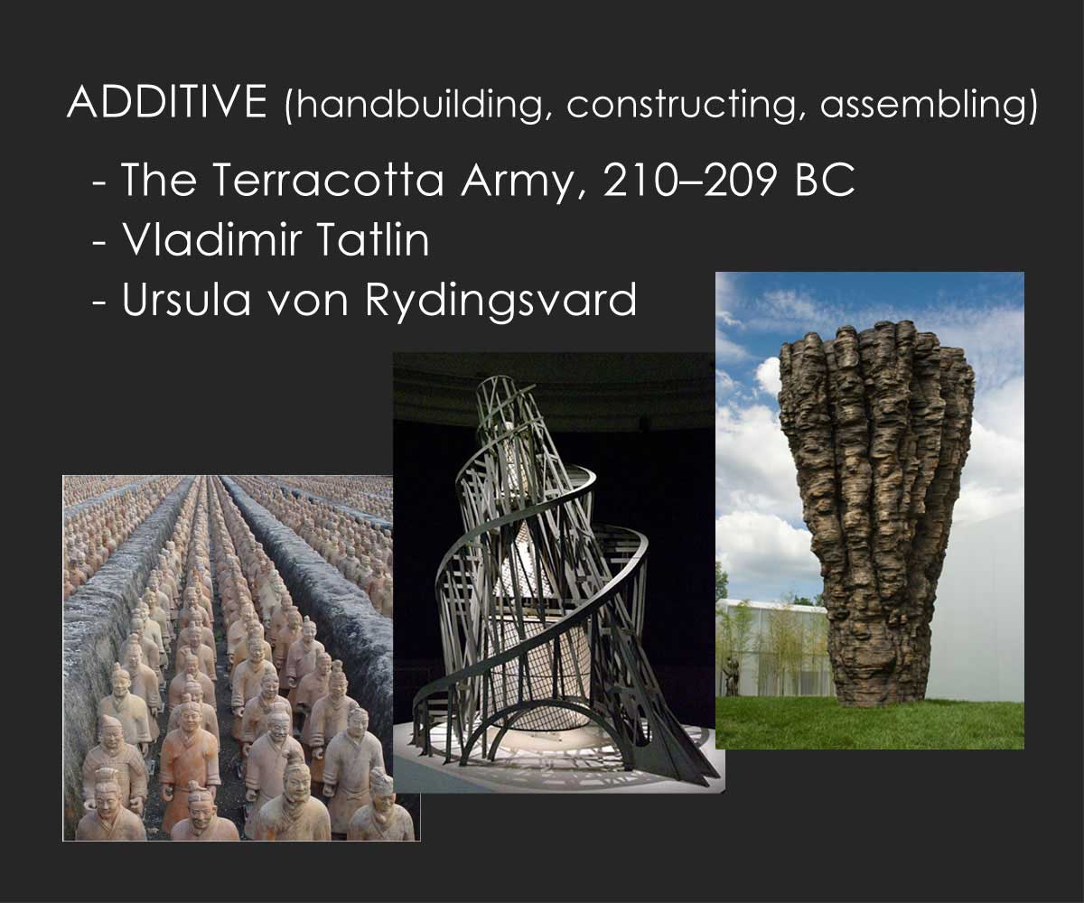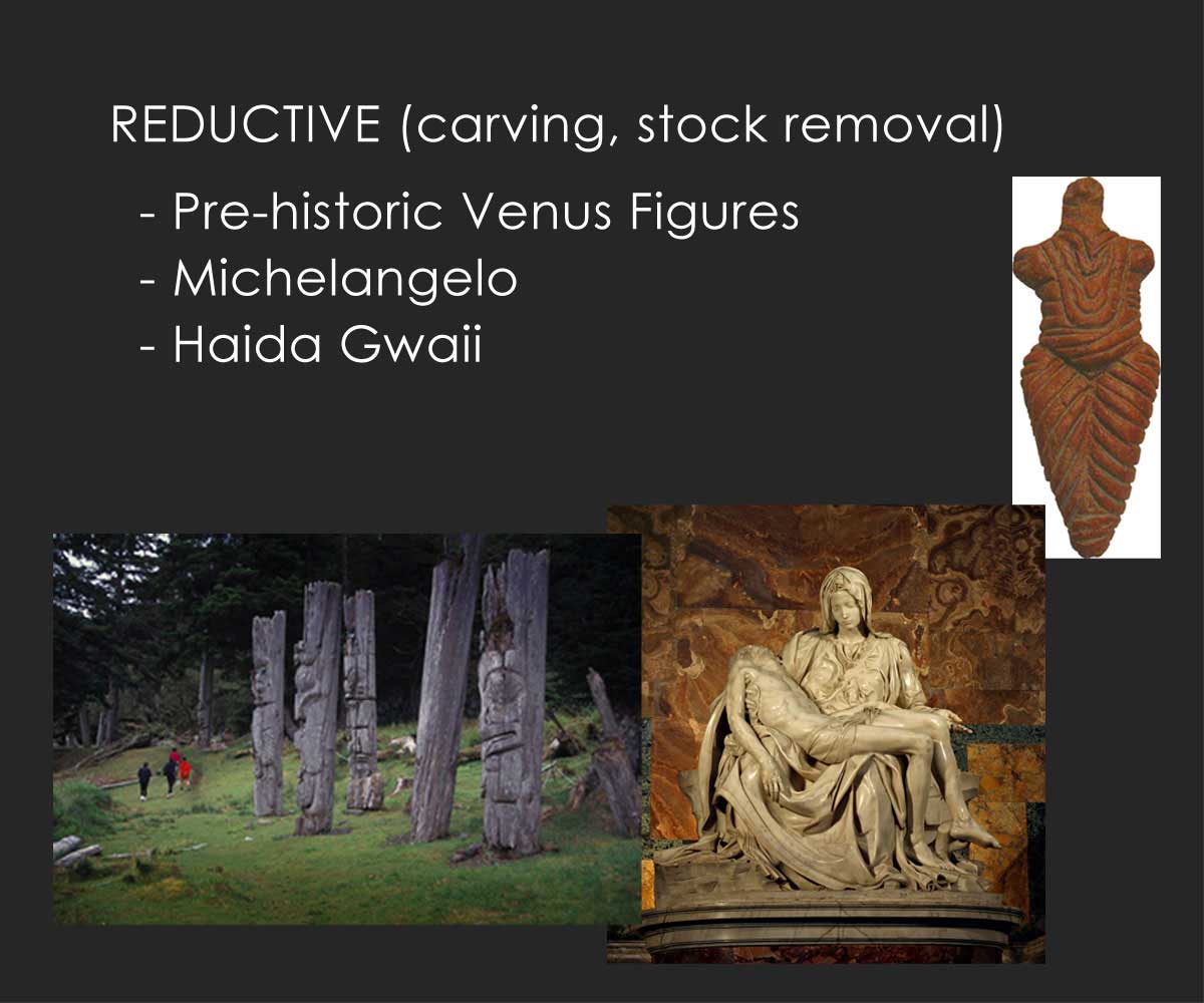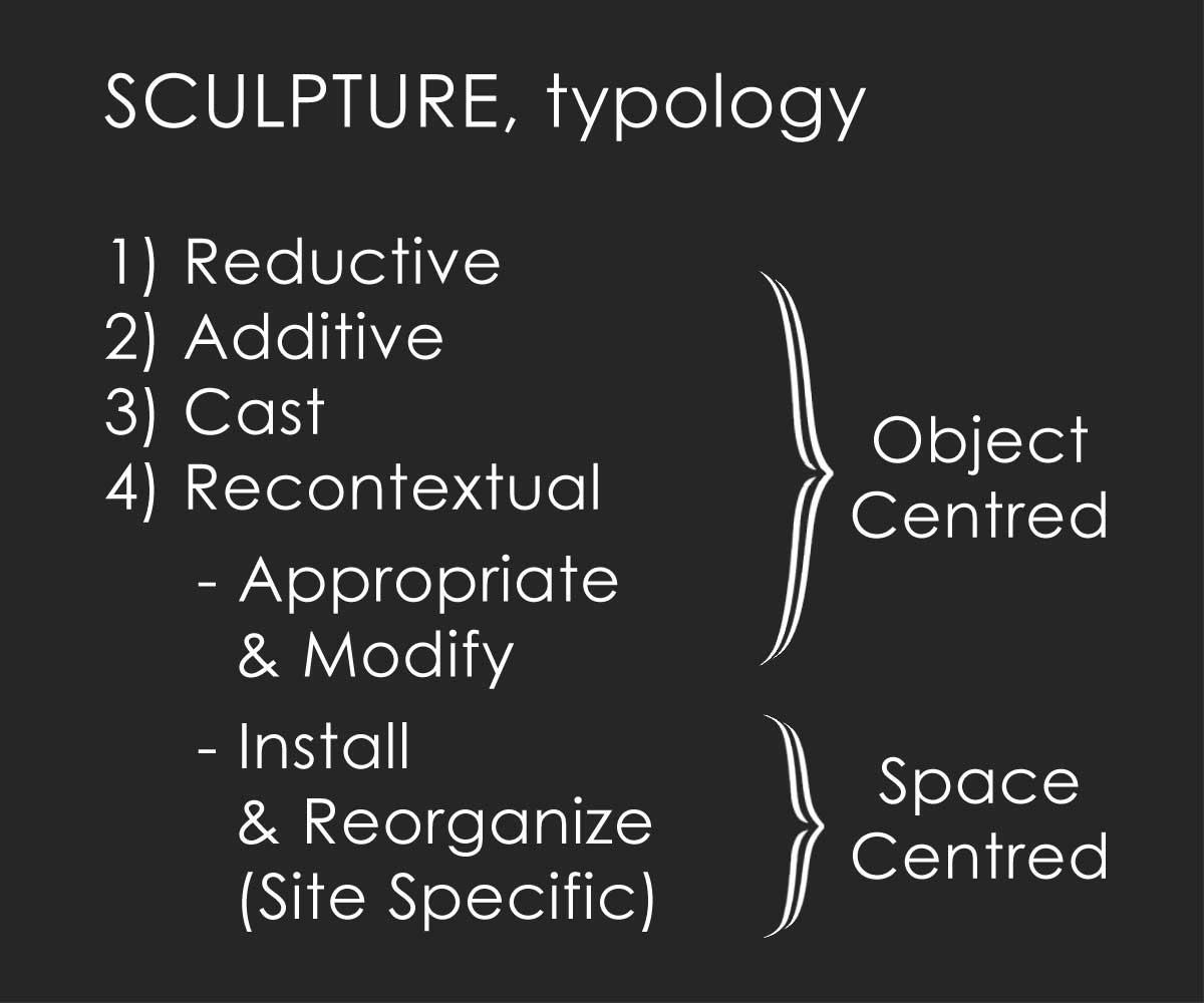 The term "sculpture" often encompasses a vast territory of processes and materials. Broadly speaking, we can group these processes into four general approaches: reduction, addition, casting and recontextualiaztion.