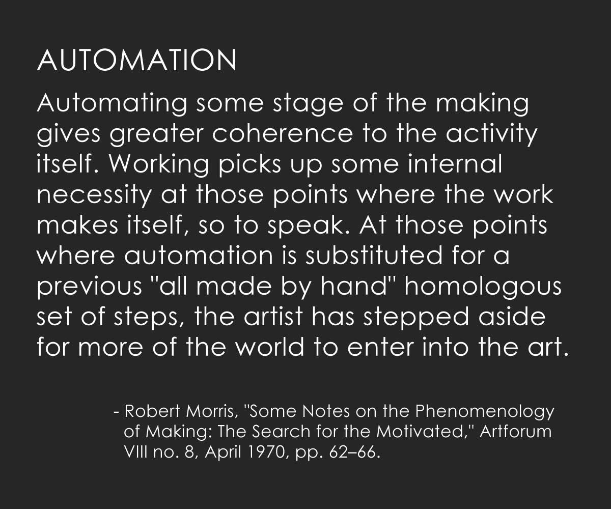 Systematization and Automation are powerful tools that can add momentum and creativity to an artist's work. Harnessing the power of these tools will turn art–making into a productive, lifelong pursuit.