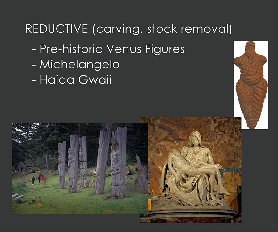 Reductive sculpture is one of the oldest forms of object–making known to us. Our early, nomadic ancestors created small, portable "Venus figures" by hitting a hard stone against a softer stone until a humanoid figure emerged. Although we don't know much about the purpose of these female–like forms, some scholars argue that the enlarged hips, breasts and belly suggest an intended use as a totem, perhaps to ensure the fertility of reproducing couples within a tribe.