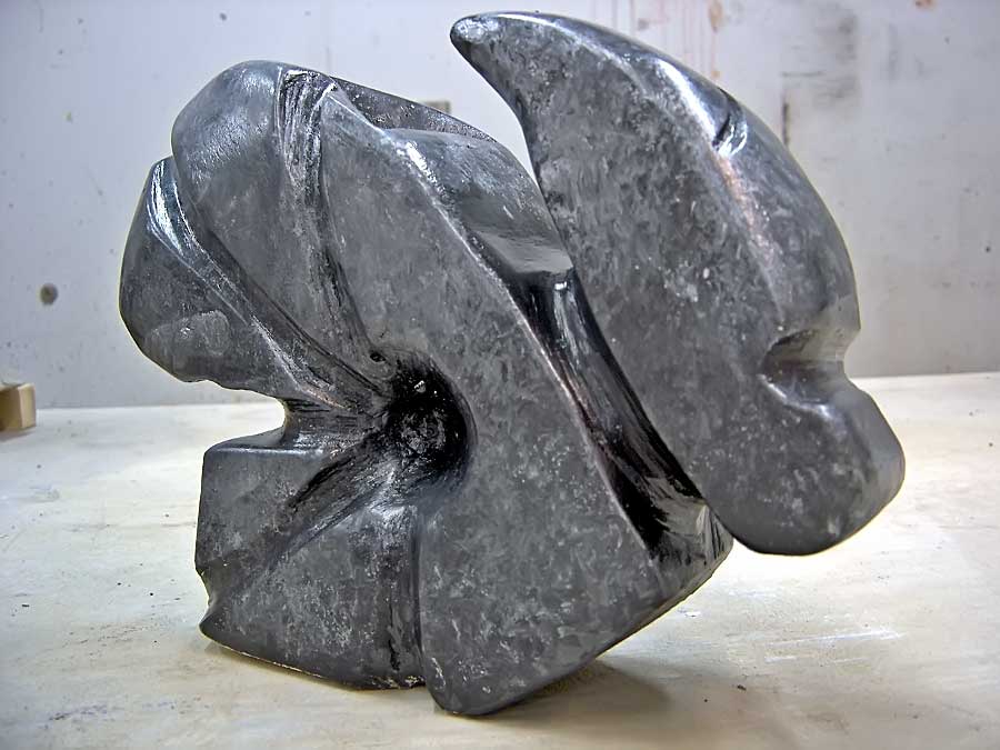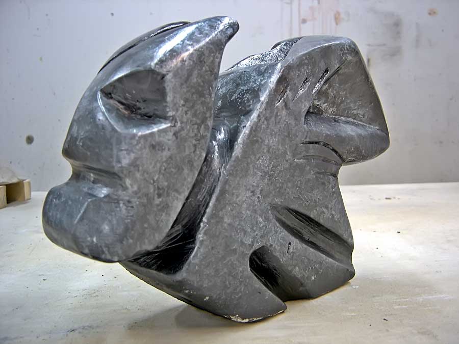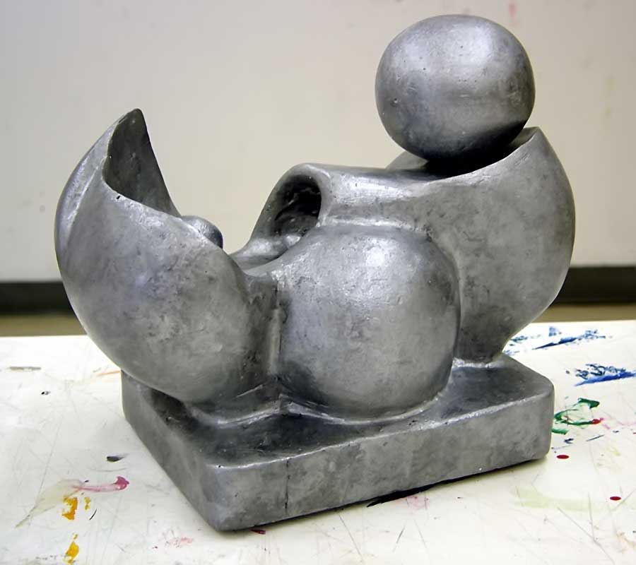 PROCEDURE: Mix and pour plaster into a cardboard box that's lined with plastic, thereby casting a block of plaster that measures approximately 9 x 9 x 9 inches. When your block has set (after about an hour it will be solid, but very fragile for several days until the water mostly evaporates), use a maul and a beetle or mallet with gouges, chisels, riflers, sure–forms and sandpaper to remove material until a form emerges.