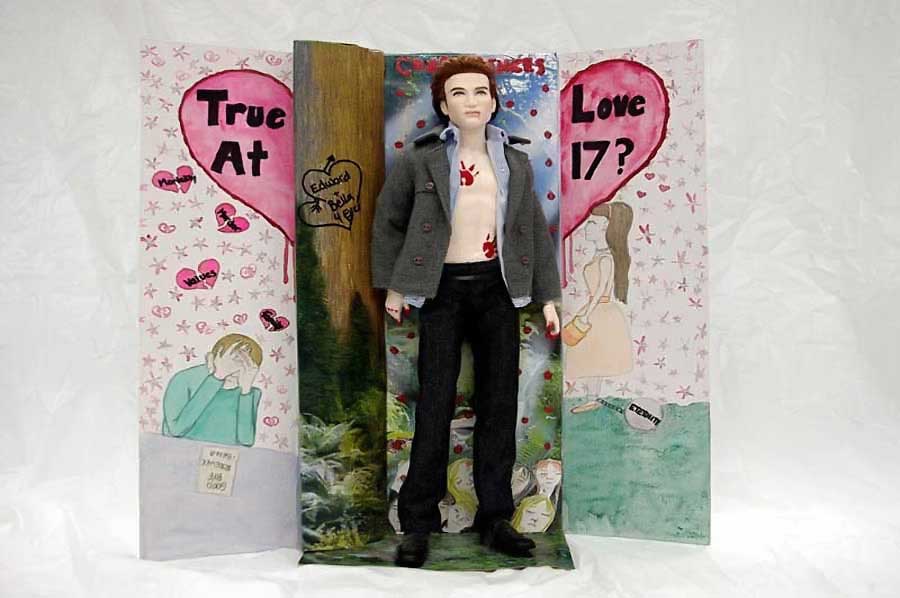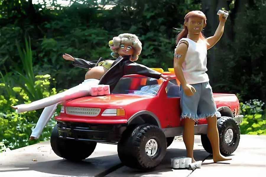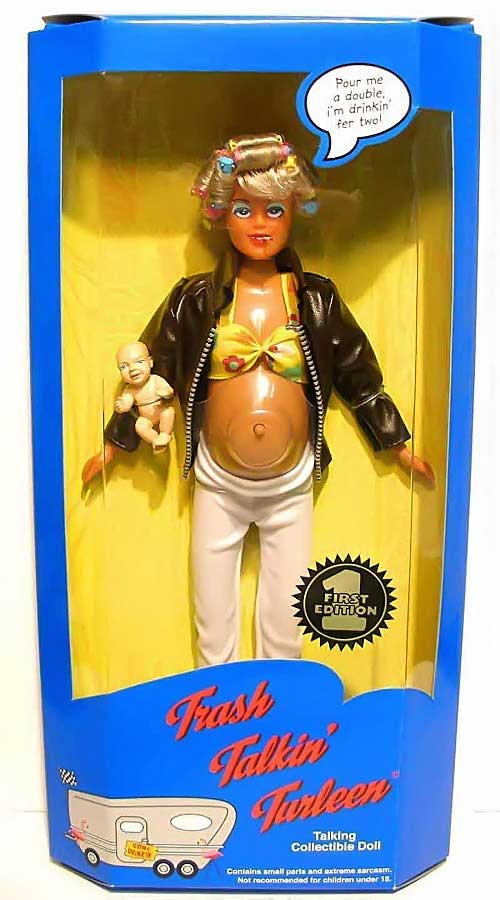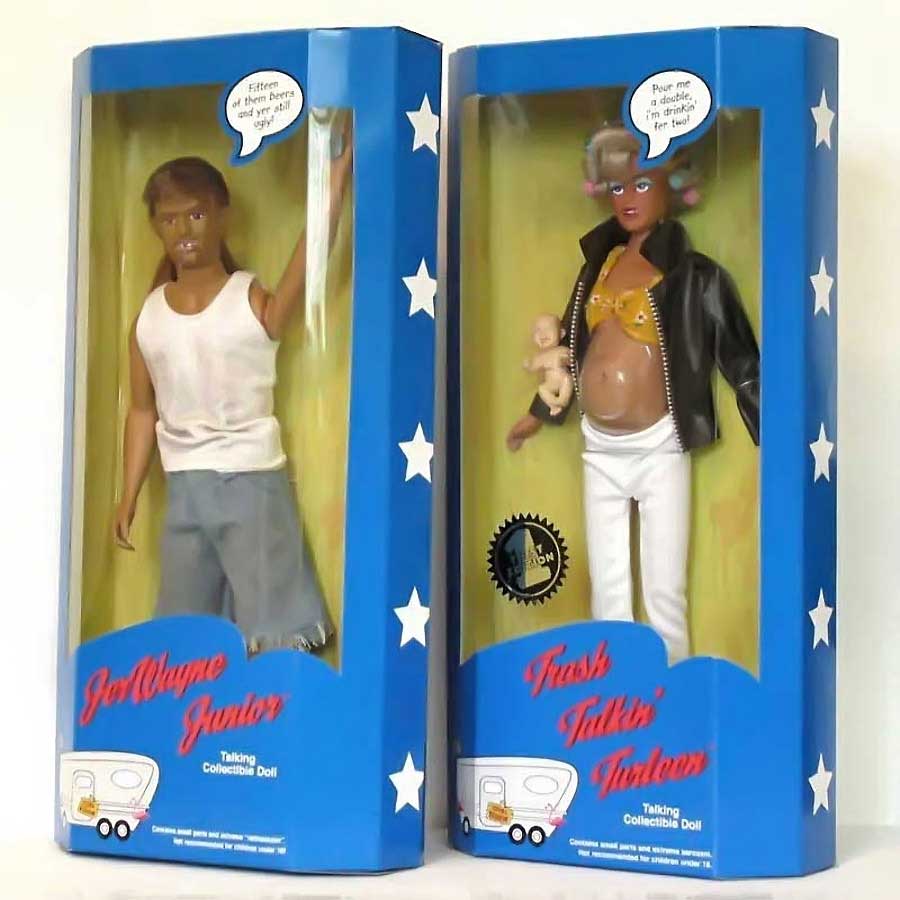 Also, above are redesigned fashion dolls that battle against Barbie'stm tyrany of unrealistic expectations. They were created, with tongue- firmly-planted-in-cheek, by Paul Montwillo and his company, Arsenic & Apple Pie. It's important to note that Montwillo's work has become something more than simply a critique of the traditional fashion doll: it also pokes fun (with a razor-sharp sense of parody) at a segment of society (the so-called, American underclass) that has had to endure its own share of gross generalizations and undeserved criticism. In an ironic way, Arsenic & Apple Pie has committed the same error as Matel®, except in the opposite direction (being excessively critical instead of excessively idealized). In any case, it's unclear who owns the copyright because Matel® sued Montwillo, who has also had ongoing legal disputes with his business partner William Tull (click here to read the whole story):