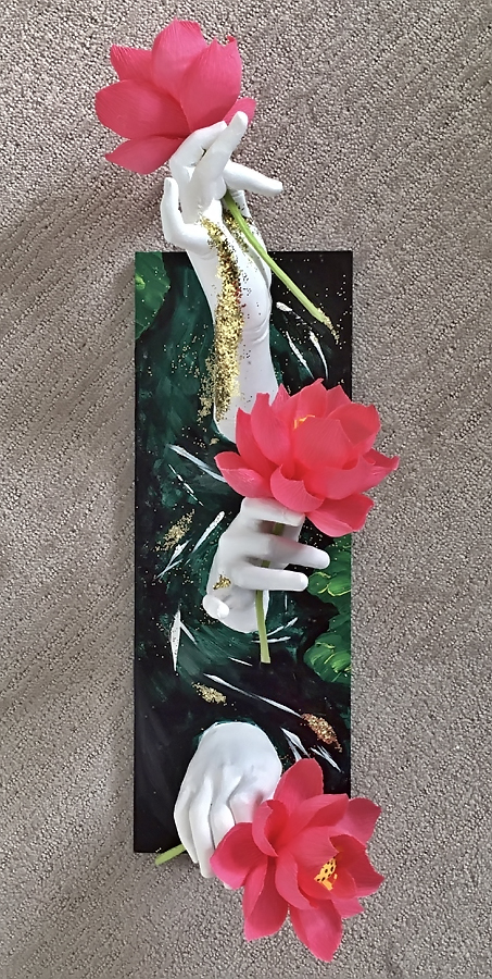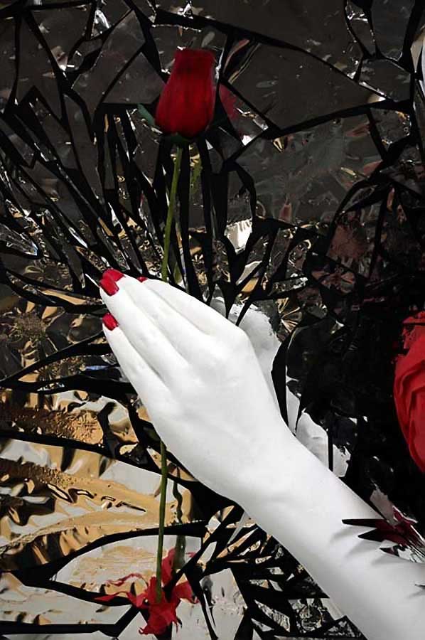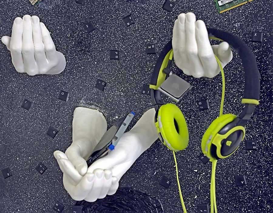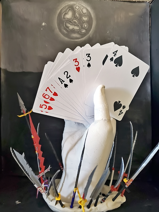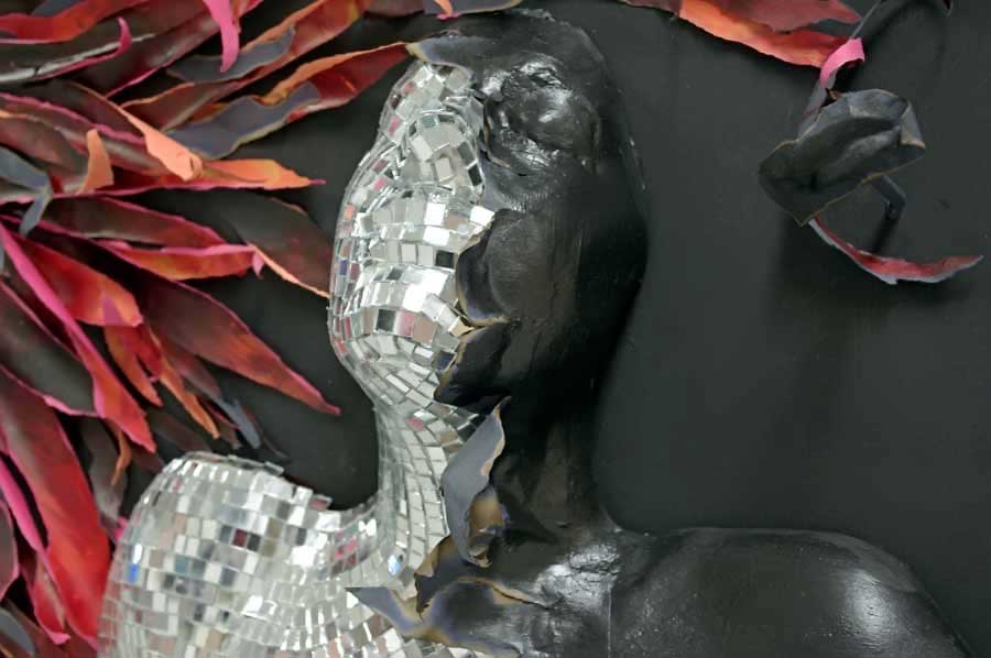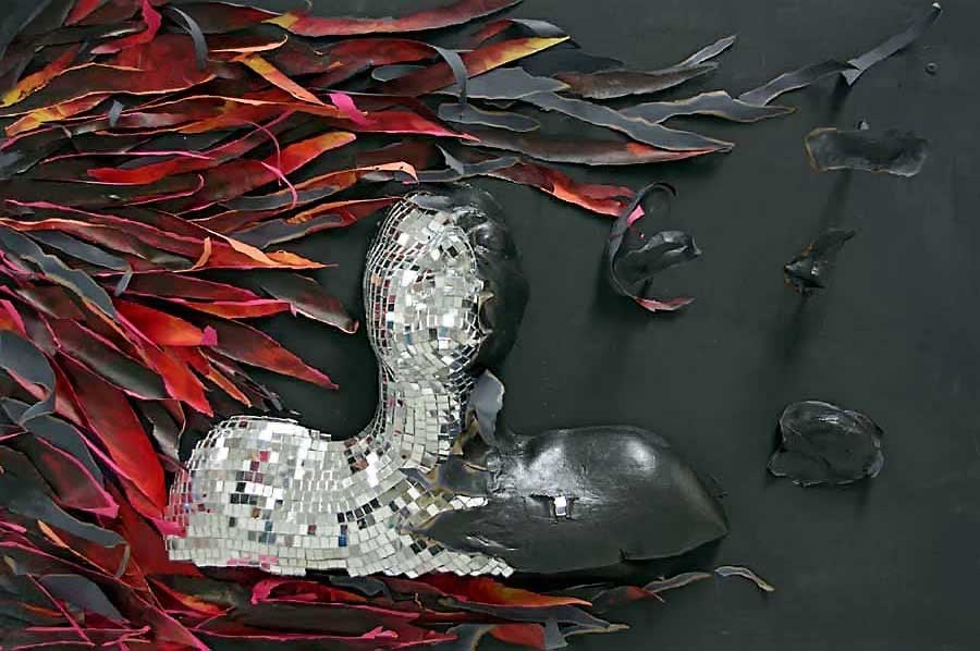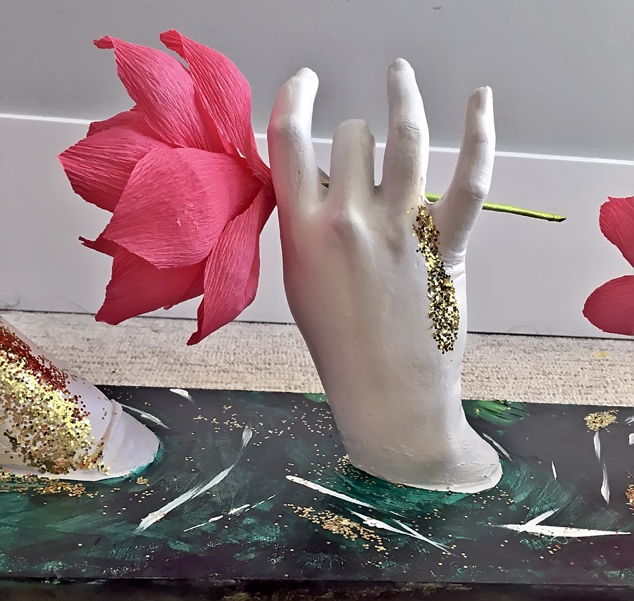 When you're ready with your cast, textured items and objects, experiment with a variety of compositions by placing things in different positions on the hardboard. Your textures and objects should interact with your lifecast to imbue the overall work with a narrative quality. For example, a fringe of fun fur surrounding your cast might create animal–like associations; surrounding your lifecast with circuit boards and machine parts could create associations with technology or science–fiction.