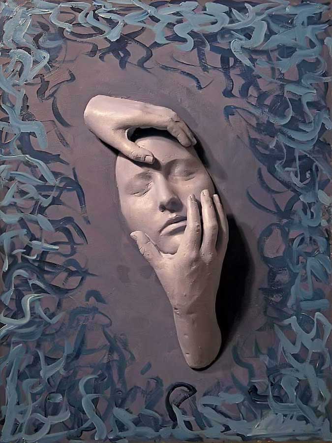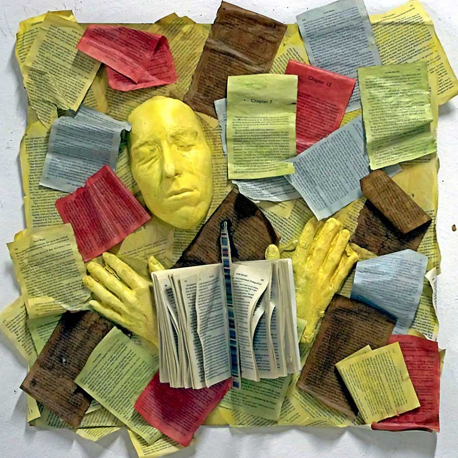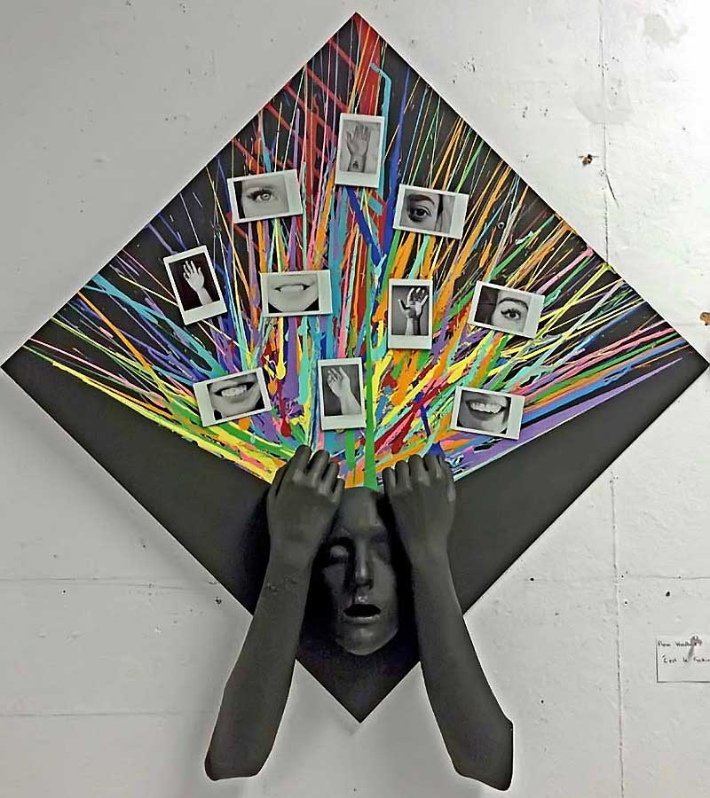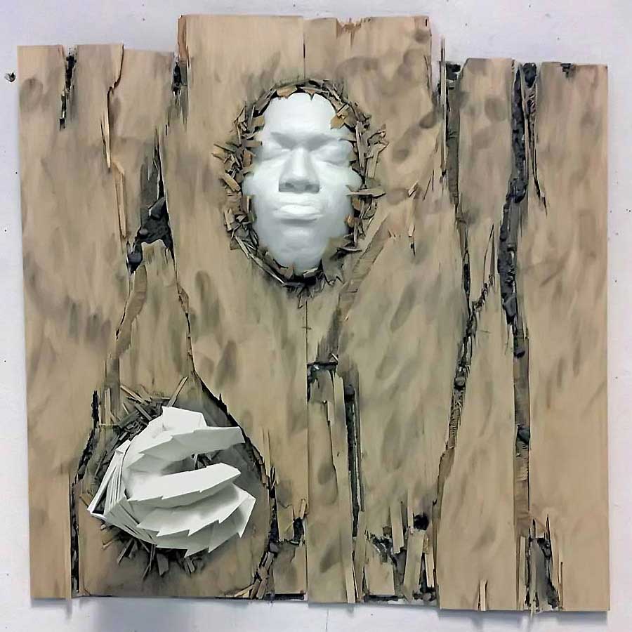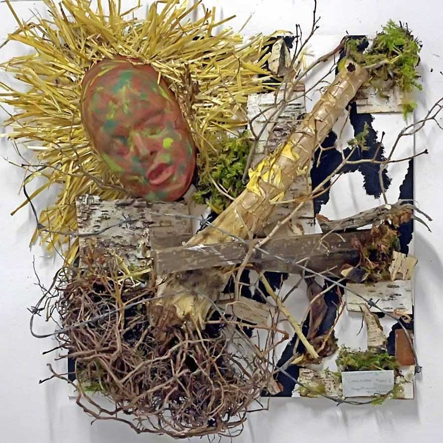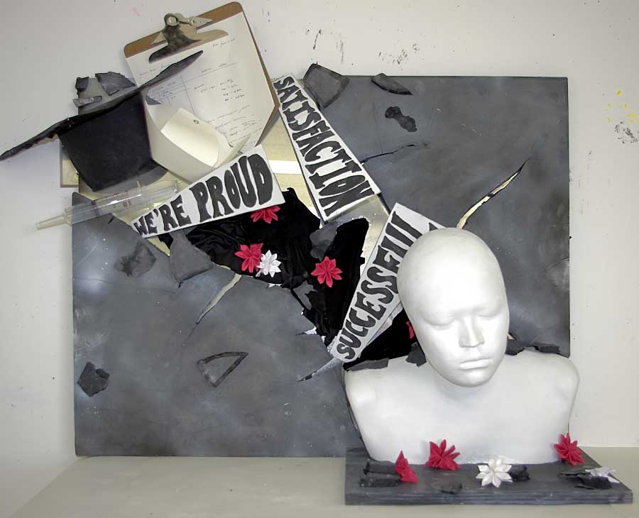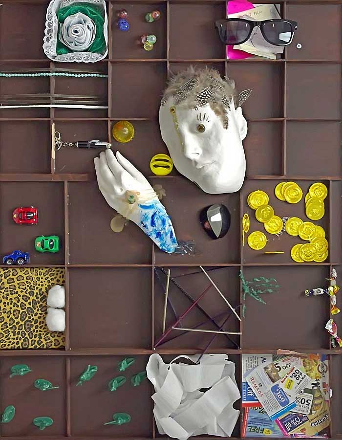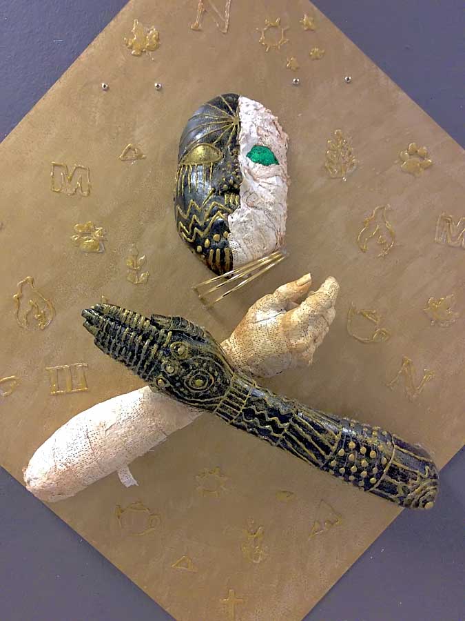 OBJECTIVE: Use found objects, textured materials and acrylic paint on a hardboard support to create a high–relief (or low–relief) combine. For subject matter, your work must include at least one lifecast component that reveals some aspect of your personality. Try to reach past the superficial persona that you project to the world on a daily basis — being a sports fan, chill, ready to party, studious, trying to be likeable, etc. — and choose imagery, poses, facial expression, materials and objects that help you to express your deepest fears, fondest desires or worst memories.