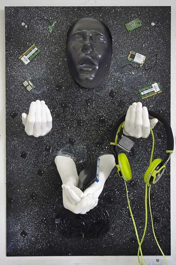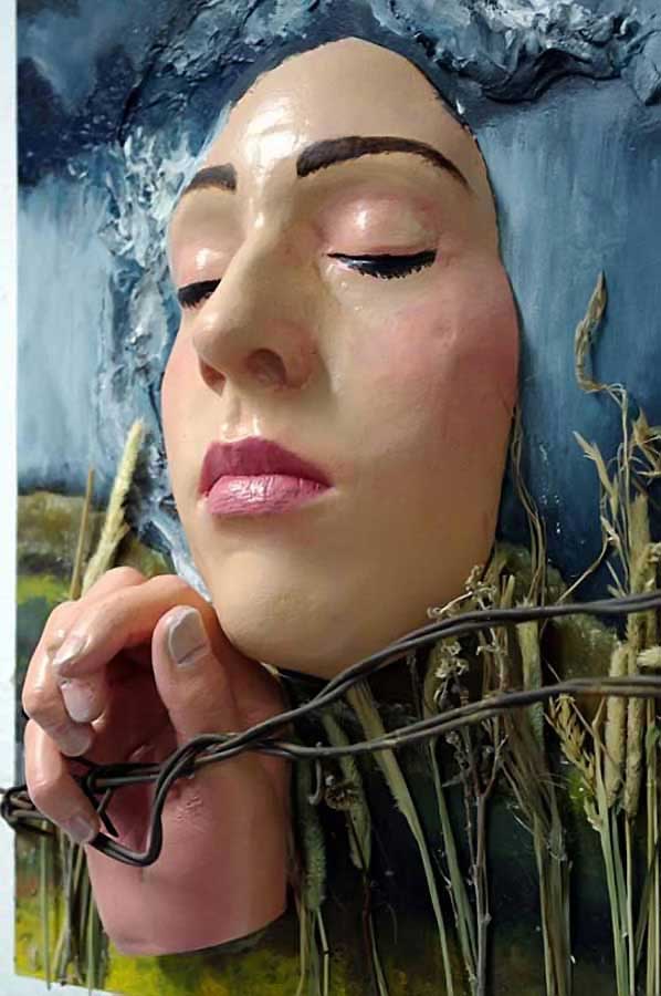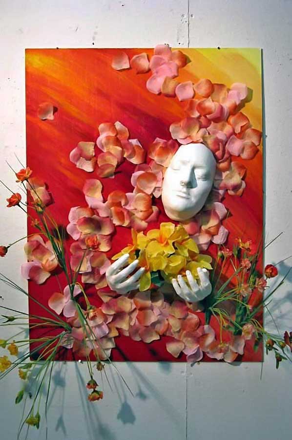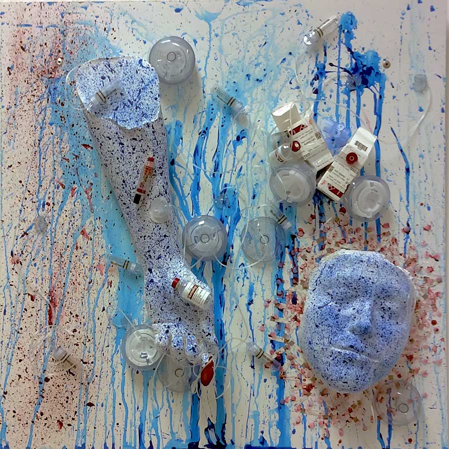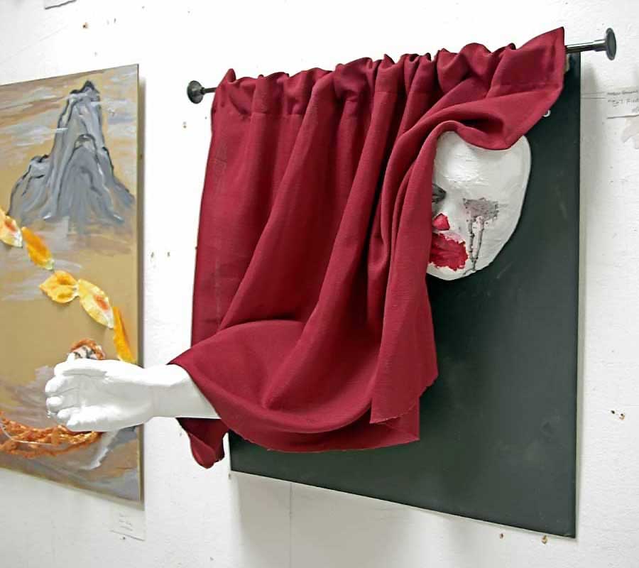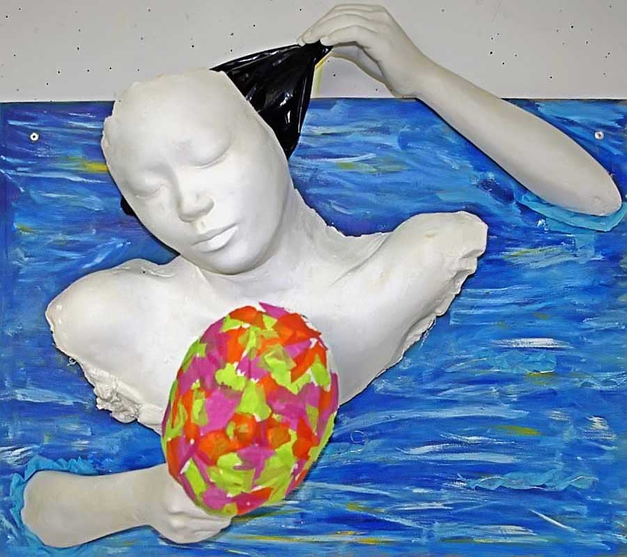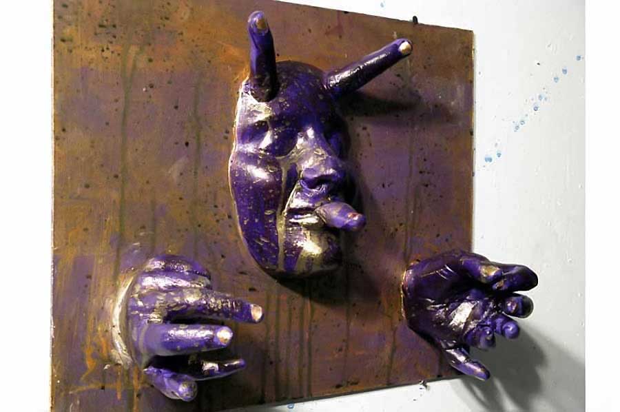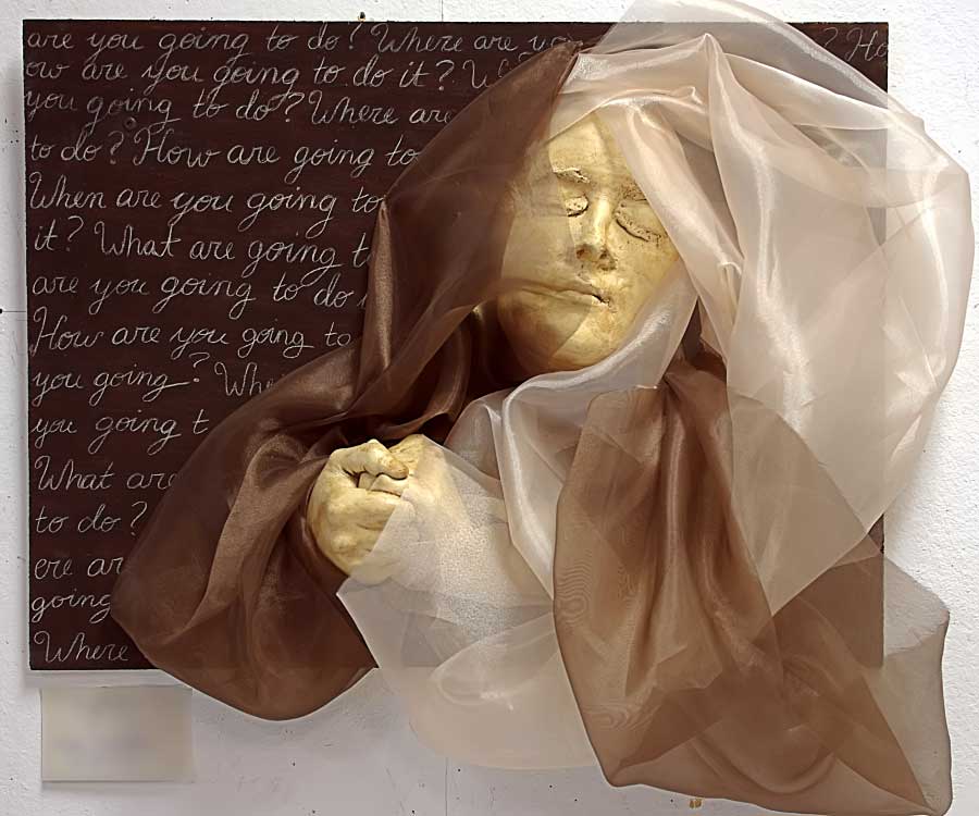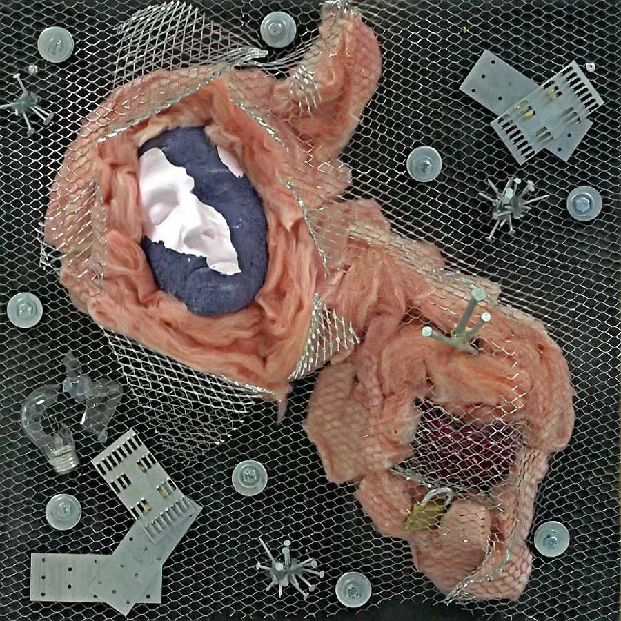 OBJECTIVE: Use found objects, textured materials and acrylic paint on a hardboard support to create a high–relief (or low–relief) combine. For subject matter, your work must include at least one lifecast component that reveals some aspect of your personality. Try to reach past the superficial persona that you project to the world on a daily basis — being a sports fan, chill, ready to party, studious, trying to be likeable, etc. — and choose imagery, poses, facial expression, materials and objects that help you to express your deepest fears, fondest desires or worst memories.