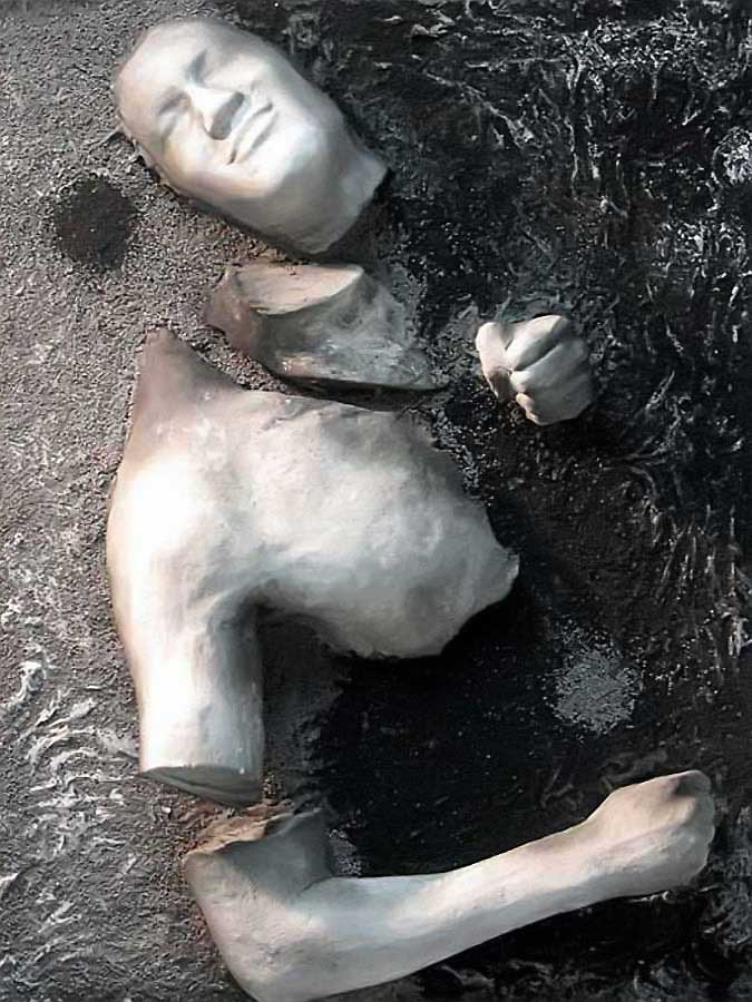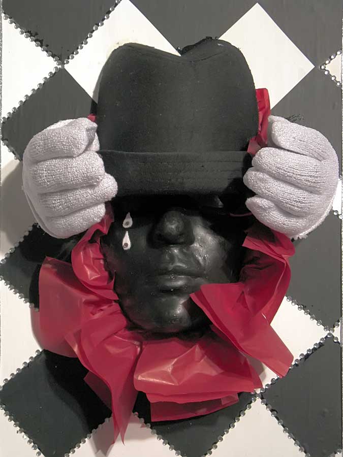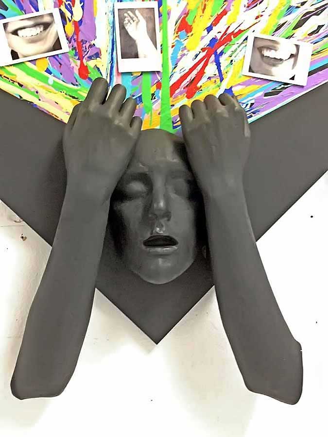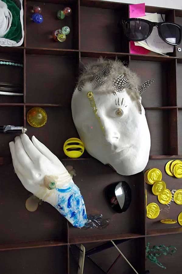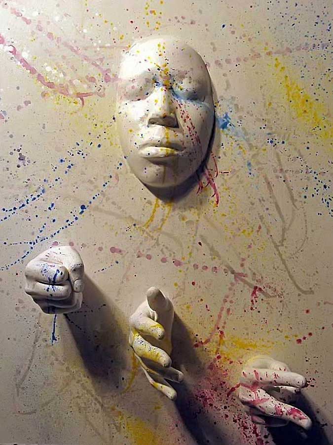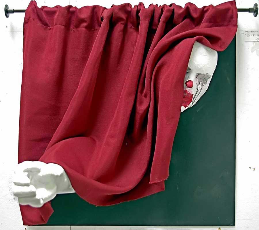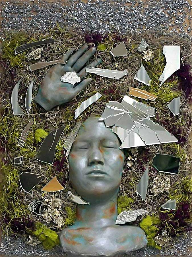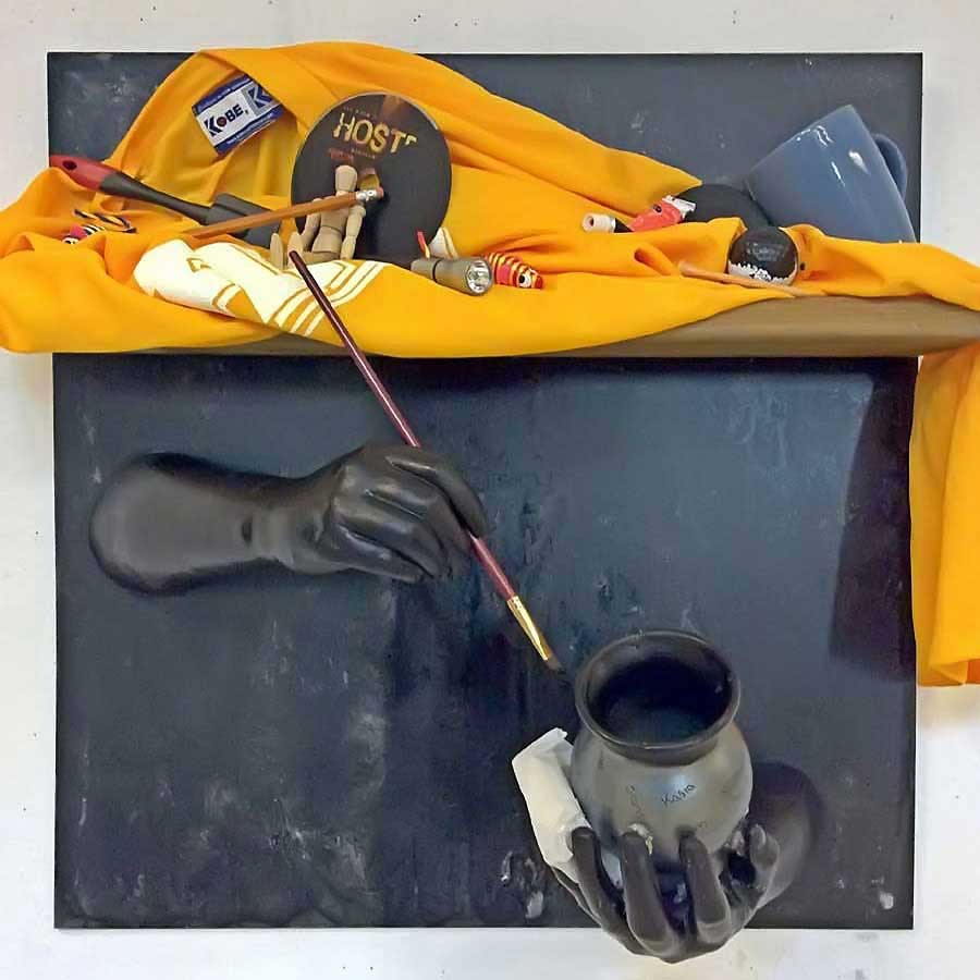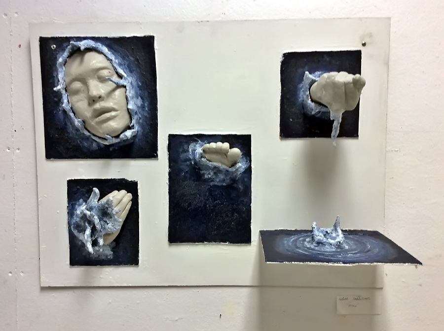 OBJECTIVE: Use found objects, textured materials and acrylic paint on a hardboard support to create a high–relief (or low–relief) combine. For subject matter, your work must include at least one lifecast component that reveals some aspect of your personality. Try to reach past the superficial persona that you project to the world on a daily basis — being a sports fan, chill, ready to party, studious, trying to be likeable, etc. — and choose imagery, poses, facial expression, materials and objects that help you to express your deepest fears, fondest desires or worst memories.
