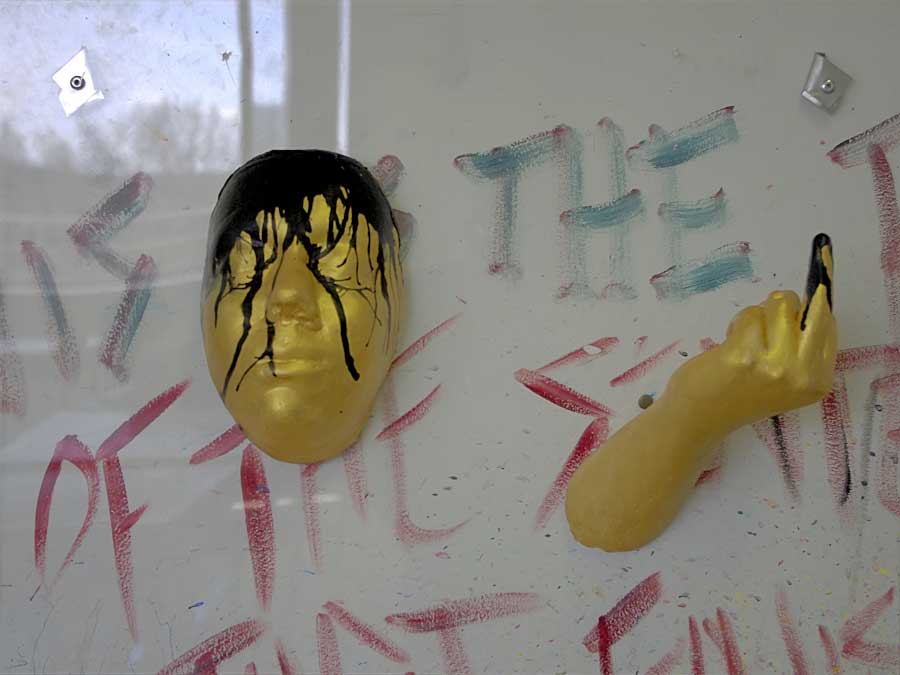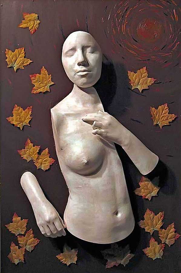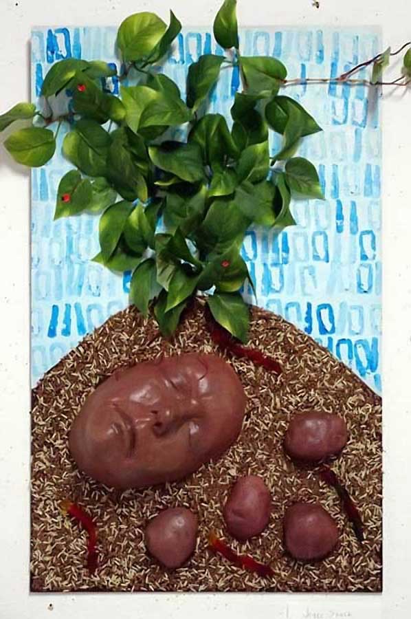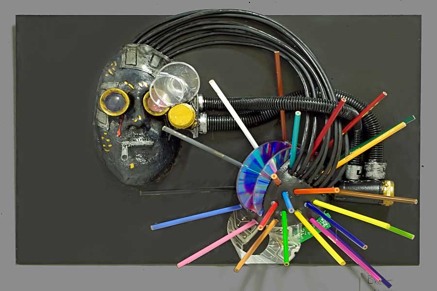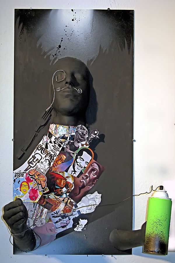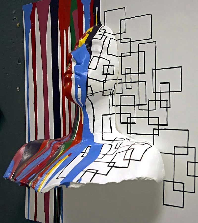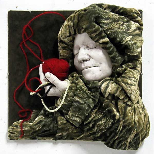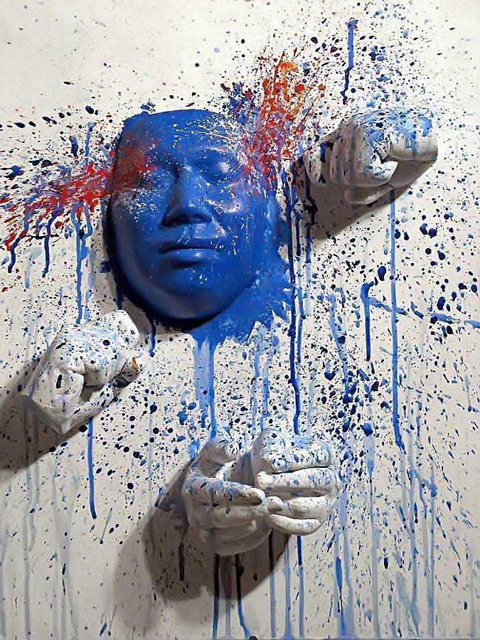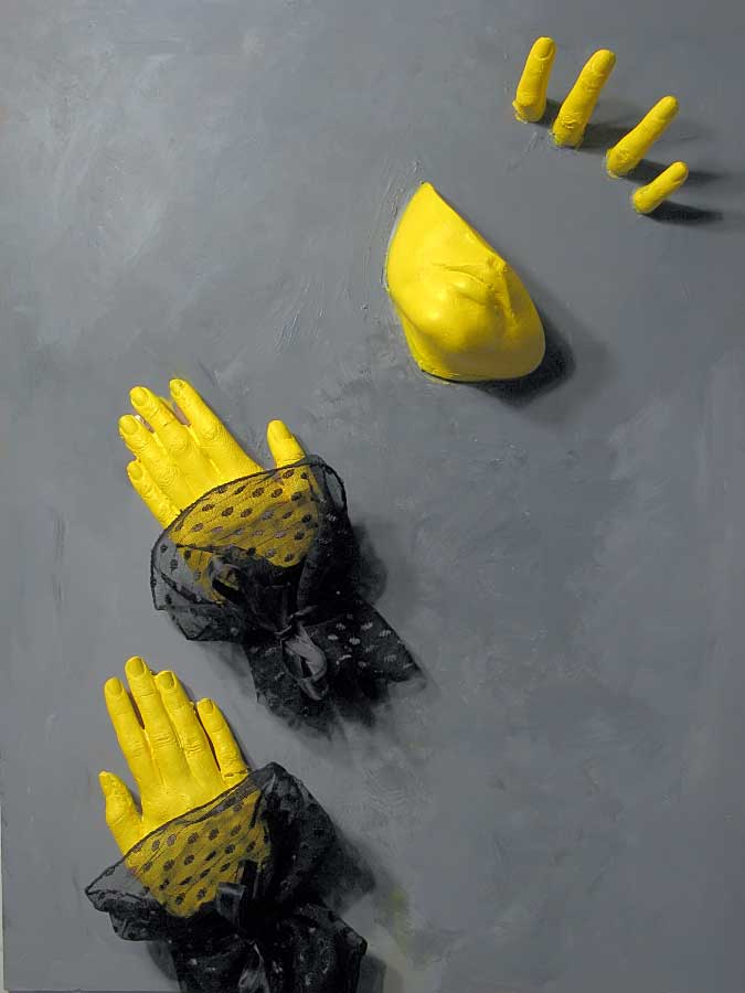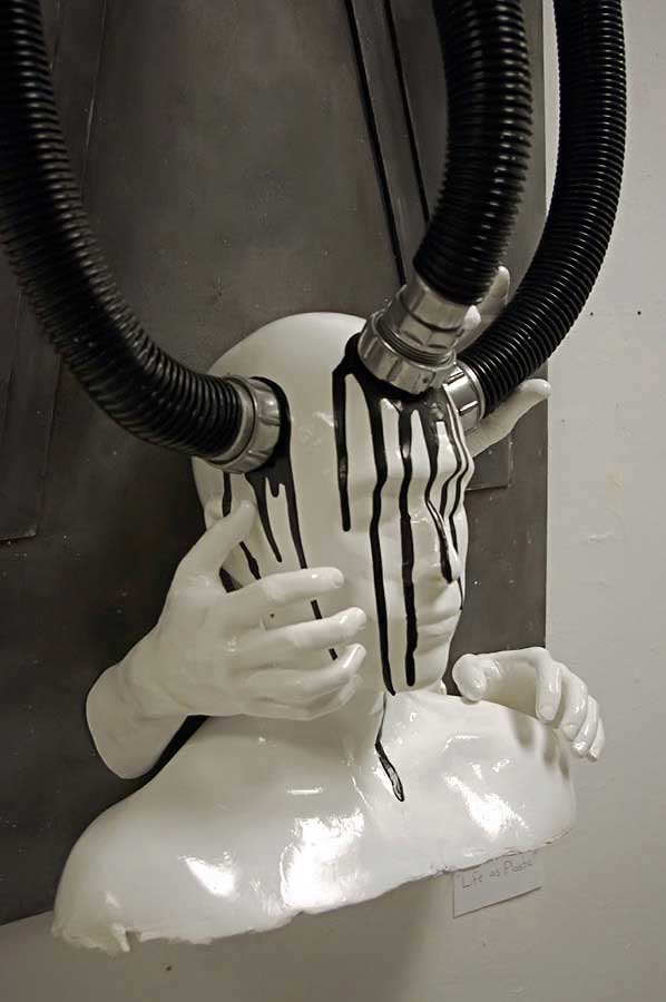 OBJECTIVE: Use found objects, textured materials and acrylic paint on a hardboard support to create a high–relief (or low–relief) combine. For subject matter, your work must include at least one lifecast component that reveals some aspect of your personality. Try to reach past the superficial persona that you project to the world on a daily basis — being a sports fan, chill, ready to party, studious, trying to be likeable, etc. — and choose imagery, poses, facial expression, materials and objects that help you to express your deepest fears, fondest desires or worst memories.