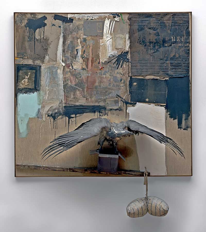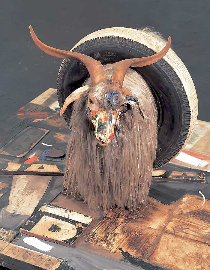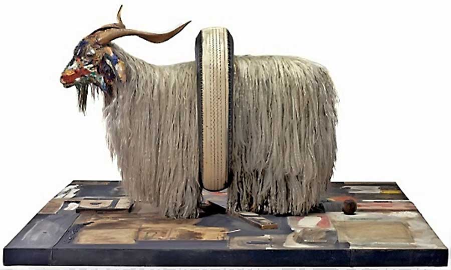 Making a sculptural artwork often requires a great deal of thought, planning and the skilful use of tools, adhesives and hardware. This is especially true when combining different objects and materials, like Robert Rauschenberg did when he created Monogram, an assemblage onto which he fastened a taxidermied, Angora goat wearing a car tire! Rauschenberg used the word "combine" to describe this sort of artwork: one that combines sculptural objects with painted forms. When he made Monogram, the combine went through many iterations over a period of months; sitting in the corner of his studio, with the goat always as the primary element.