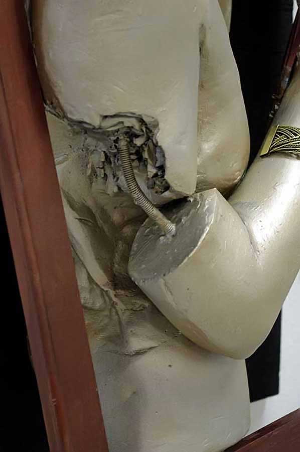 TECHNICAL: Depending on the weight and the composition of the rest of your objects and materials, you will need to attach them with carpenter's glue, white glue, PL400 / Premium, silicone, expanding polyurethane or hot glue. NOTE: The PL adhesives and expanding polyurethane always work best for anything made of plaster, except when attaching broken parts (like fingers), in which case the white glue is superior. Also, if your objects and materials are awkward or heavy, it will be necessary to use mechanical fasteners such as low-root screws, drywall screws and pop-rivets (I will assist you with this task).