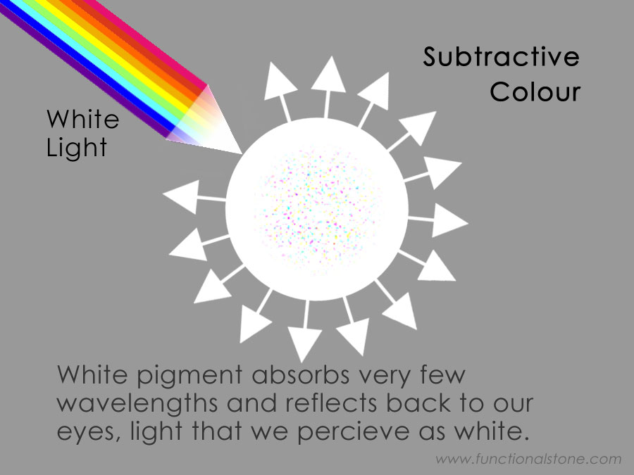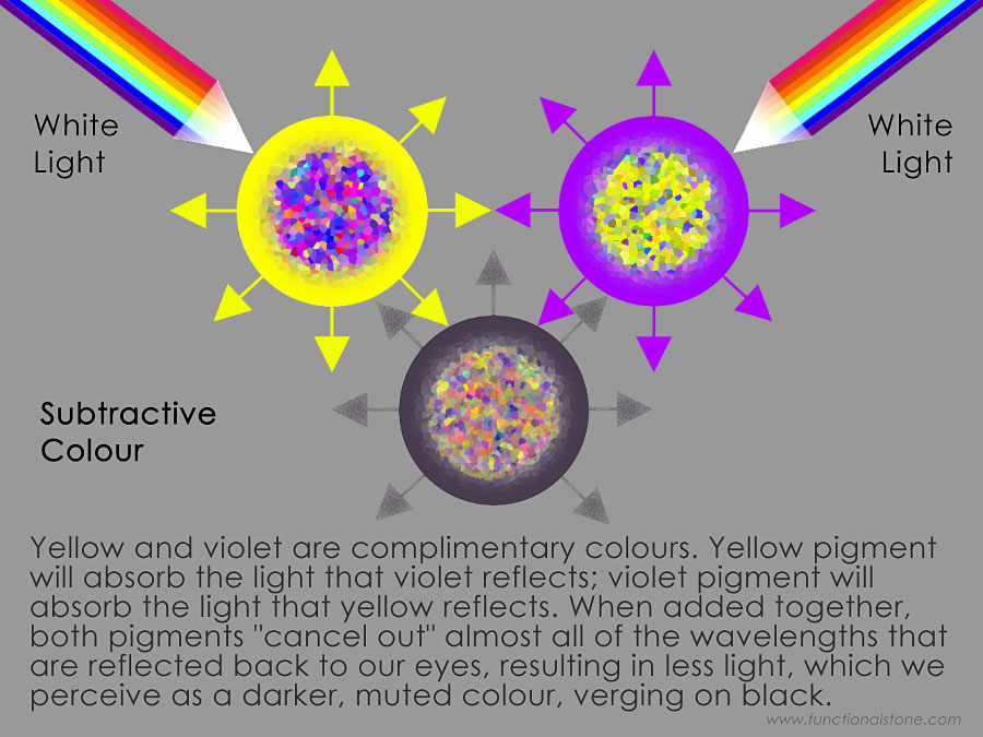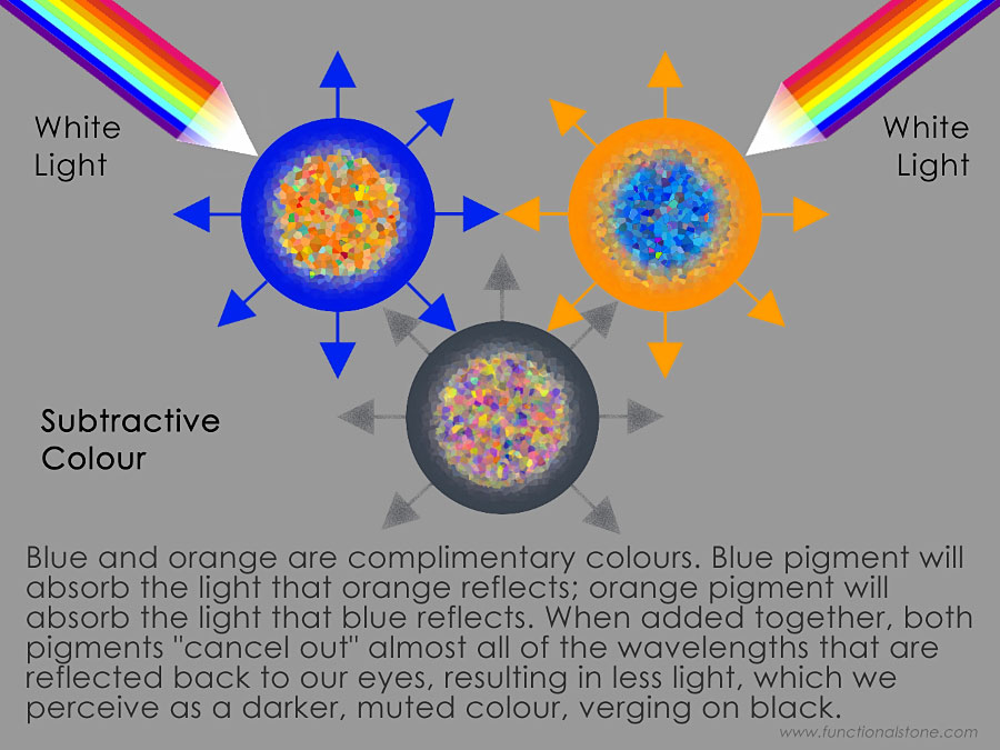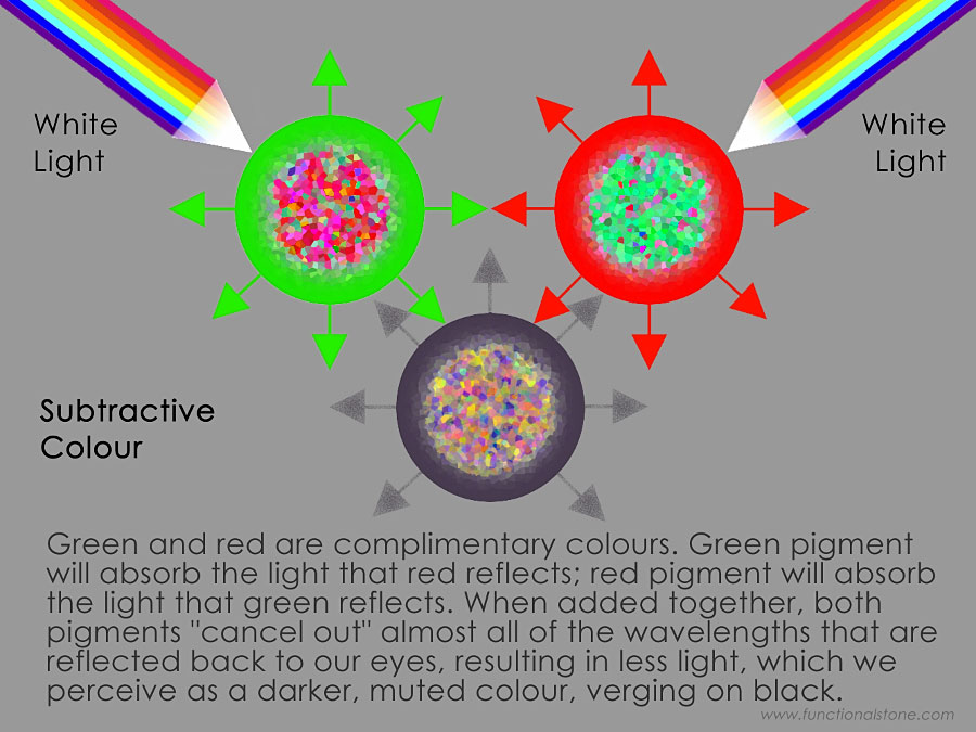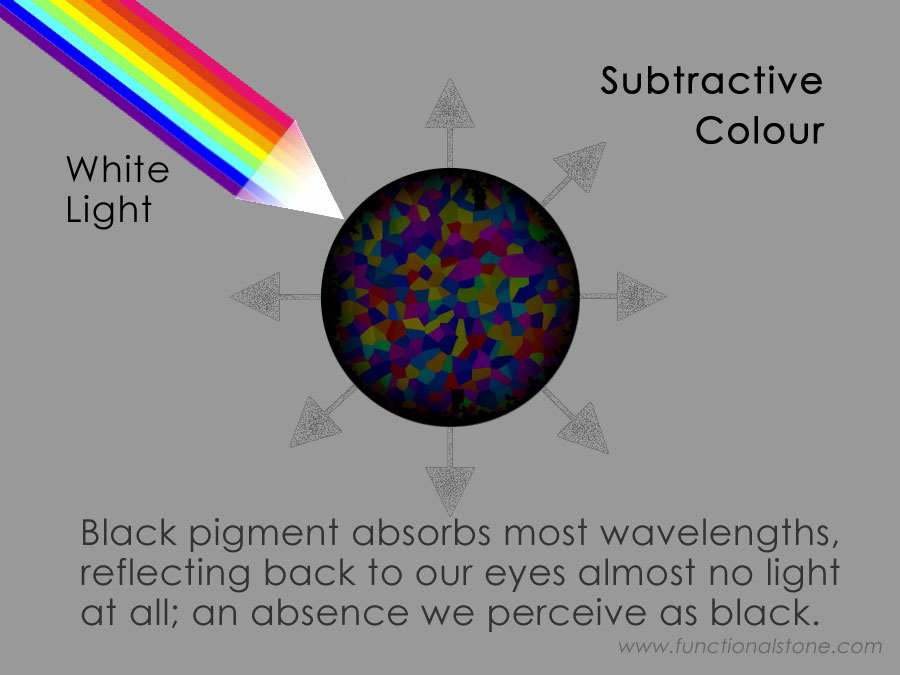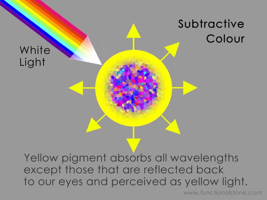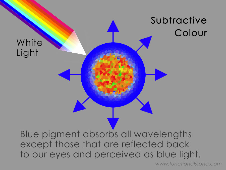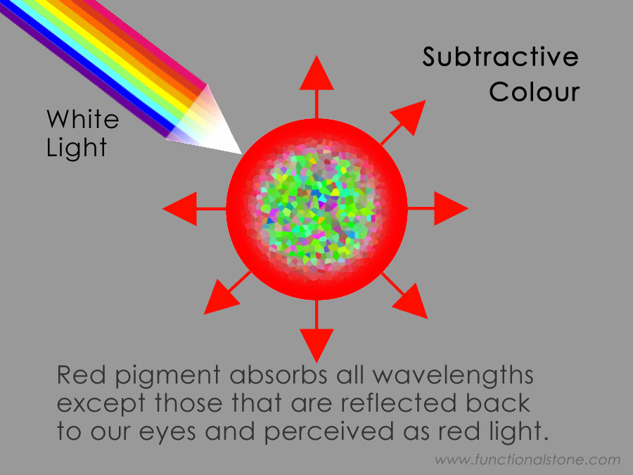 The way that subtractive colours work is pretty simple, but needs a bit of explaining... When white light (which is comprised of all colours) falls on an object, it will be partially absorbed and partially reflected. The amount of absorption and reflection will depend on the object's surface. In essence, when certain wavelengths are absorbed by a material, those wavelengths will be absent in the remaining light that's reflected back to the surrounding environment: a red object appears red because its surface doesn't absorb red light; a blue object appears blue because it doesn't absorb blue light; and so on.