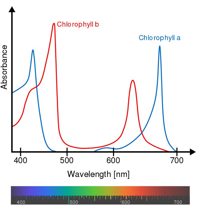 The leaf of a tree, for instance, absorbs most of the ultraviolet-to-blue and orange-to-infrared parts of the visible spectrum, which are the most useful wavelengths (see the chlorophyll spectra illustration). The leaf has evolved an ability to absorb these parts of the spectrum by producing a green substance called chlorophyll. Without going into too much detail, chlorophyll enables photosynthesis to take place so that the leaf can convert sunlight into energy. The green and yellow parts of the visible spectrum are not very useful for this task and so those wavelengths are reflected away from the leaf and into the surrounding environment. This is why all chlorophyll-producing plants appear green and yellow-green.
