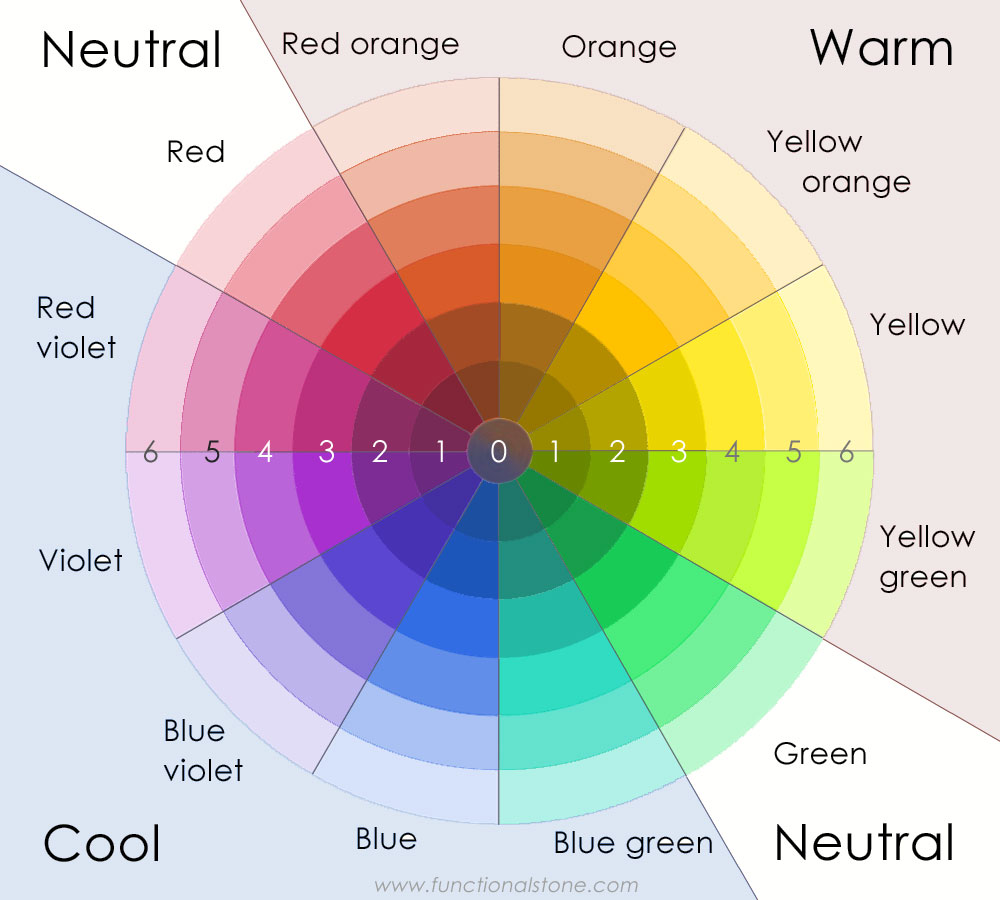 Many of the pure hues (the way most colours appear when used straight out of the tube) will occupy ring 3, but with a few exceptions: Violet, blue-violet and red-violet are naturally dark hues (some painters substitute violet for black in their paintings). Depending on how dark your violet paint appears (some brands have more pigment, which can make them darker), you will probably have to place the pure hue(s) on ring 2 instead of ring 3. You will then mix 4 lighter tints and 1 darker shade for each of these colours. Likewise, yellow is a naturally light hue and should be shifted in the opposite direction. The pure hue would then sit on ring 4 surrounded by 2 lighter tints and 3 darker shades.