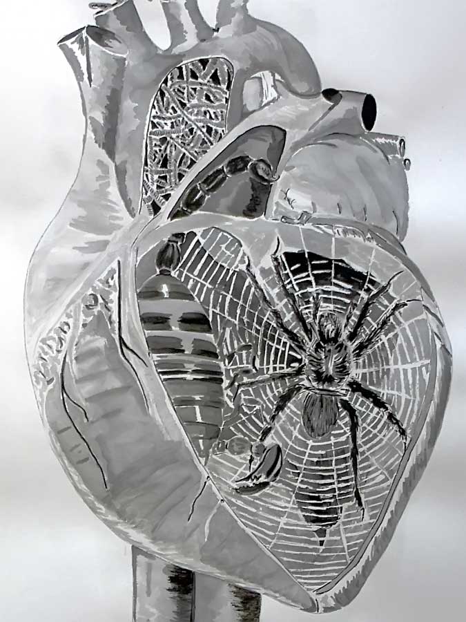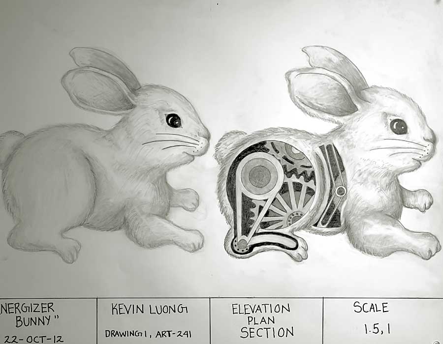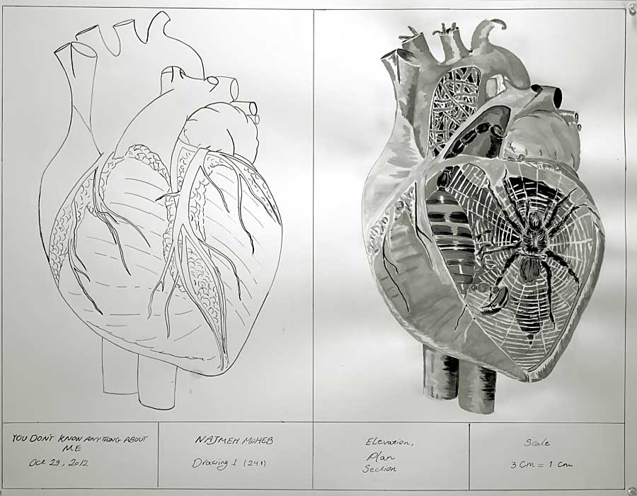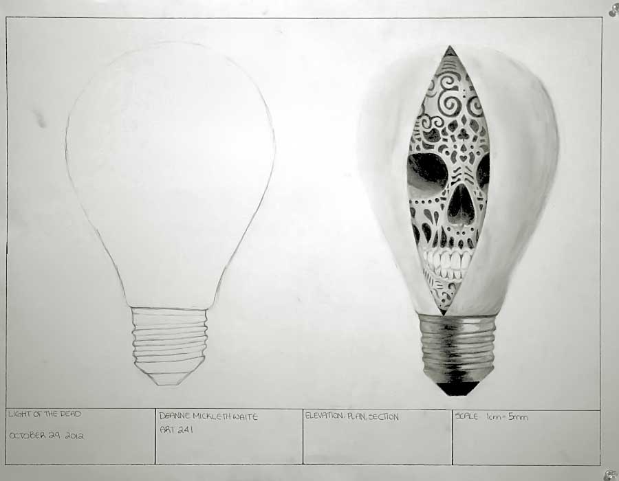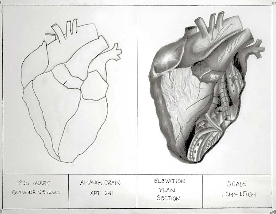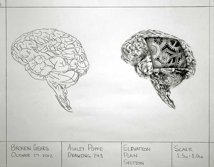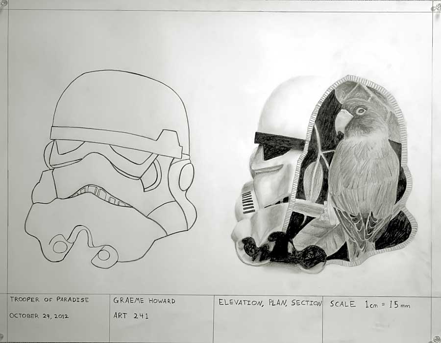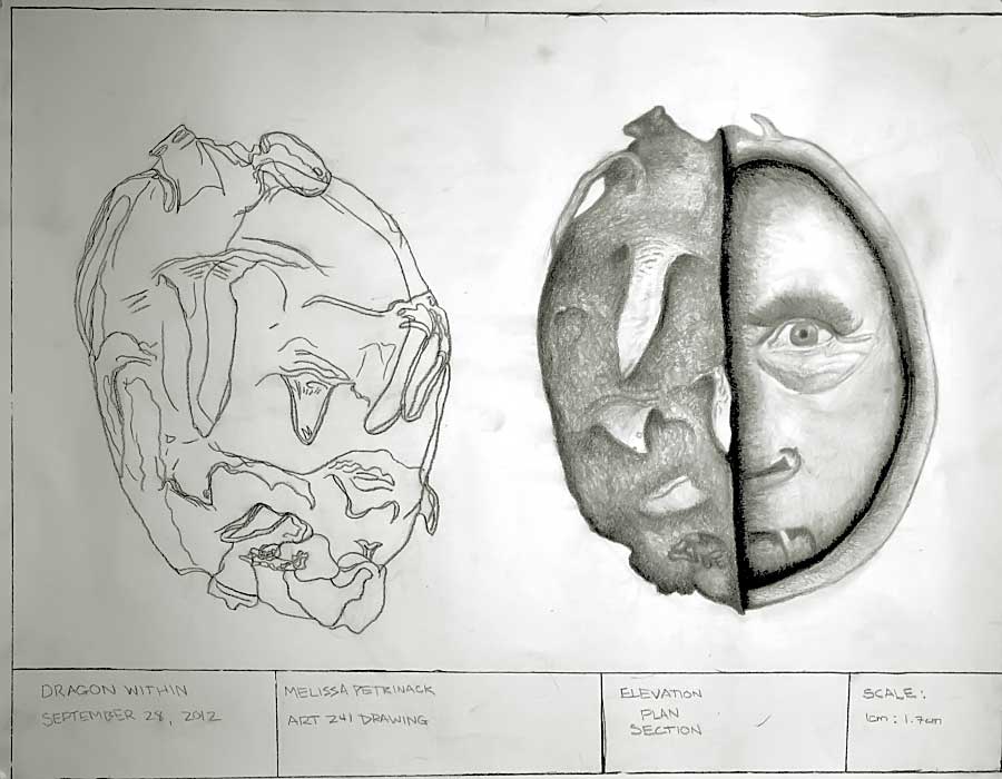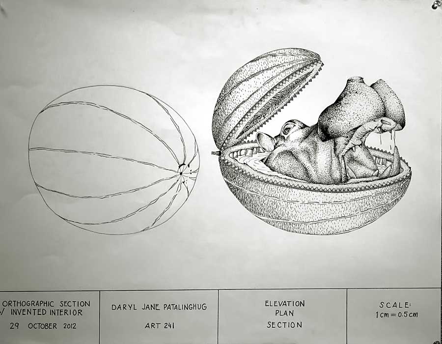 OBJECTIVE: Use graphite (or another fine-pointed drawing tool) on good-quality paper to create a technically-accurate, but imaginary, orthographic section of two distant realities (one object inside of the other). The end result should have "emotional power" and poetry, but also display a sense of "designed ingenuity".