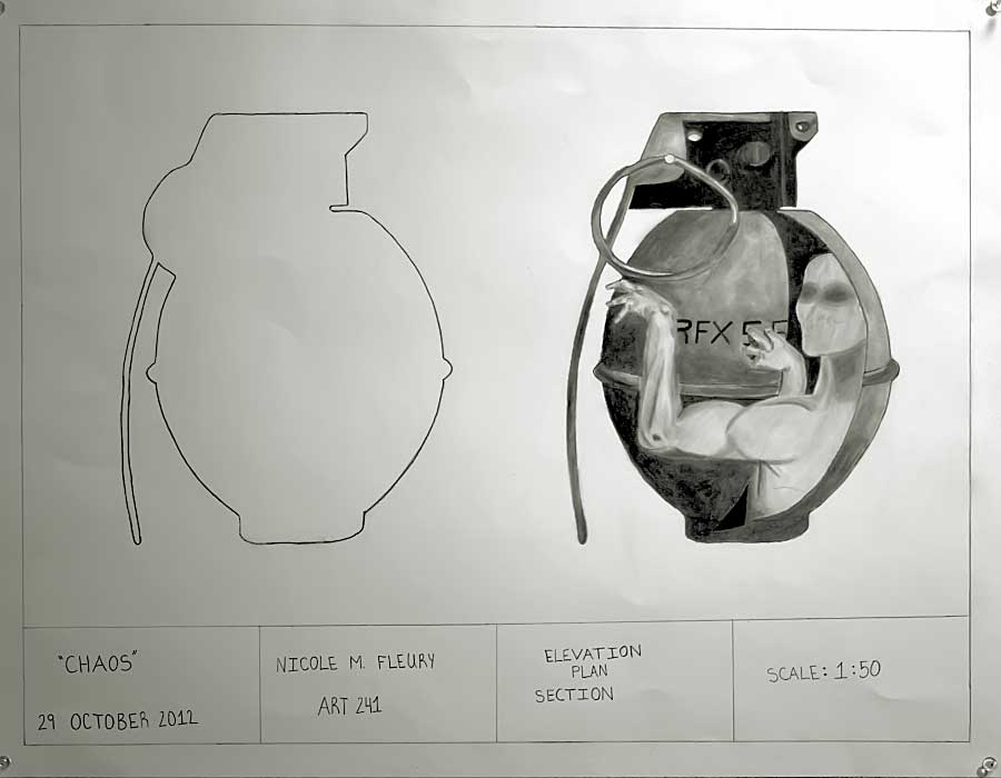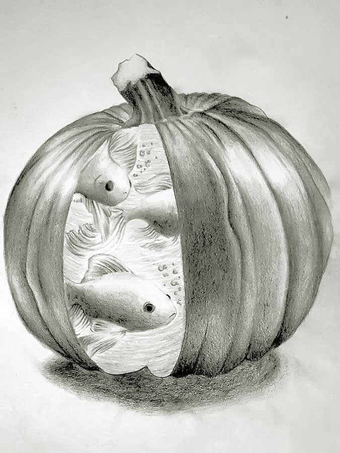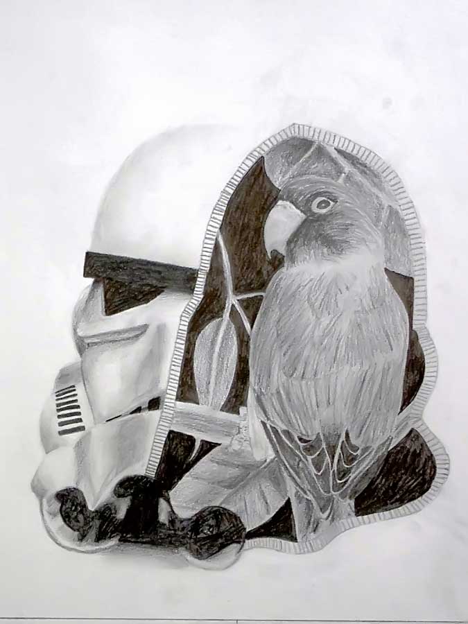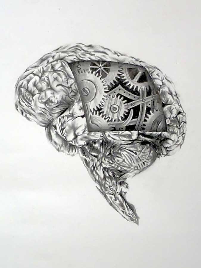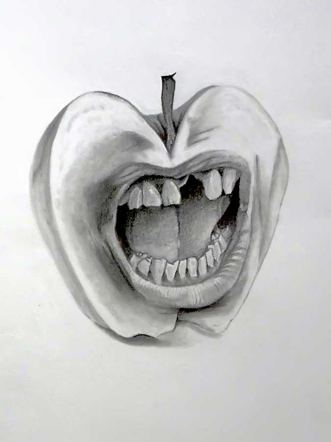 Next, draw a naturalistic image of the second object INSIDE the first object. Using our example above, it should appear as though an orange has a clockwork interior instead of the fruit-flesh that would normally be there. This part of your drawing should depict a full range of values from white to black, as well as many shades of grey.