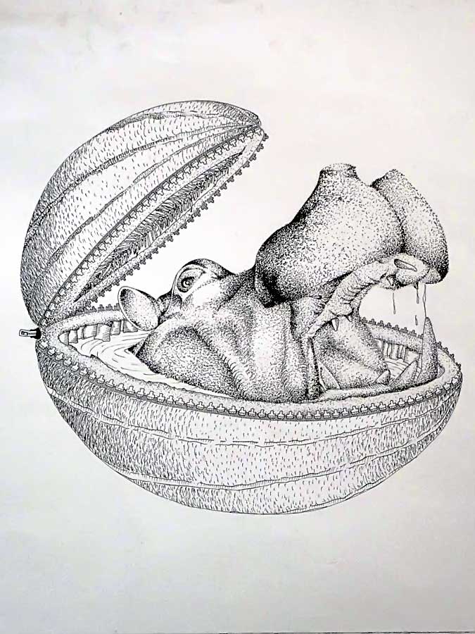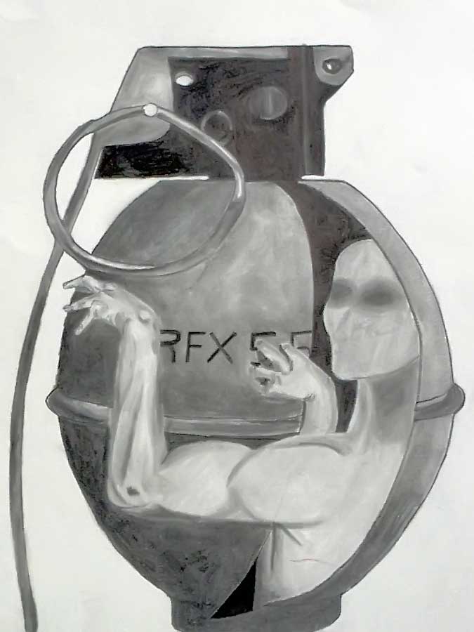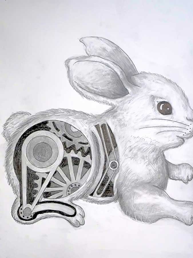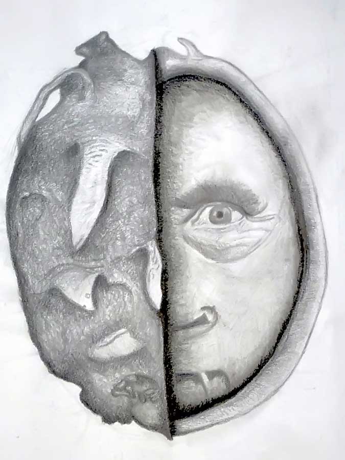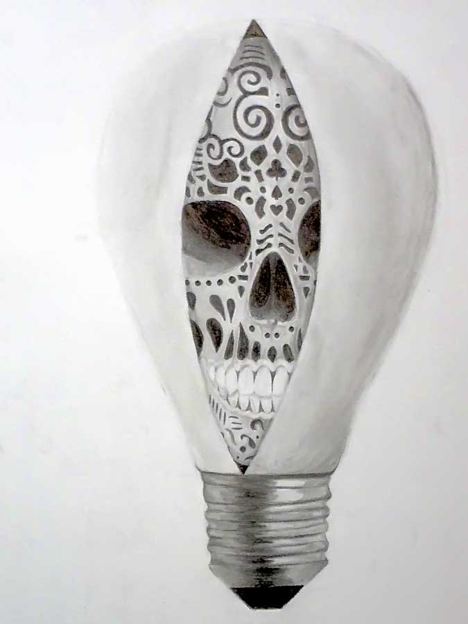 Next, draw a naturalistic image of the second object INSIDE the first object. Using our example above, it should appear as though an orange has a clockwork interior instead of the fruit-flesh that would normally be there. This part of your drawing should depict a full range of values from white to black, as well as many shades of grey.