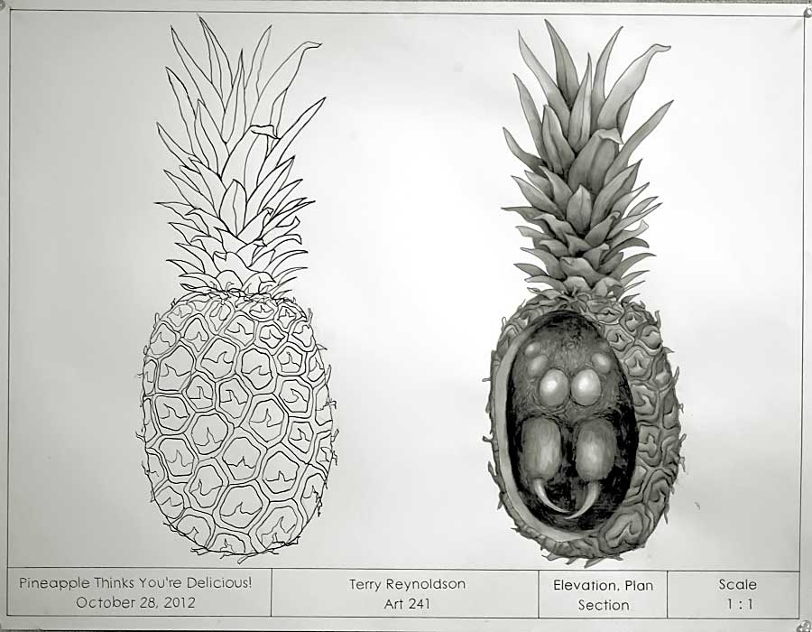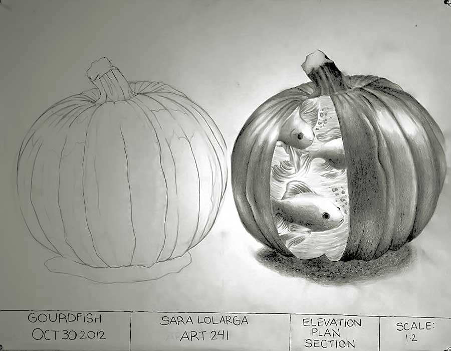 Next, using a hard graphite pencil, draw ONLY THE OUTLINE of the first object on the left half of the sheet. Cut your object in two (or imagine it cut in two) and then, on the right half of the sheet, draw your object's outer surface naturalistically (be sure to use a full range of values). DO NOT DRAW THE OBJECT'S INTERIOR YET. If you prefer, you may wait to add values to the object's outer surface until after you've completed the interior (this may minimize smudges).