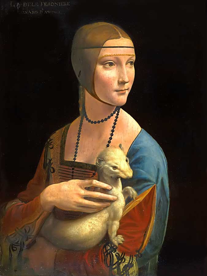 Notice on this image of Leonardo da Vinci's painting, Lady with an Ermine, how the individual features of the face connect to one another: each part of the face blends into the area around it so that there is a seamless continuity of surfaces. The bottom lip, for instance, is merely suggested by the addition of a bit of shadow between the chin and the mouth. The lower lip itself is a slight bit redder, which translates to a half shade darker than the surrounding area in a monochromatic composition. This is generally true for most portraits (especially when a female is depicted), but not always.