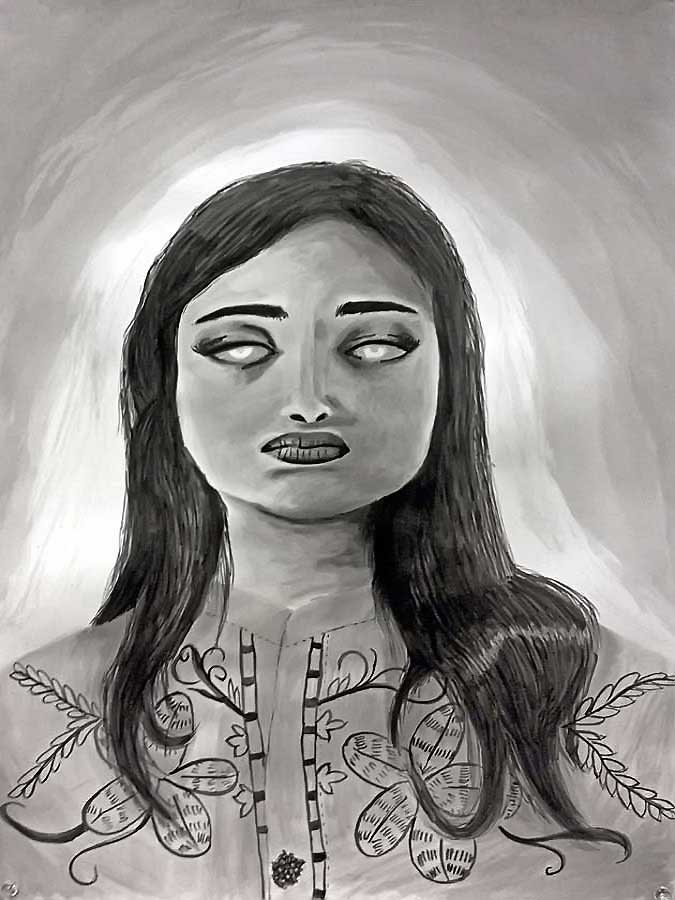 Step 5: When you've finished the head, shoulders, hair and upper torso, you can tackle the background. Darkening the area behind your subject will add volume to the figure, making the space look more naturalistic. A darker background always seems to push the lighter values forward, thereby creating a deeper and more convincing sense of space beyond the picture plane.