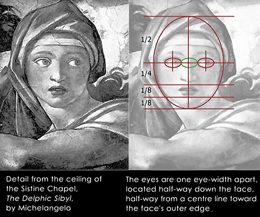 If we now examine a detail of Michelangelo's painting, The Delphic Sibyl (from the Sistine Chapel ceiling), we see a more naturalistic depiction of the human face. If we divide that face horizontally and vertically into four equal quadrants, we can see that the eyes are located in the middle of the face and at a midway point from the centre line to the outer edge of the face. Dividing the lower half of the face further (until we have a quarter and then two-eighths), we can see where the nose, mouth and chin are located. Notice also that the eyes, nose and mouth occupy approximately half of the entire face. There appears to be tremendous structure and symmetry in how the face is constructed.