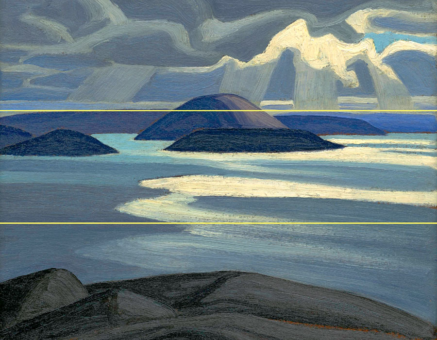 Here, we arrive at the "Rule of Thirds". In a landscape, like the sketch of Lake Superior by Lawren Harris (see the image above), the Rule of Thirds can be used to organize space. The horizon-line would then be located one third from the top or the bottom of the composition, depending on the desired proportions of the foreground, the mid-ground and the background (or, more simply, the balance between land and sky).