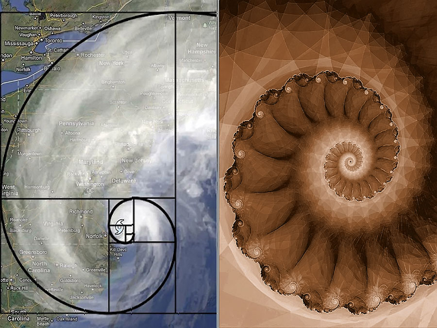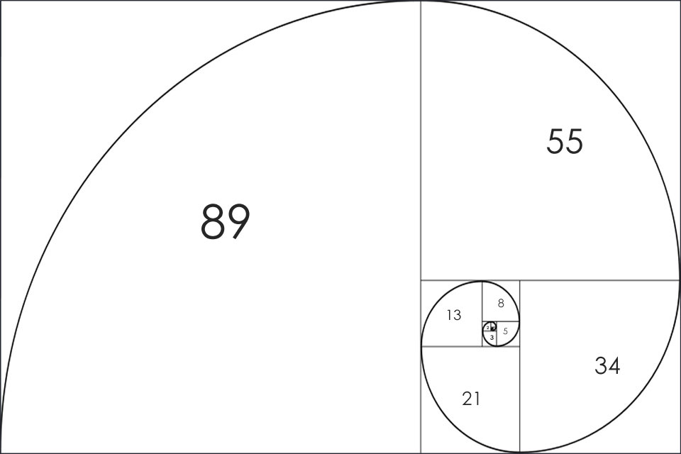 Let's take a moment to play with numbers and shapes... If we begin with a rectangle and then divide it into ever-smaller squares, we find that a spiral will intersect all of those squares at opposite corners (see the illustration below).
