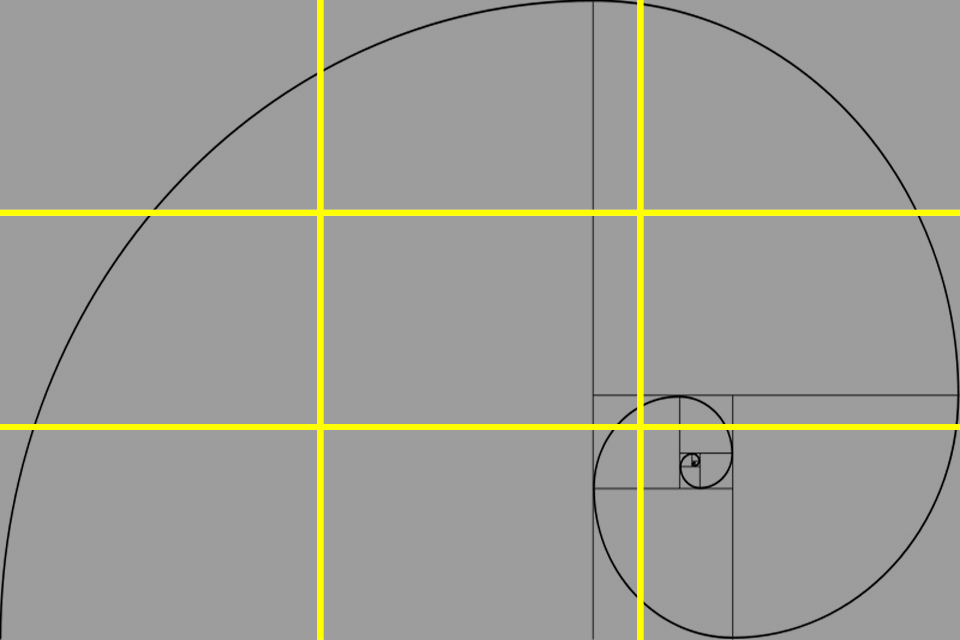 Returning to our spiral and squares, if we now overlay a grid on top of the spiral, we discover that no matter which way we flip it, the tightest part of a spiral will always coincide with a 2 x 3 grid at intersections of one third by one third (up or down, left or right). A prime location for placing the focus of a composition is located at any of these four intersections, which are called "sweet spots", "power points" or "crash points".