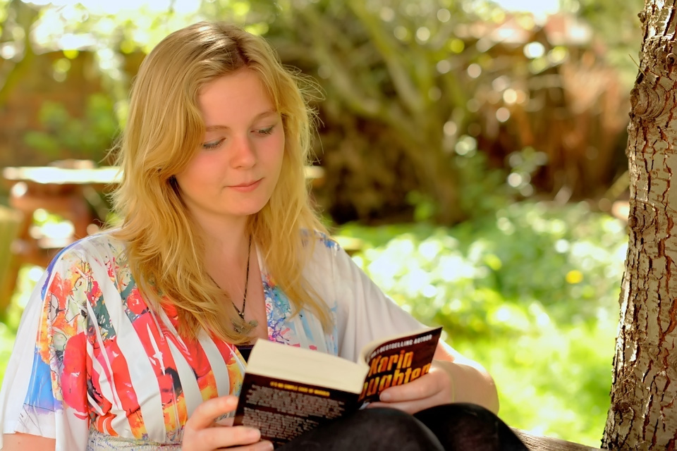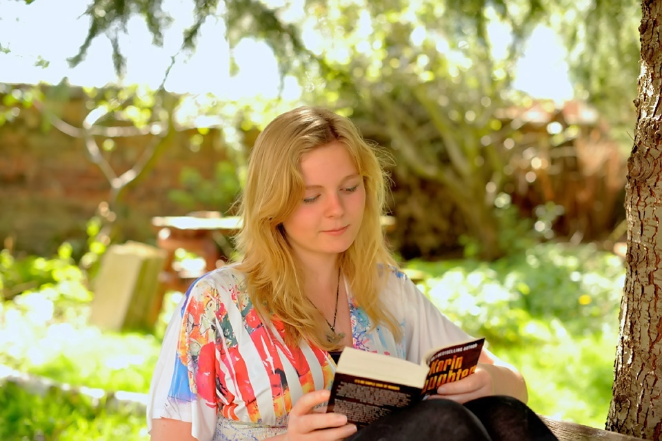 In the last image, the reader's face occupies the upper left sweet spot, thereby creating a composition that doesn't trap the viewer's gaze. Sweet spots are an effective tool for facilitating movement, which feels natural and aesthetically pleasing. Take a moment to click on this image and then click the arrow (on the right-hand side of the image) to compare it to the first photograph on this page.