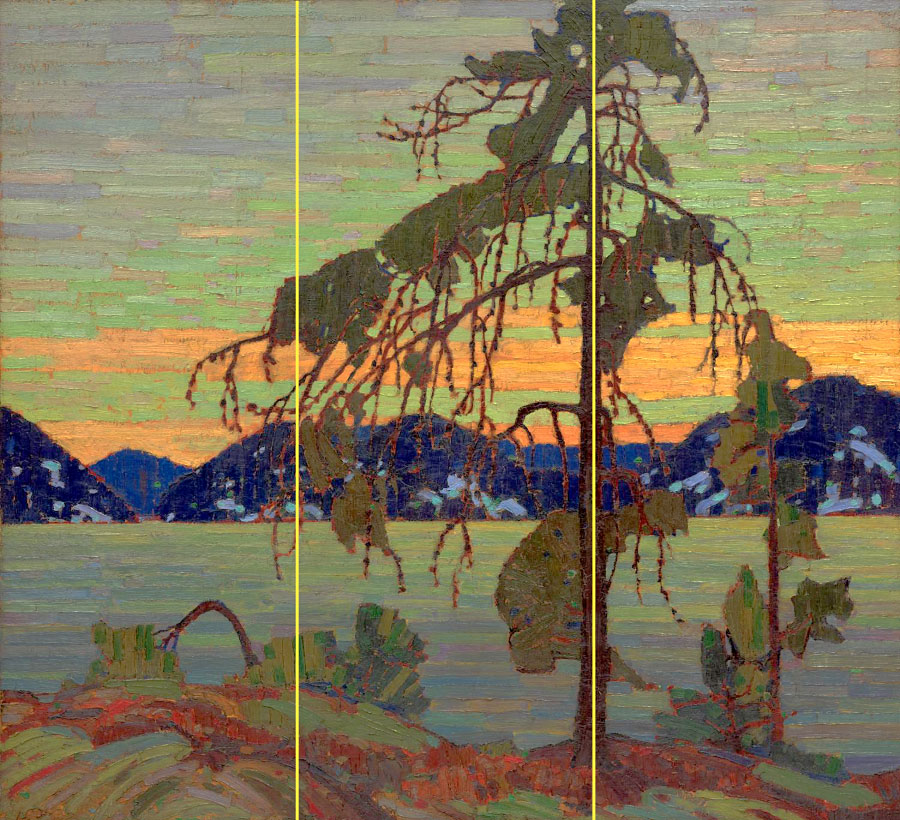 An artist may also use the Rule of Thirds to position vertical elements in a composition, as Tom Thomson seems to have done with the foreground tree-like shapes in his beautifully atmospheric painting titled, The Jack Pine.
