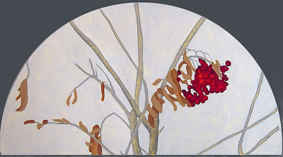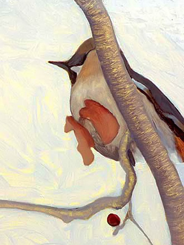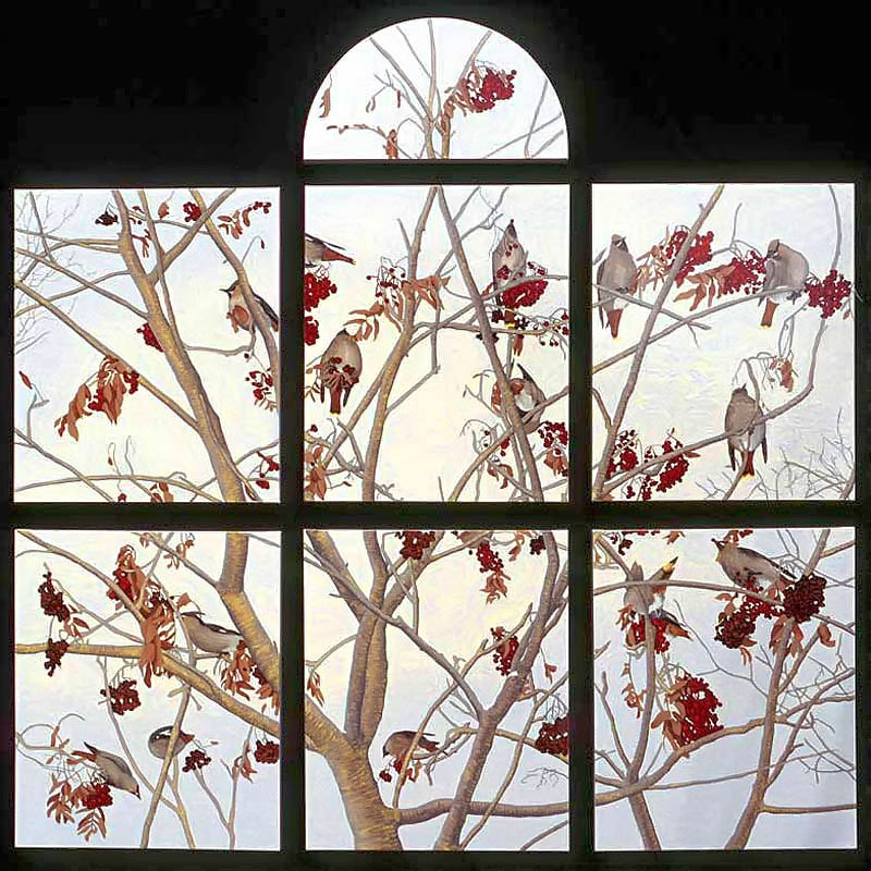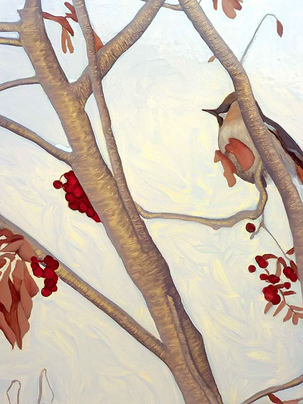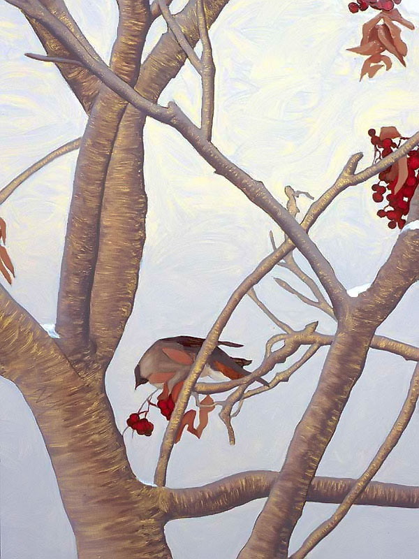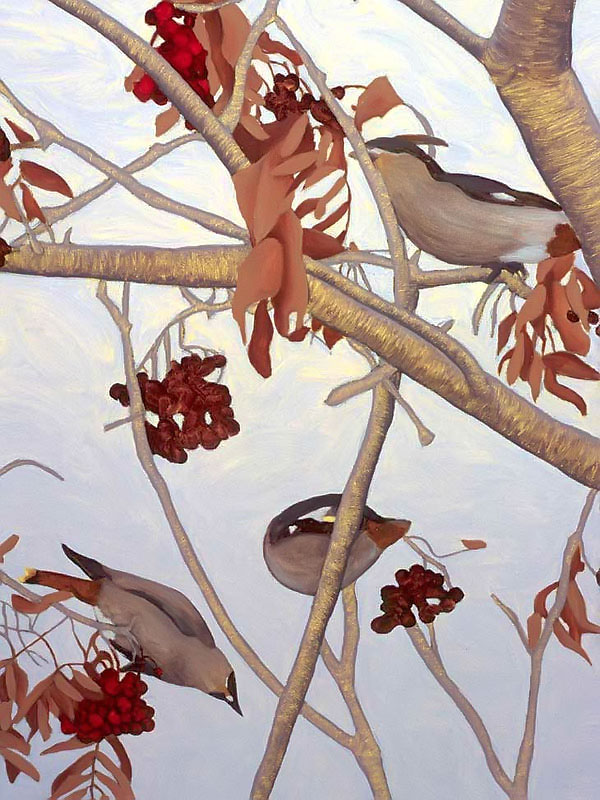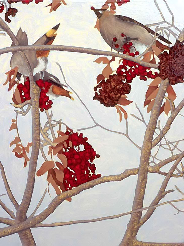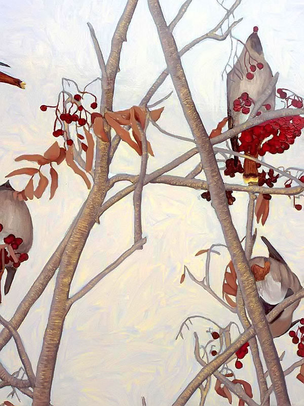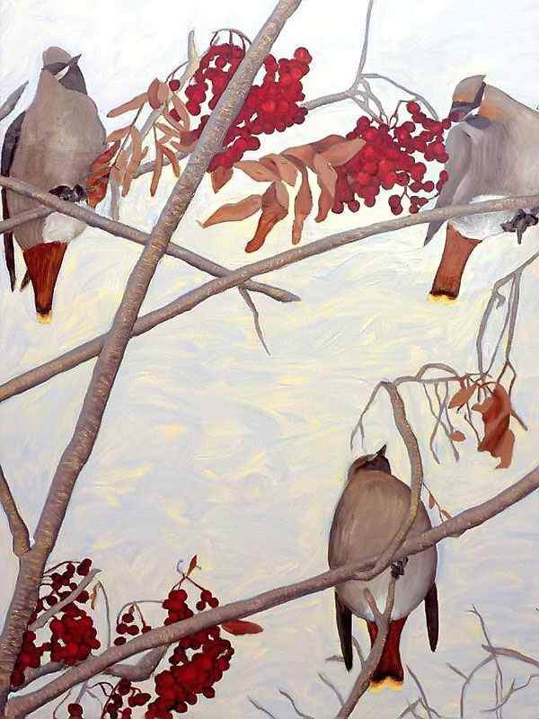 The multi-part painting that depicts birds is based on an incident that happened one winter when dozens of noisy bohemian wax wings descended like a ravenous, marauding horde and proceeded to strip the berries from a mountain ash tree in my back yard. The noise was eerie, like a scene from a Hitchcock movie!