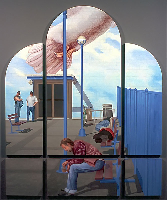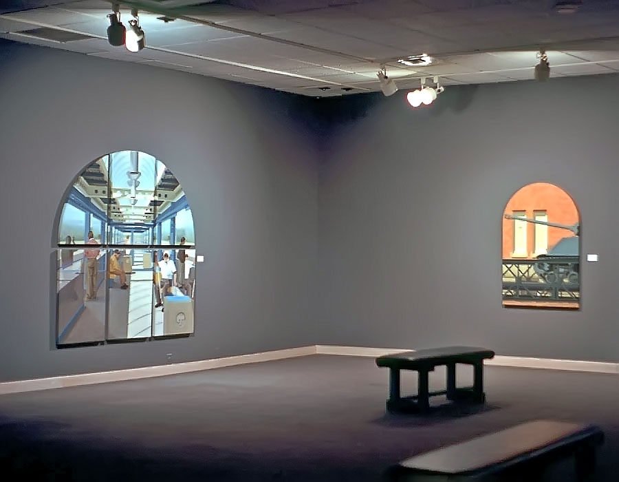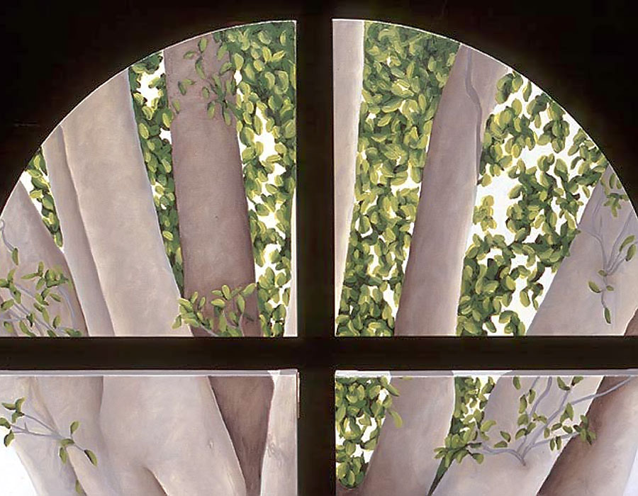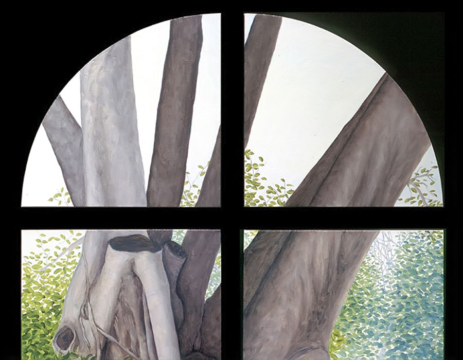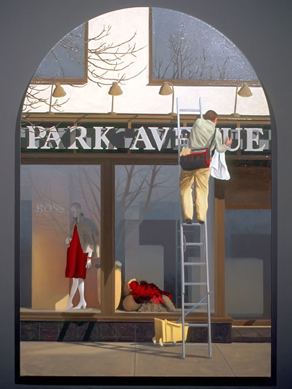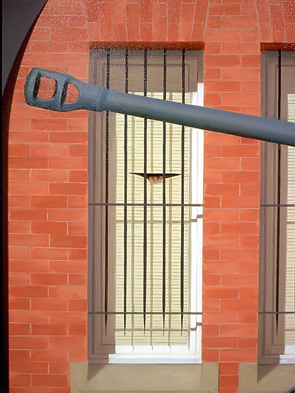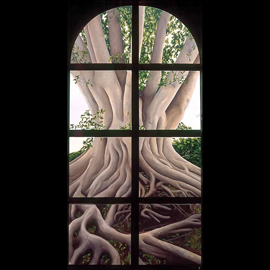 I believe windows are a metaphor for separation and isolation in our post-modern society. The act of gazing through a window is a mediated, almost virtual way of relating to the world. The view is framed (contextualized) by the definitive edges of a casement and panes which may themselves be distorted or dirty. A window, especially one with many sections, forces us to reconstruct reality by piecing together smaller fragments until a larger picture emerges. This view, however, is always cropped and changing. If we could only stop time to create a reflective space for questions to arise, we would find many incongruities in the urban tableau before us. After some reflection, we might discover our place in the grand scheme of things. Or, perhaps we might find that alienation is an inescapable part of being human; a condition of being that goes all the way back to when we first left The Garden. My recent paintings are an attempt to provide such a reflective space.