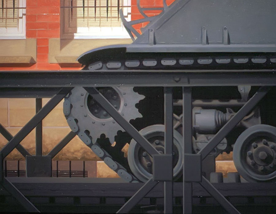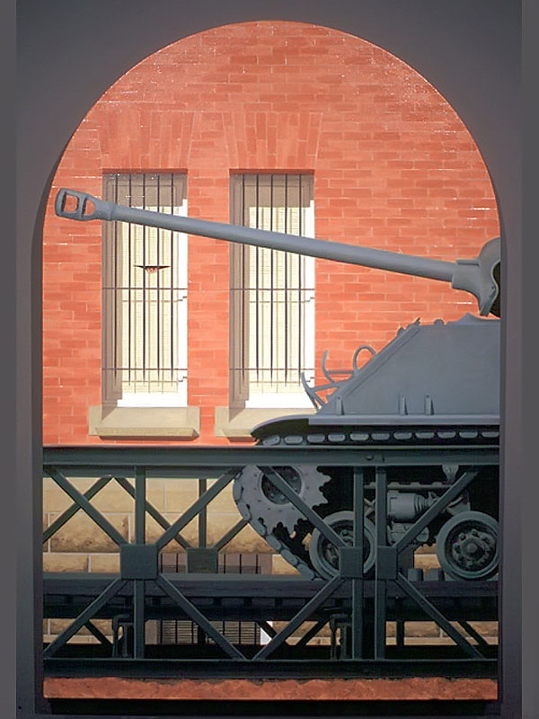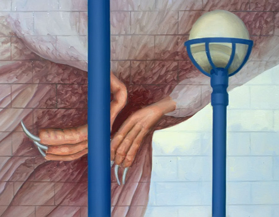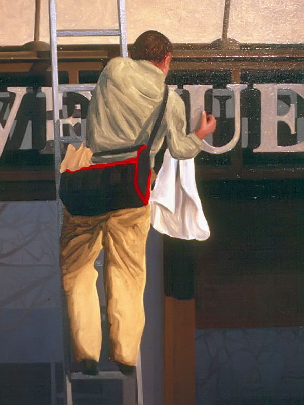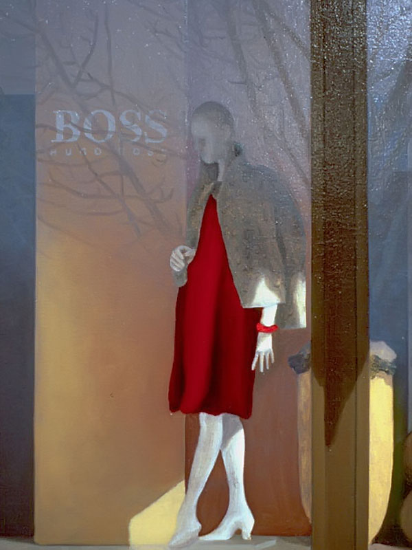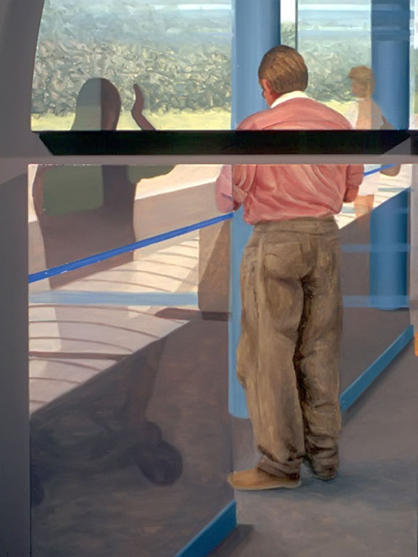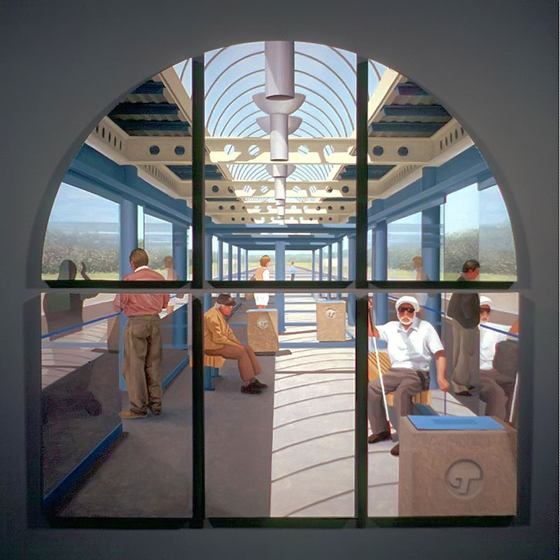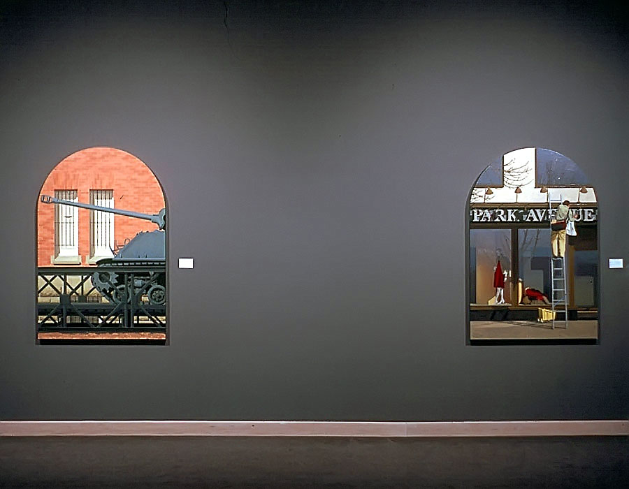 I believe windows are a metaphor for separation and isolation in our post-modern society. The act of gazing through a window is a mediated, almost virtual way of relating to the world. The view is framed (contextualized) by the definitive edges of a casement and panes which may themselves be distorted or dirty. A window, especially one with many sections, forces us to reconstruct reality by piecing together smaller fragments until a larger picture emerges. This view, however, is always cropped and changing. If we could only stop time to create a reflective space for questions to arise, we would find many incongruities in the urban tableau before us. After some reflection, we might discover our place in the grand scheme of things. Or, perhaps we might find that alienation is an inescapable part of being human; a condition of being that goes all the way back to when we first left The Garden. My recent paintings are an attempt to provide such a reflective space.
