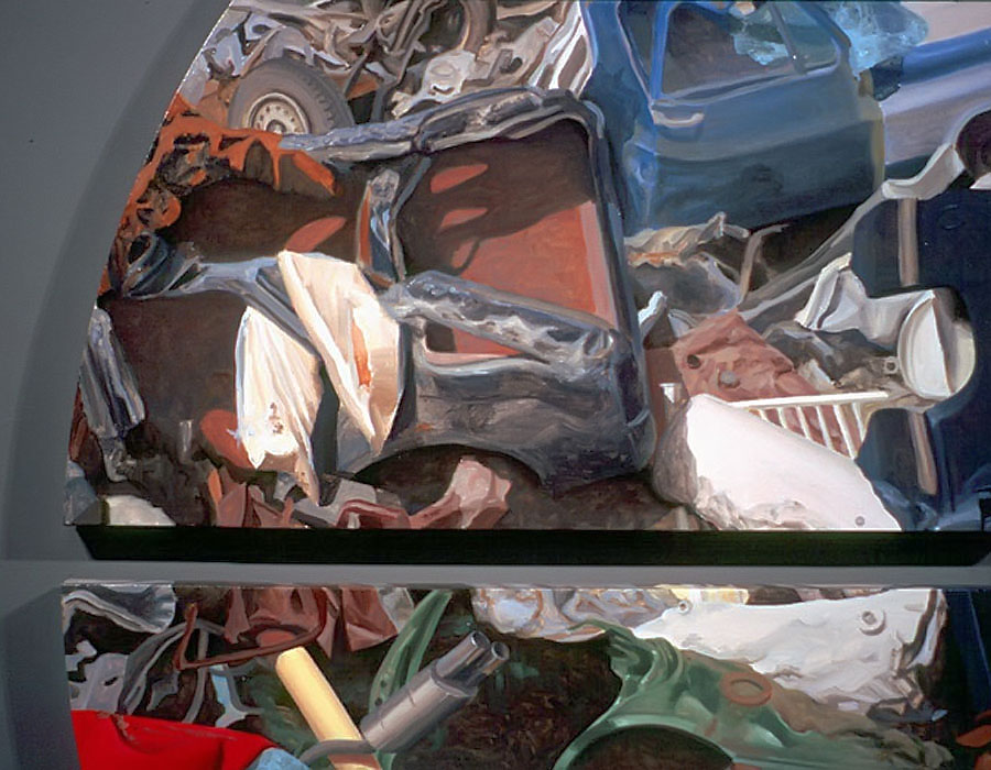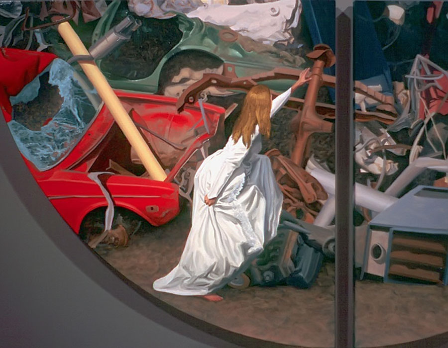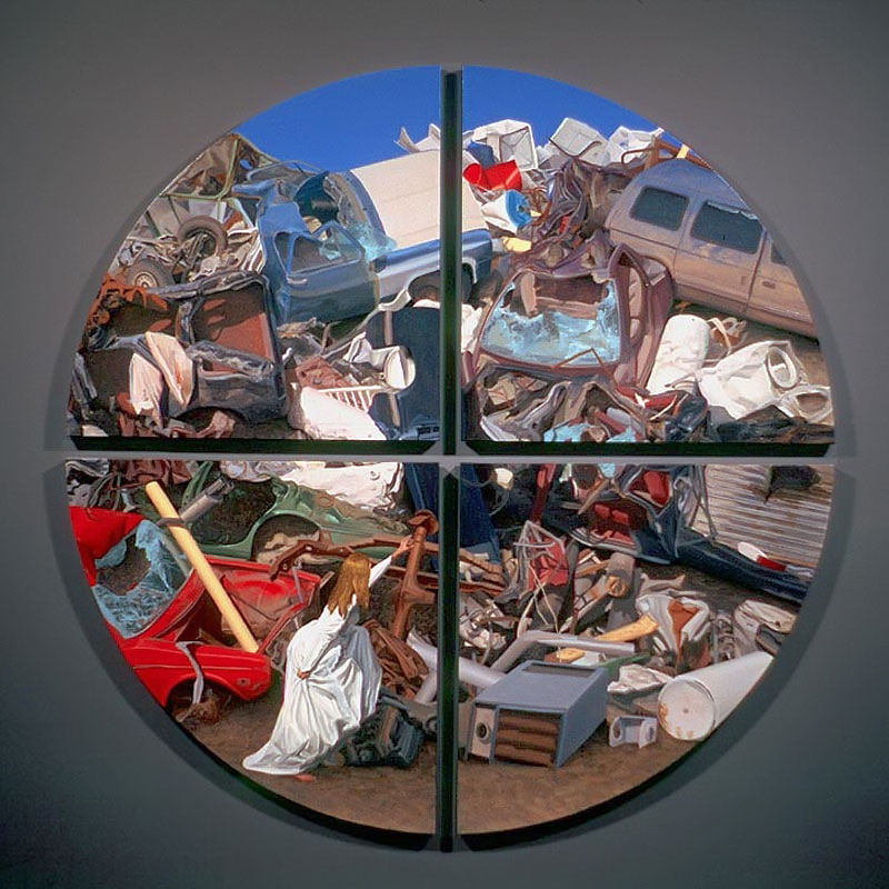 There's an interesting side note about this body of works. In 2007, only a week into the very first showing of these paintings in an exhibit titled, Windows, the art gallery collapsed! The excessive weight of freshly fallen snow caused the roof of the Prairie Art Gallery in Grande Prairie, Alberta to fall into their main exhibit space, the very same space that housed my paintings. Thanks to the quick thinking of gallery director, Robert Steven, the paintings were moved to a different room only minutes before the roof caved in. My paintings then spent ten days surrounded by snow and sub-zero temperatures while officials devised a plan to enter the faltering structure and rescue the artworks. For a while, they considered abandoning everything in the building and tearing it all down with a bulldozer! I couldn't help but wonder if I had somehow offended You-Know-Who with the many biblical themes in my paintings. (Click this link to read the whole story.)