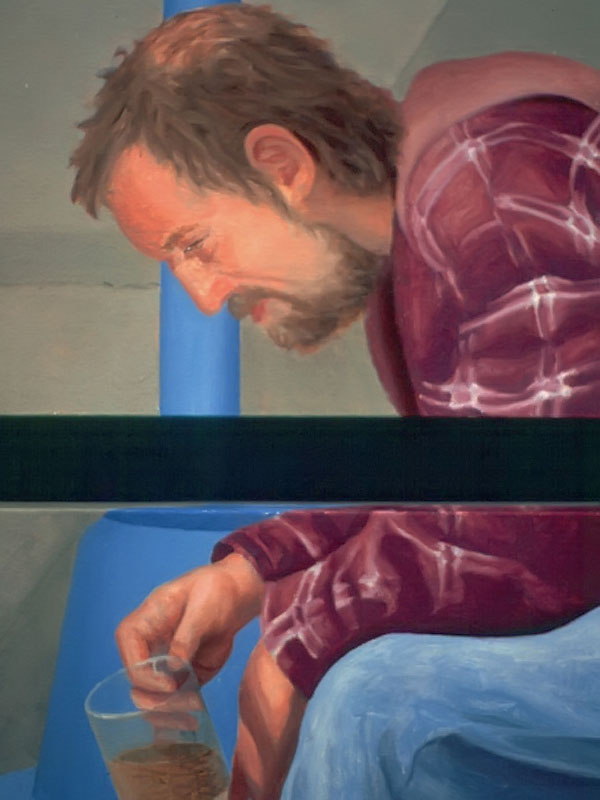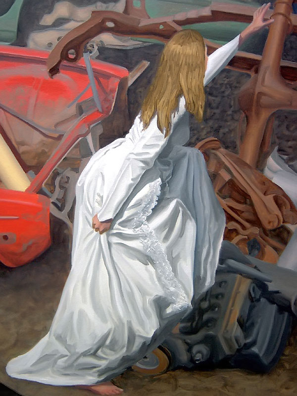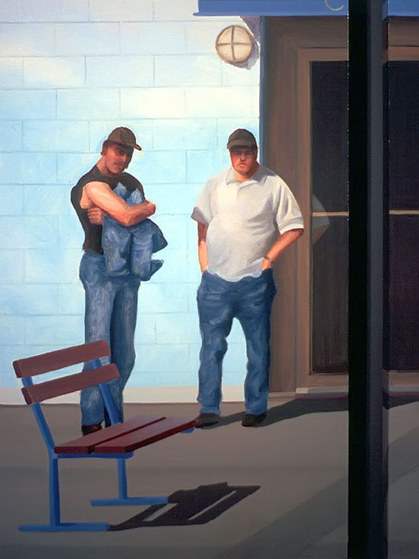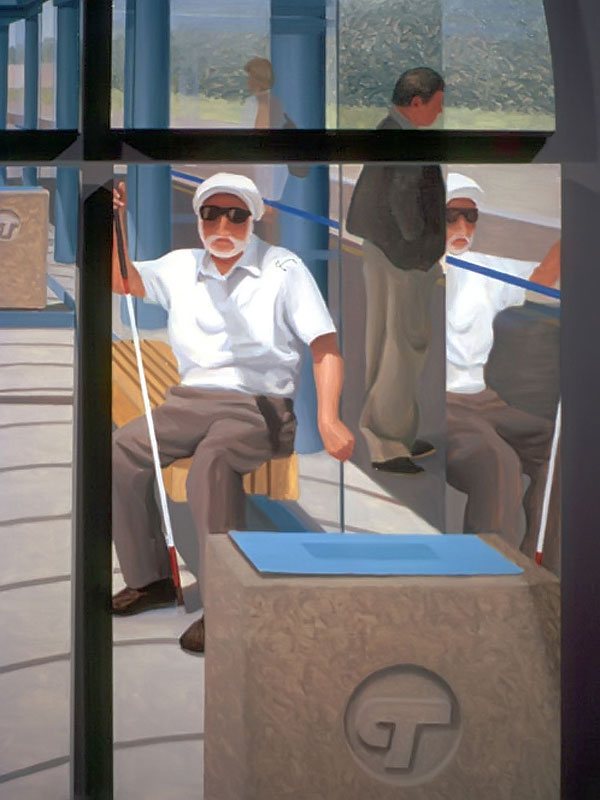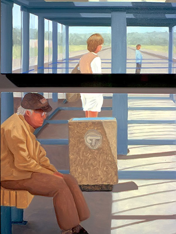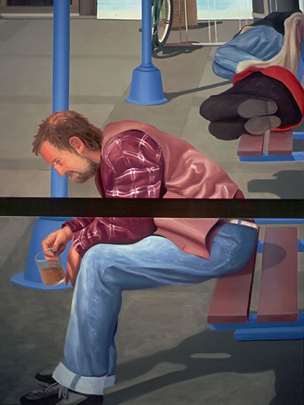 The deeper meaning of this body of work resides in the biblical titles that I've given each painting. Adam, the first man, sits with coffee mug in hand, suffering the indignities of one who no longer has a home. Eve, the first woman (not counting Lilith), is dressed in her wedding gown. She strains and struggles to climb a mountain of discarded consumer products in a misguided attempt to obtain her heart's desire. Cain, their son, waits anxiously behind protective bars, bricks and blinds worried about the repercussions when the world discovers what he has done to his brother. Jacob, perched on his ladder beside a ghostly white angelic figure, grapples with the expectations of a culture that is based on consumption and acquisition. Job, a good man who has had everything taken from him without provocation, sits amidst others who also suffer in one way or another. Luck and good fortune seem as fickle and as fleeting as the bus for which they wait.