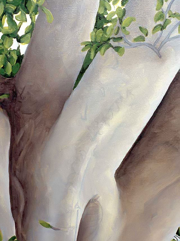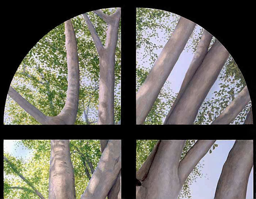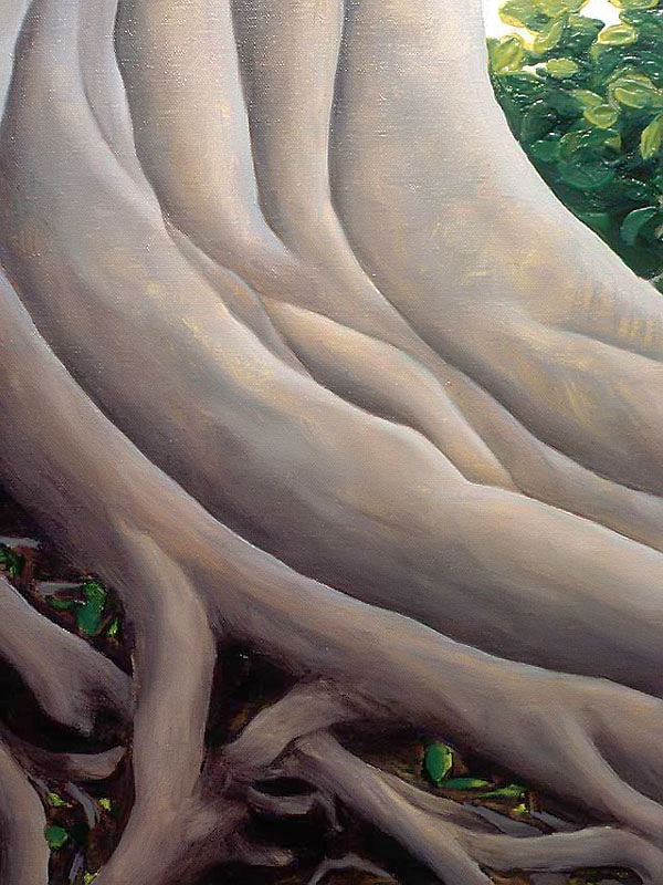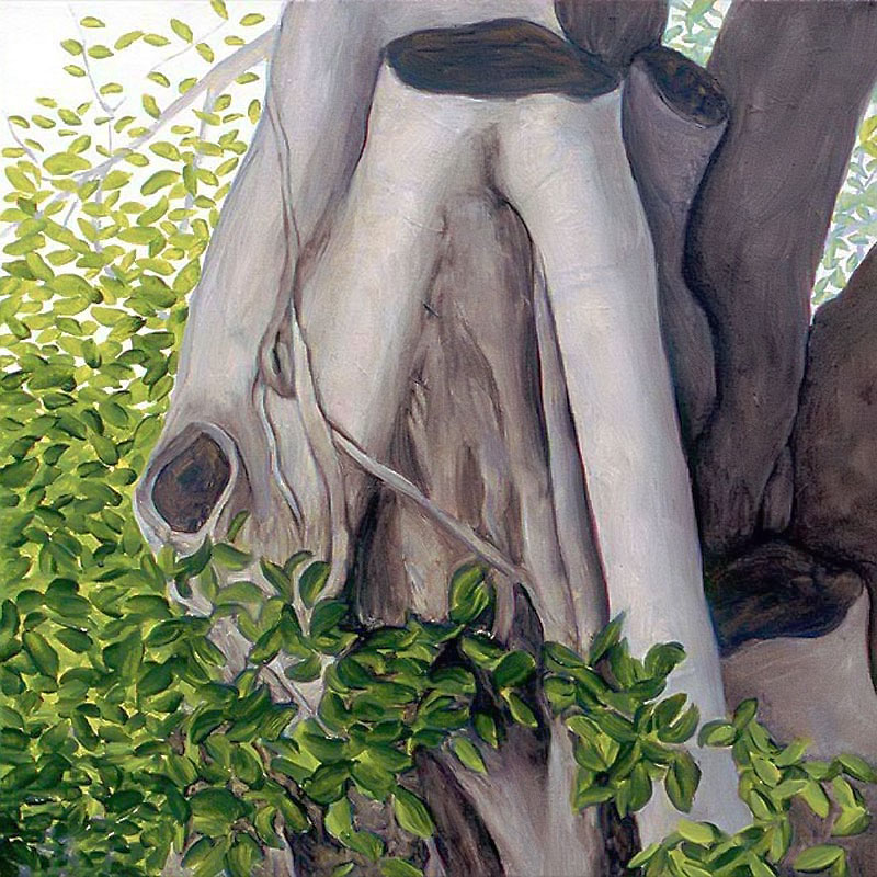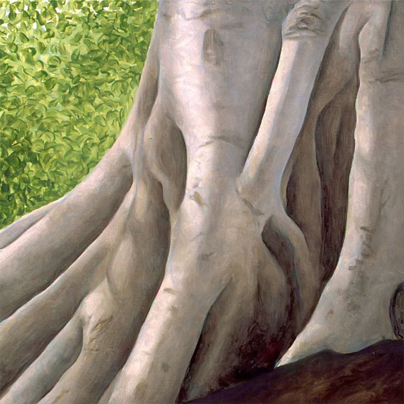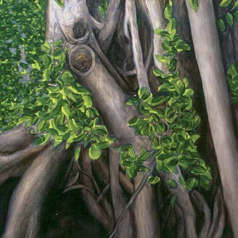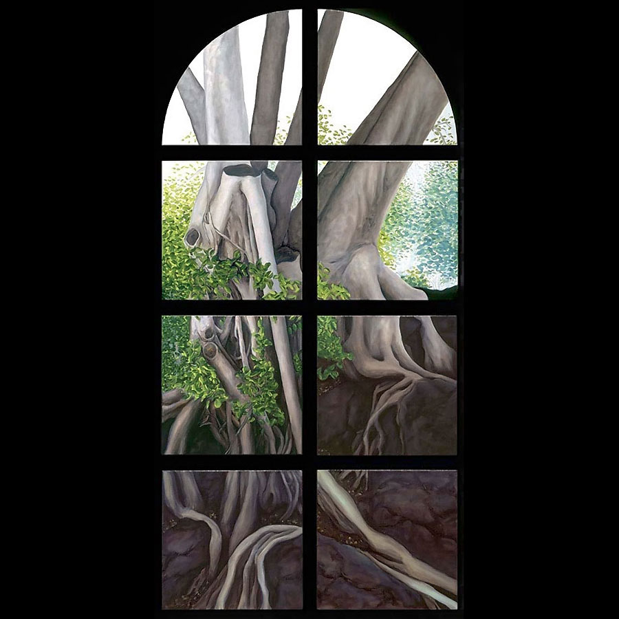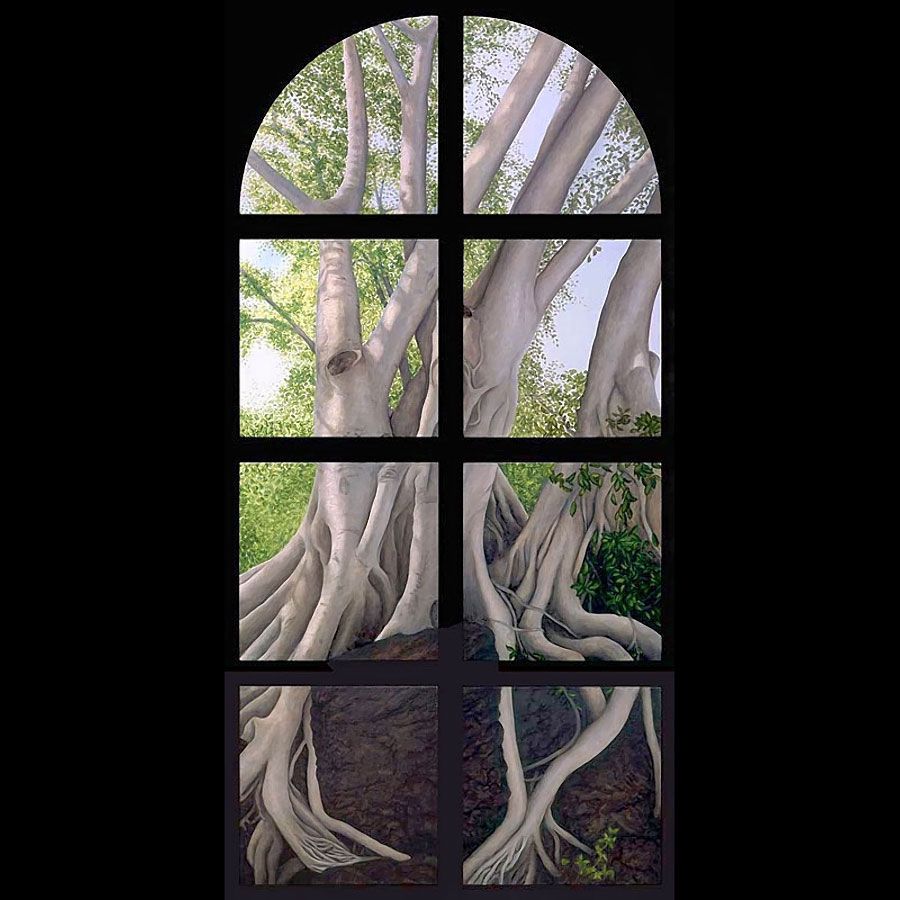 Other paintings depict realistic trees and have a similar biblical theme. In 2004 I attended a humanities conference in Waikiki, Hawaii and while walking through Ala Moana Beach Park, I saw the most amazing banyan trees with their branches cascading to the ground in sinuous, intertwining columns that seemed to epitomize the very concept of complexity. I took dozens of photos and immediately got to work when I arrived back in Calgary. The result was three, multiple-part paintings that represent banyan trees at different times of the day. Waikiki was so beautiful that it seemed to me like a contemporary Garden of Eden and so that was the title that I gave to each painting.