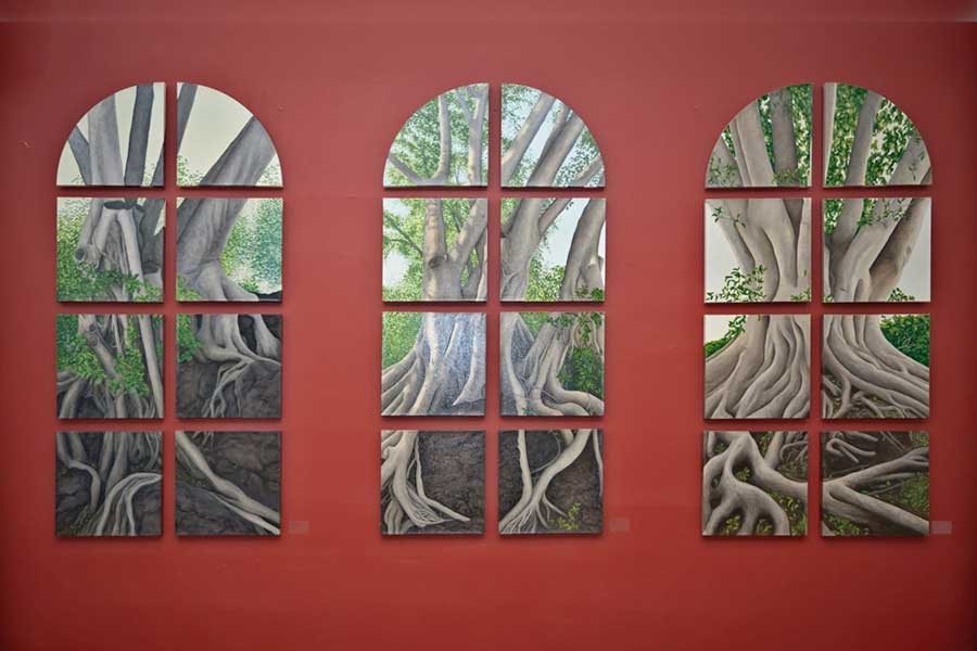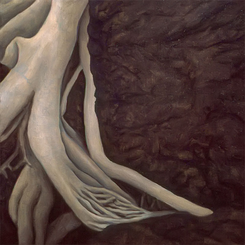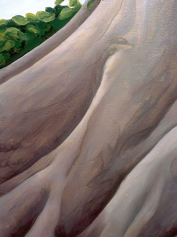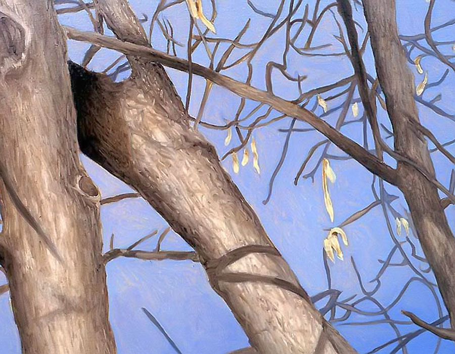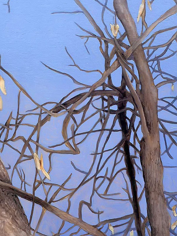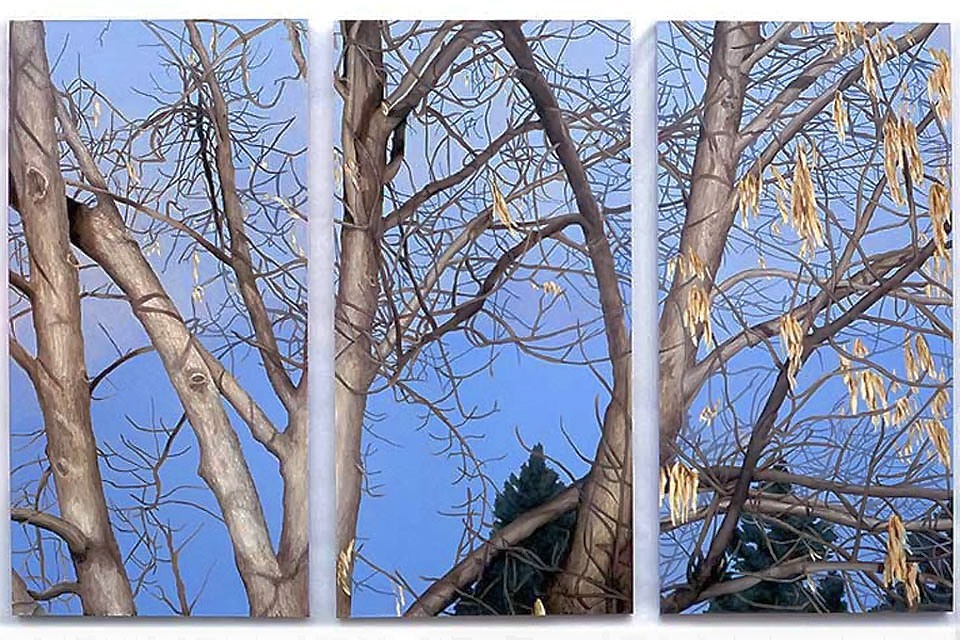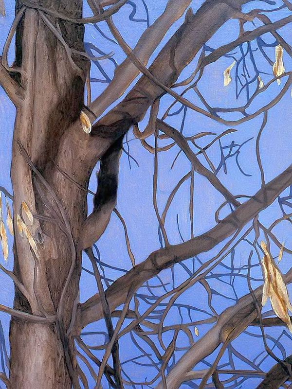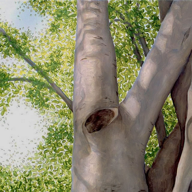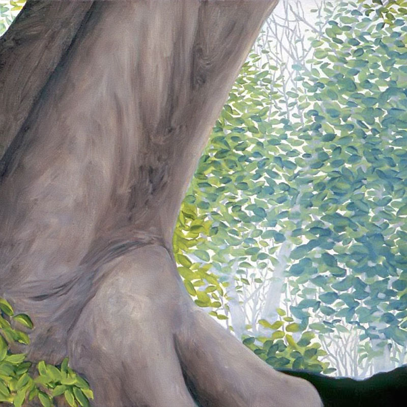 Other paintings depict realistic trees and have a similar biblical theme. In 2004 I attended a humanities conference in Waikiki, Hawaii and while walking through Ala Moana Beach Park, I saw the most amazing banyan trees with their branches cascading to the ground in sinuous, intertwining columns that seemed to epitomize the very concept of complexity. I took dozens of photos and immediately got to work when I arrived back in Calgary. The result was three, multiple-part paintings that represent banyan trees at different times of the day. Waikiki was so beautiful that it seemed to me like a contemporary Garden of Eden and so that was the title that I gave to each painting.