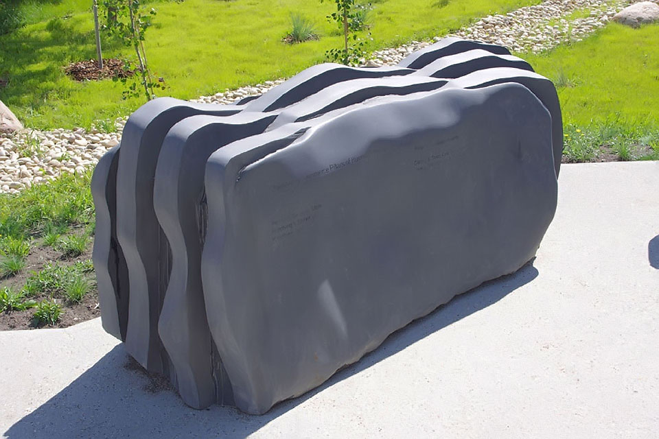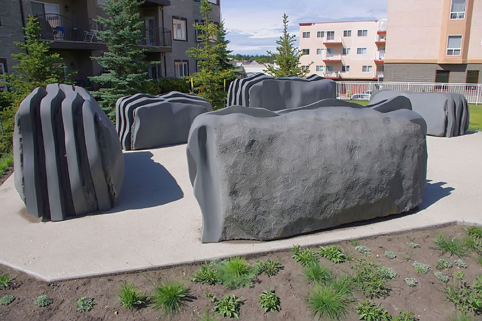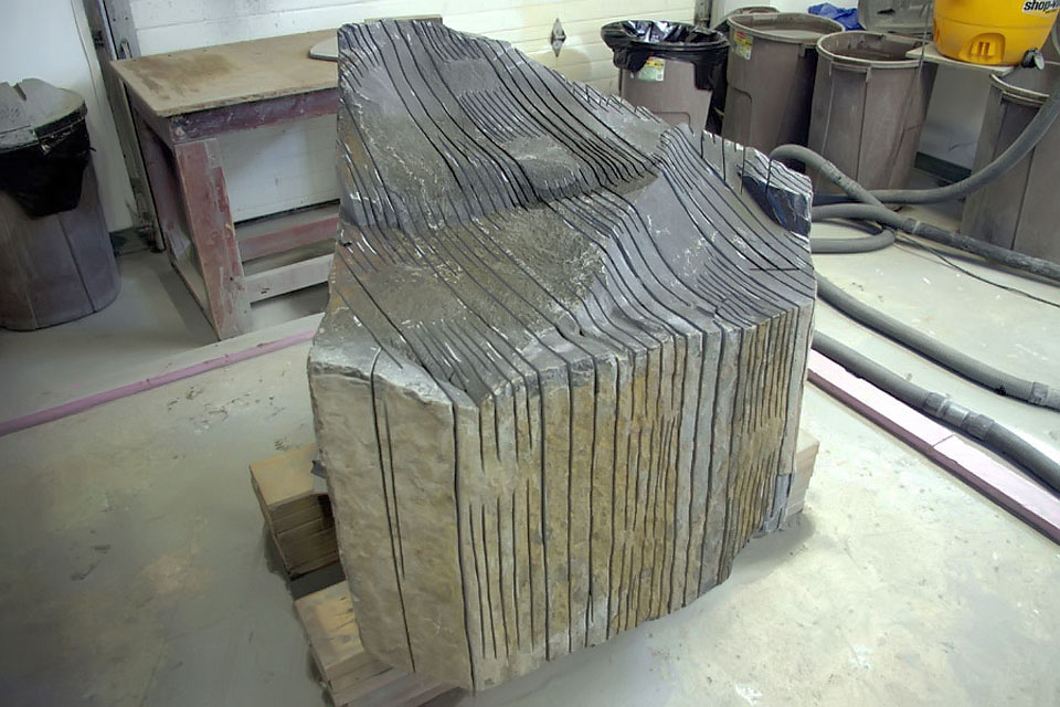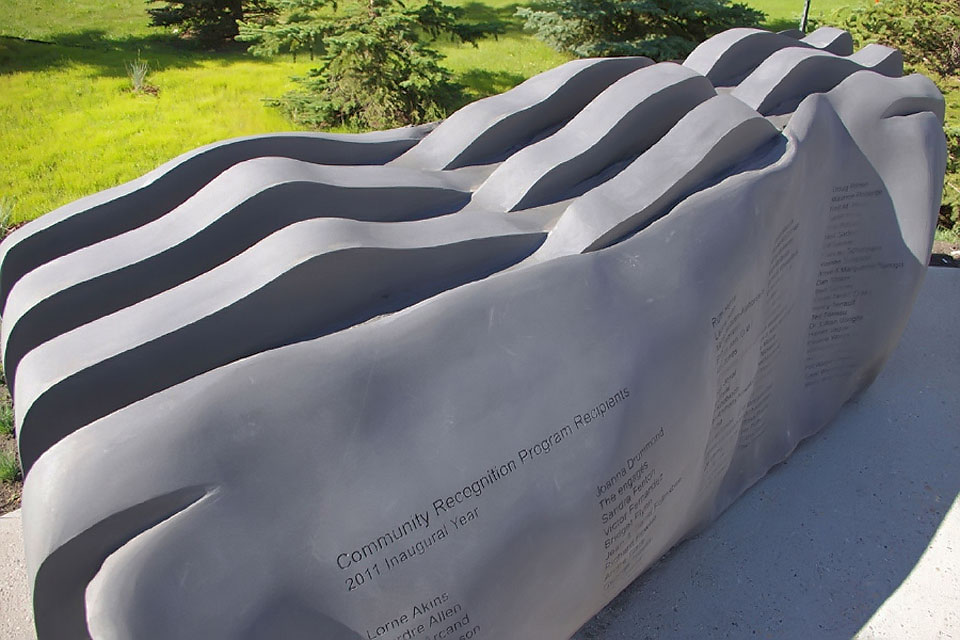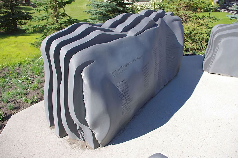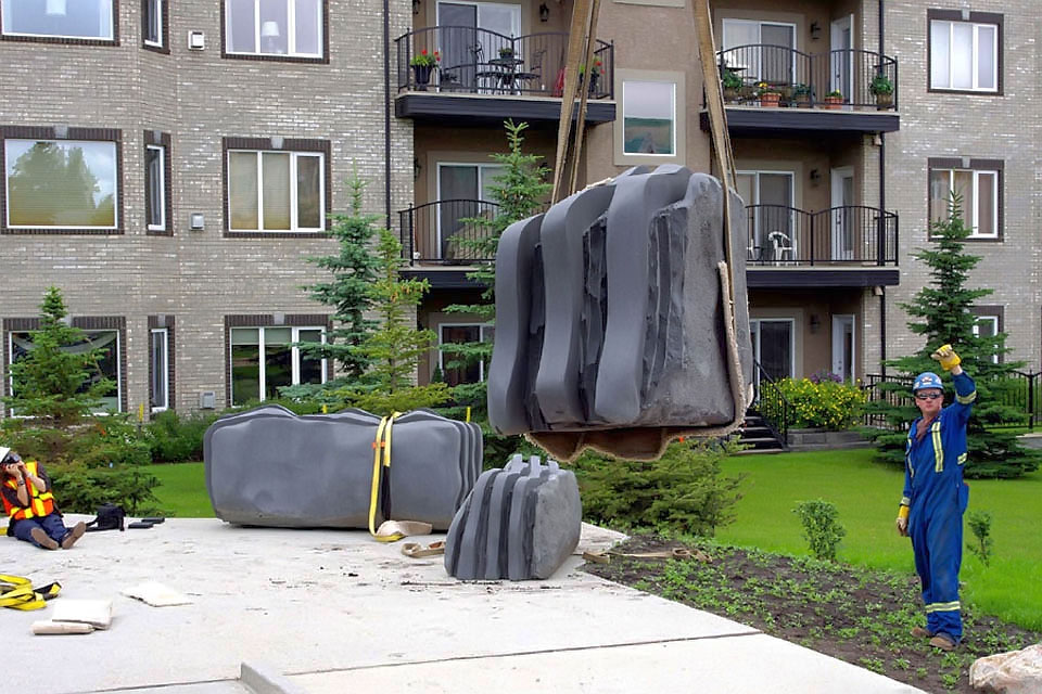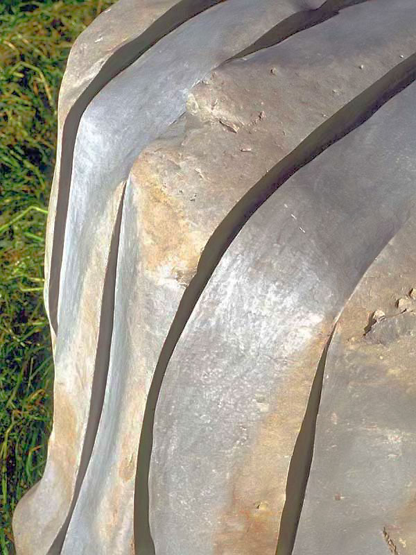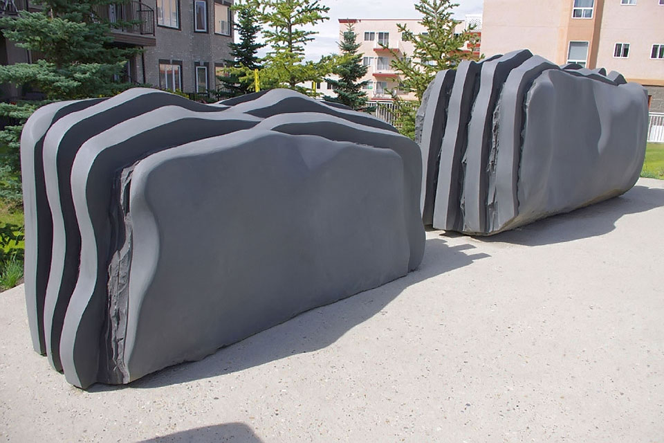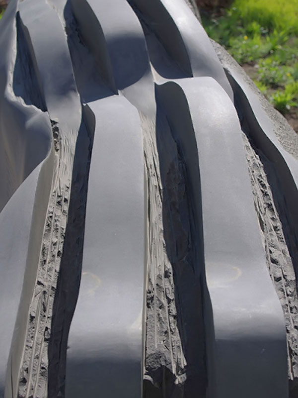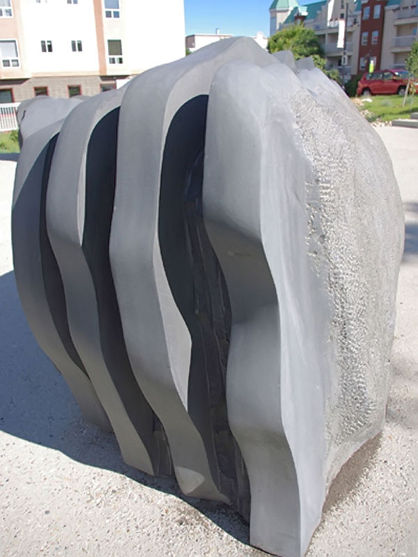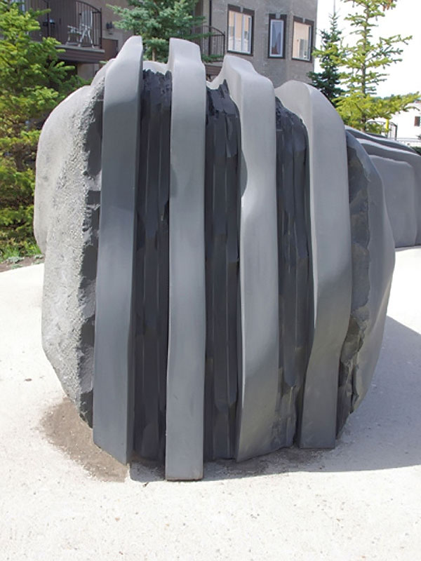 This project took ten months to complete. It was installed with a 120 ton crane in a park in St. Albert, Alberta, Canada in 2011. It consists of five carved basalt columns with a combined weight of 40,000 pounds (20 tons). The largest sculpture weighs 11,500 pounds (5.75 tons) and measures 40 inches high by 8 feet long by 32 inches in depth. Onto two of the sculptures, I carved 114 names of local businesses and individuals whose achievements have been recognized by the citizens of St. Albert. Over the next 25 years, approximately 300 more names will be added until each sculpture is filled. The wavy, displaced ribbons that I carved into each boulder suggest the motion of waves.