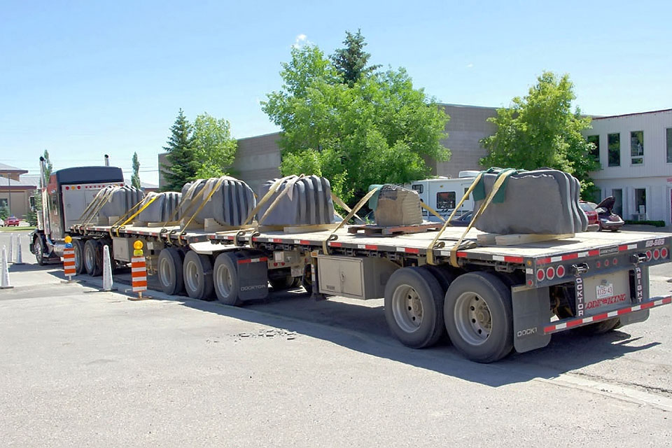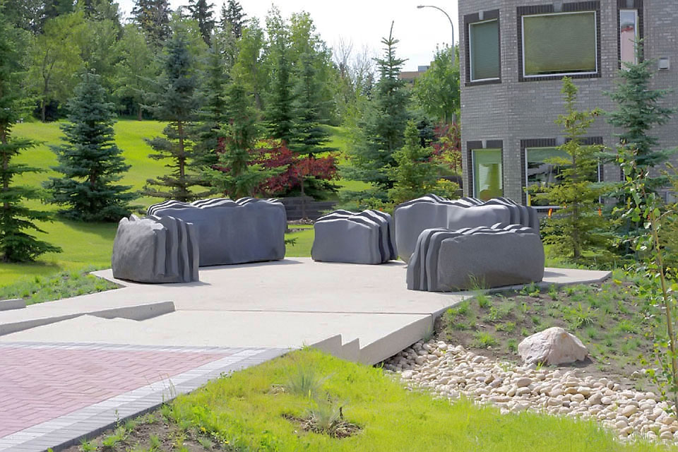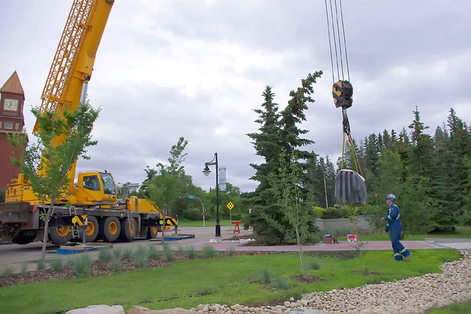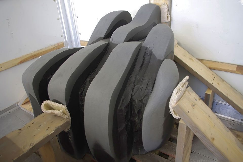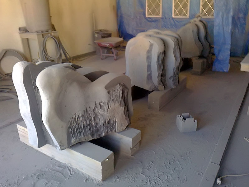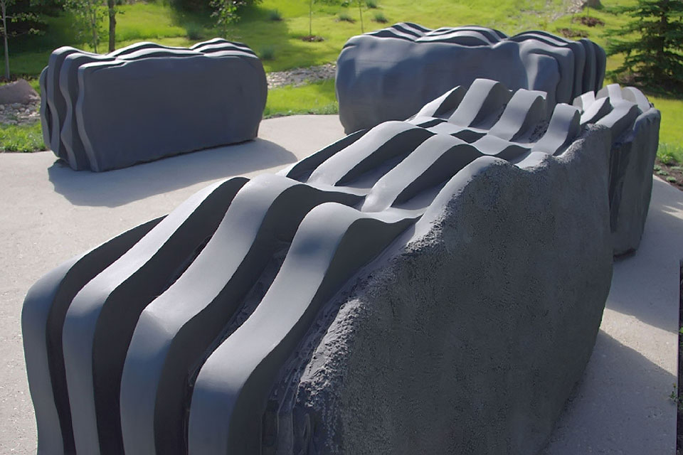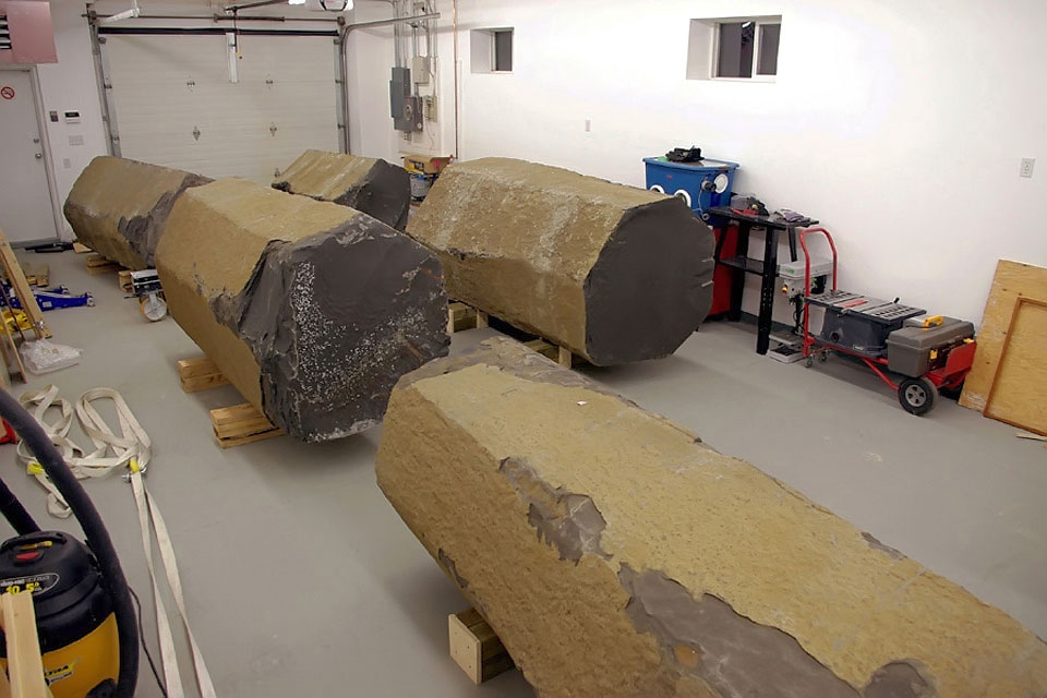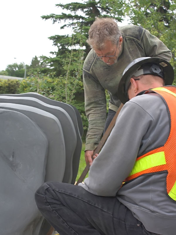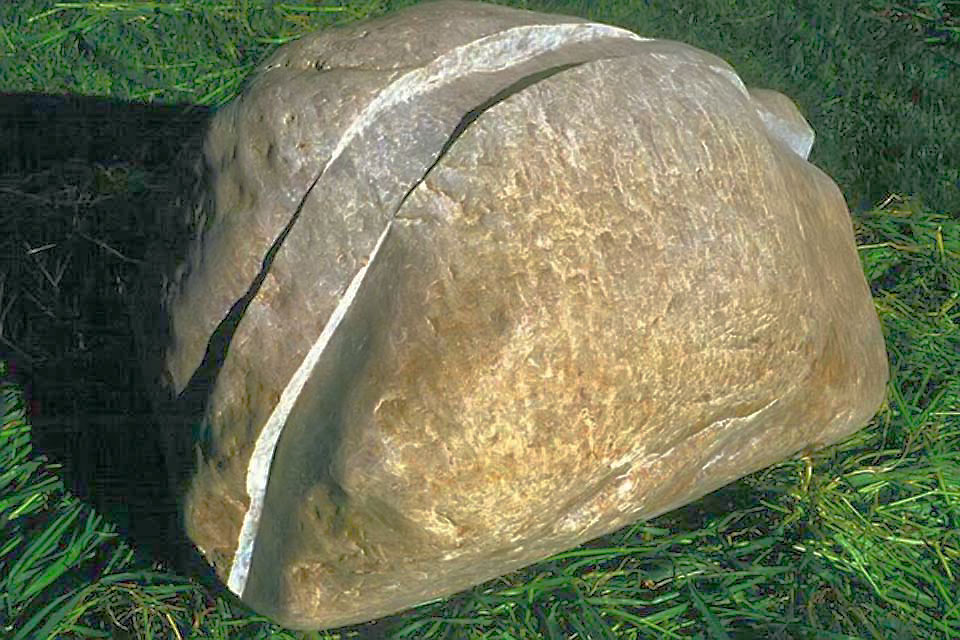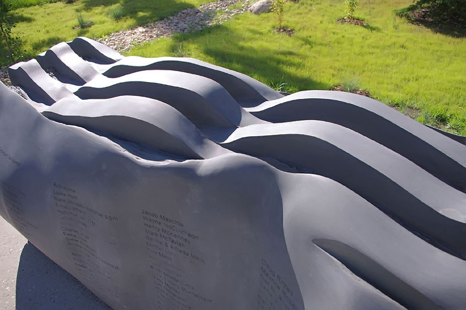 This project took ten months to complete. It was installed with a 120 ton crane in a park in St. Albert, Alberta, Canada in 2011. It consists of five carved basalt columns with a combined weight of 40,000 pounds (20 tons). The largest sculpture weighs 11,500 pounds (5.75 tons) and measures 40 inches high by 8 feet long by 32 inches in depth. Onto two of the sculptures, I carved 114 names of local businesses and individuals whose achievements have been recognized by the citizens of St. Albert. Over the next 25 years, approximately 300 more names will be added until each sculpture is filled. The wavy, displaced ribbons that I carved into each boulder suggest the motion of waves.