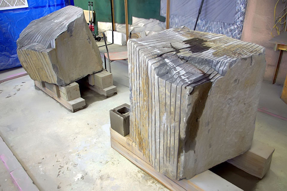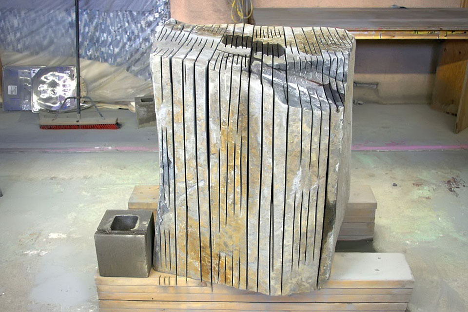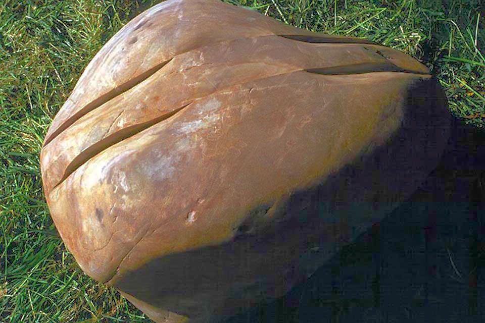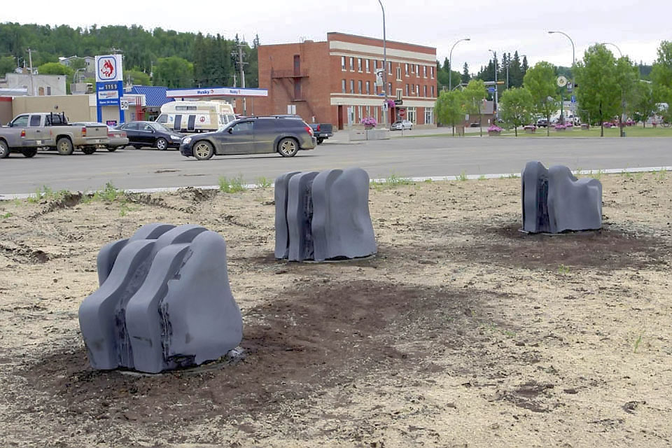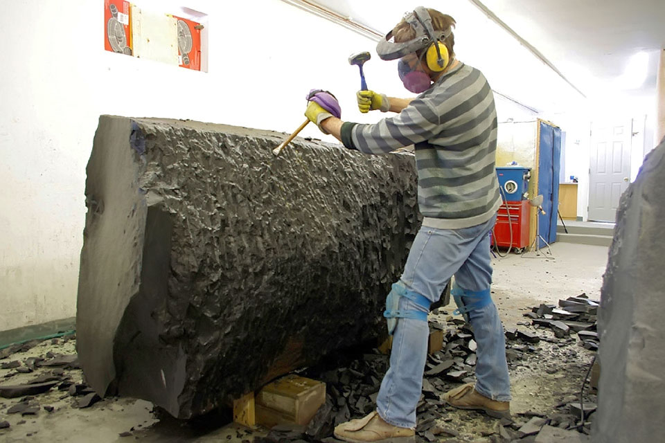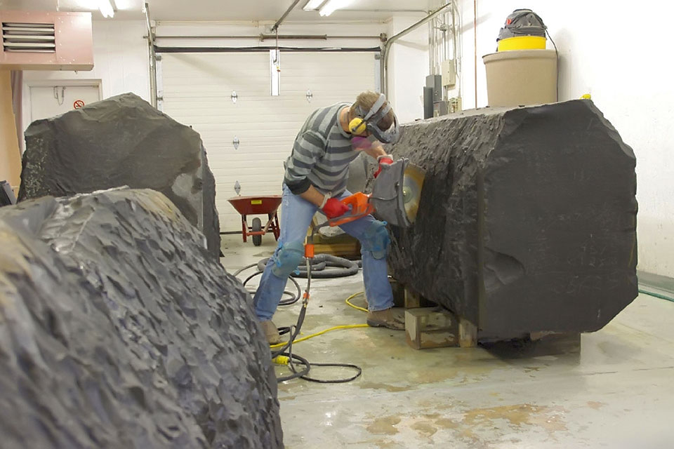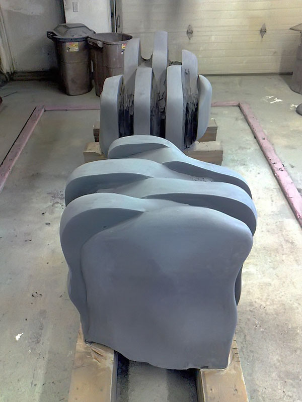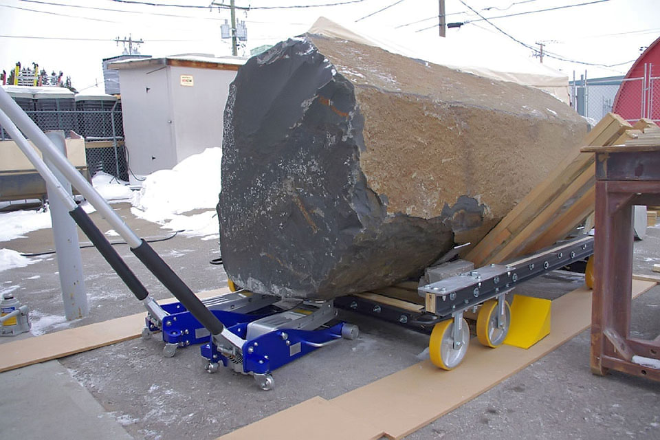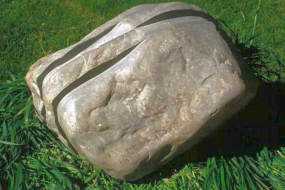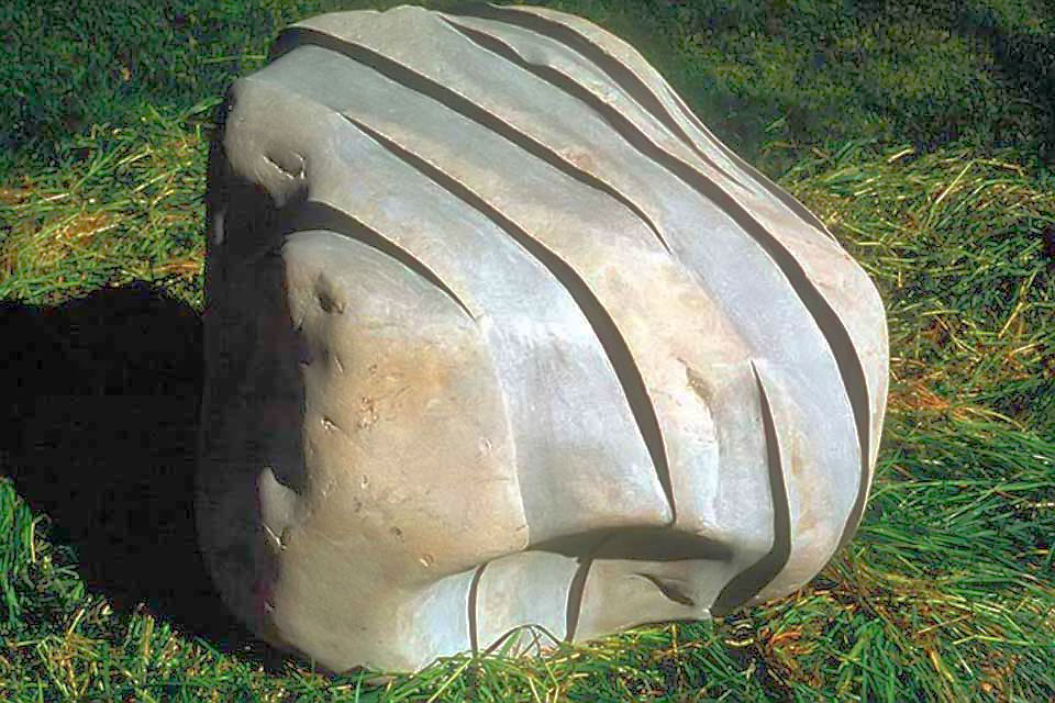 This project took ten months to complete. It was installed with a 120 ton crane in a park in St. Albert, Alberta, Canada in 2011. It consists of five carved basalt columns with a combined weight of 40,000 pounds (20 tons). The largest sculpture weighs 11,500 pounds (5.75 tons) and measures 40 inches high by 8 feet long by 32 inches in depth. Onto two of the sculptures, I carved 114 names of local businesses and individuals whose achievements have been recognized by the citizens of St. Albert. Over the next 25 years, approximately 300 more names will be added until each sculpture is filled. The wavy, displaced ribbons that I carved into each boulder suggest the motion of waves.
