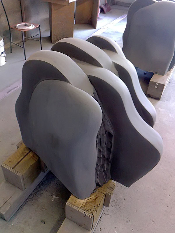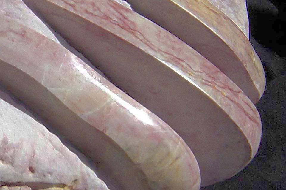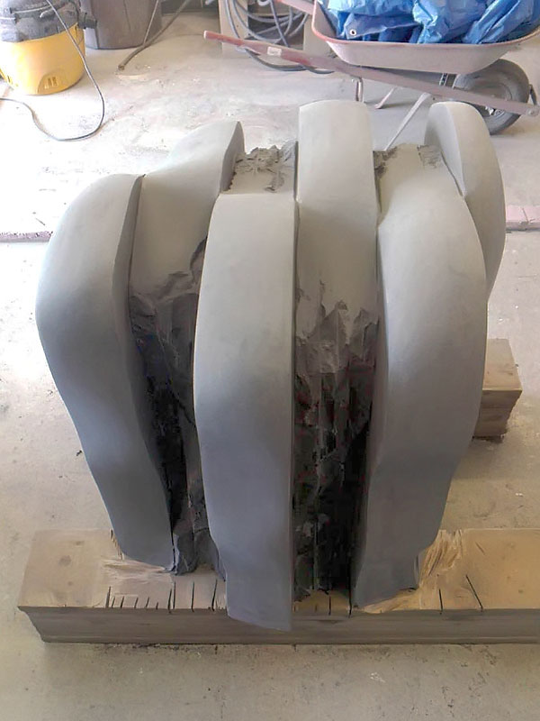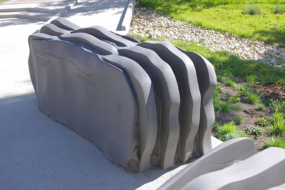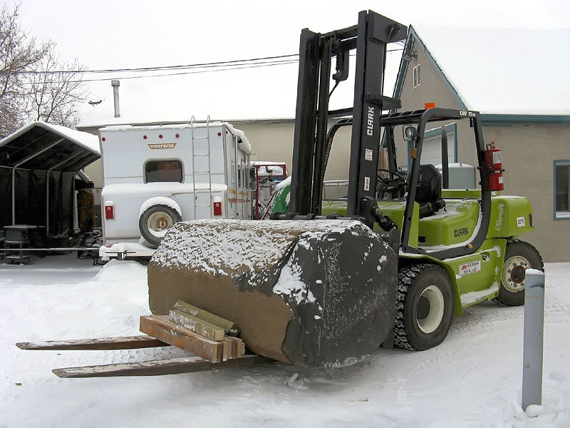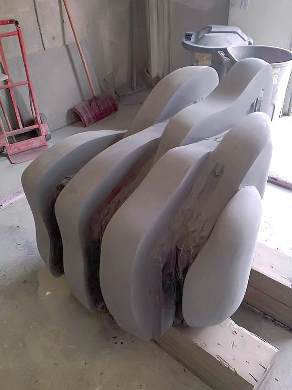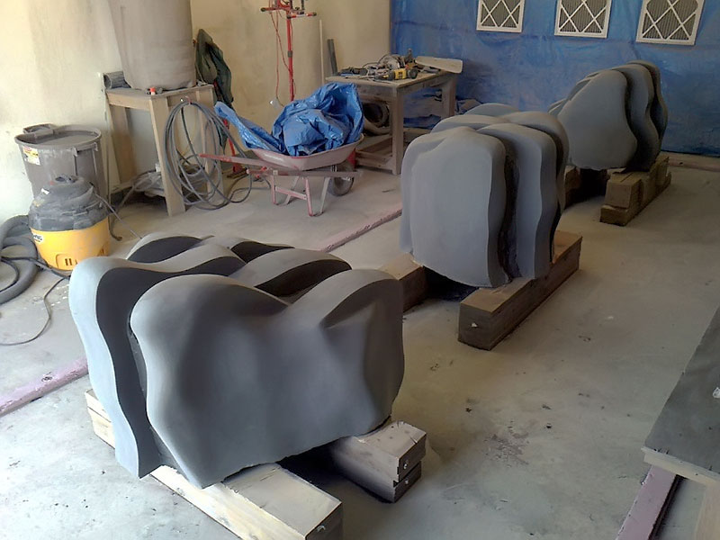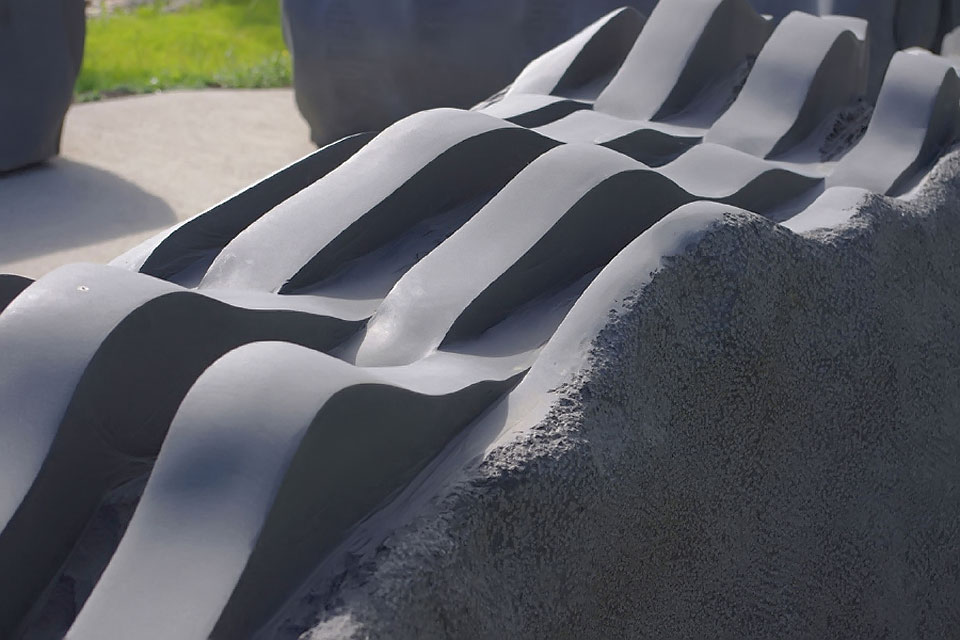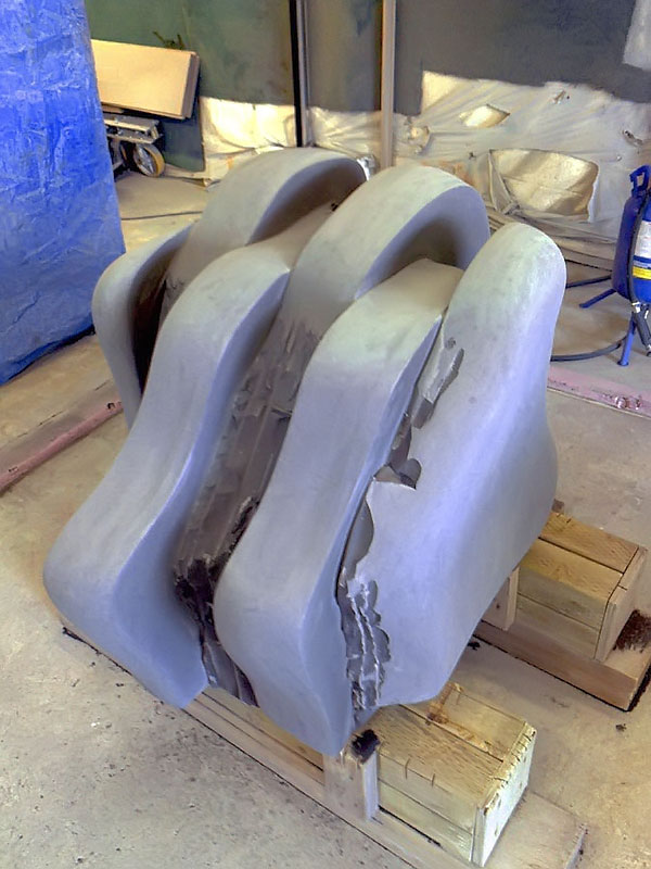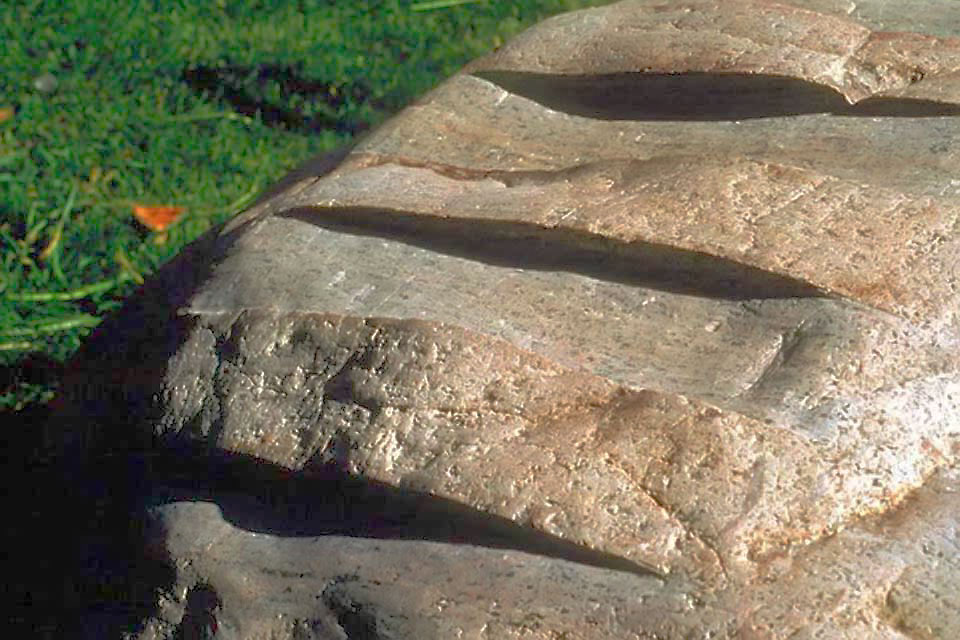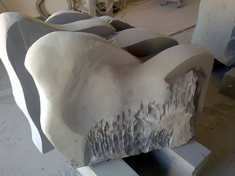 This project took ten months to complete. It was installed with a 120 ton crane in a park in St. Albert, Alberta, Canada in 2011. It consists of five carved basalt columns with a combined weight of 40,000 pounds (20 tons). The largest sculpture weighs 11,500 pounds (5.75 tons) and measures 40 inches high by 8 feet long by 32 inches in depth. Onto two of the sculptures, I carved 114 names of local businesses and individuals whose achievements have been recognized by the citizens of St. Albert. Over the next 25 years, approximately 300 more names will be added until each sculpture is filled. The wavy, displaced ribbons that I carved into each boulder suggest the motion of waves.