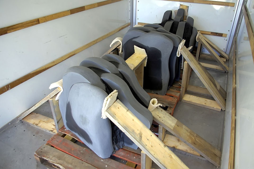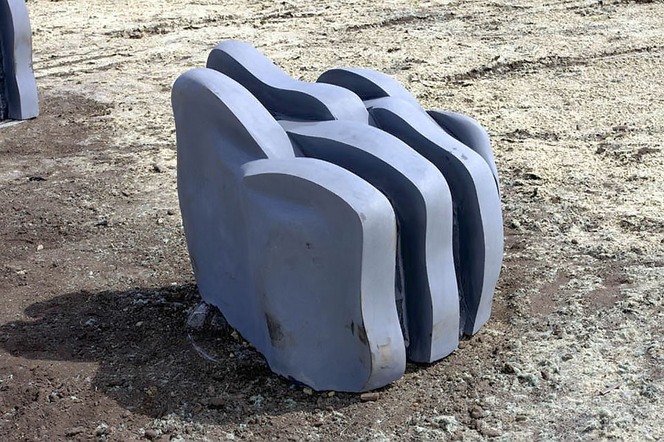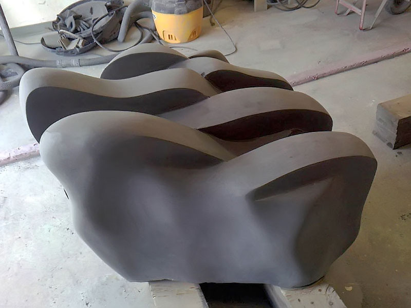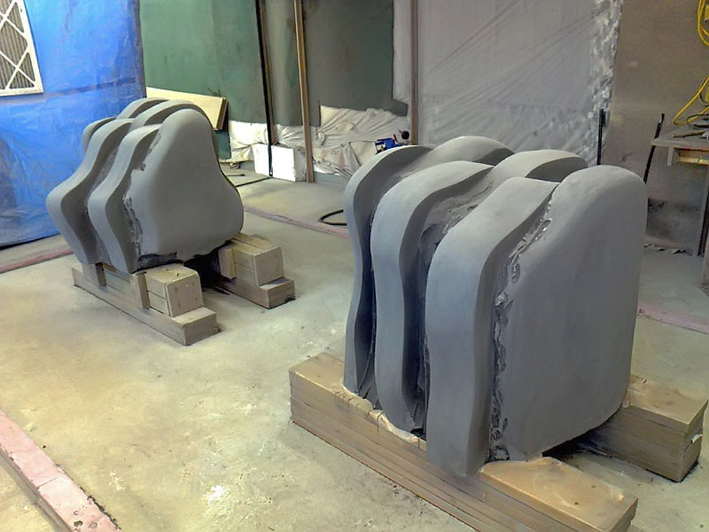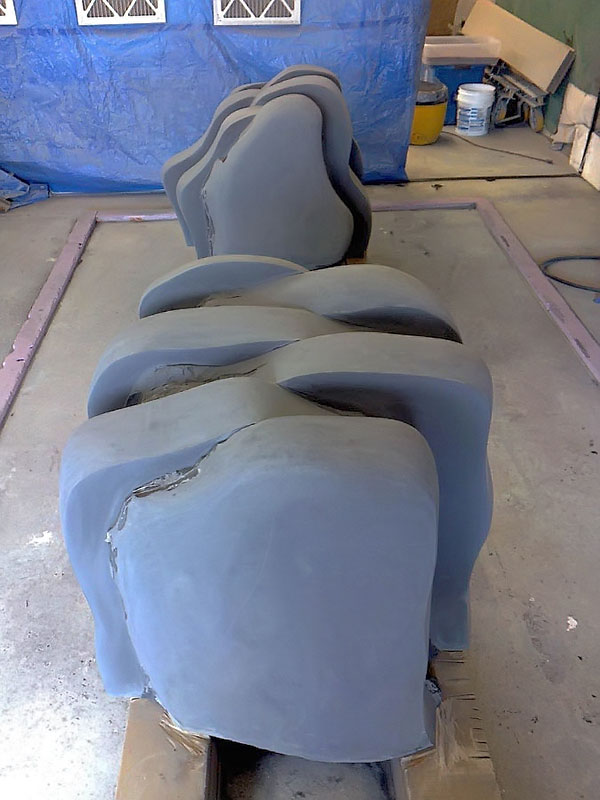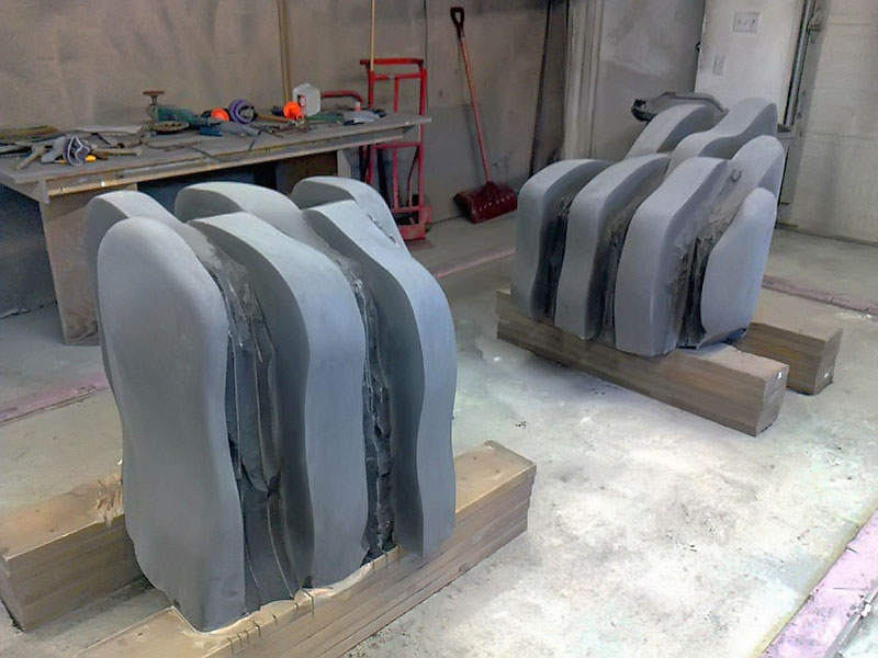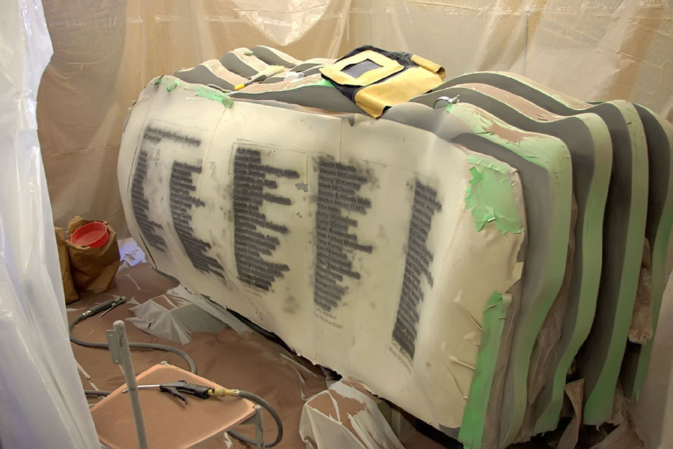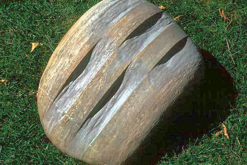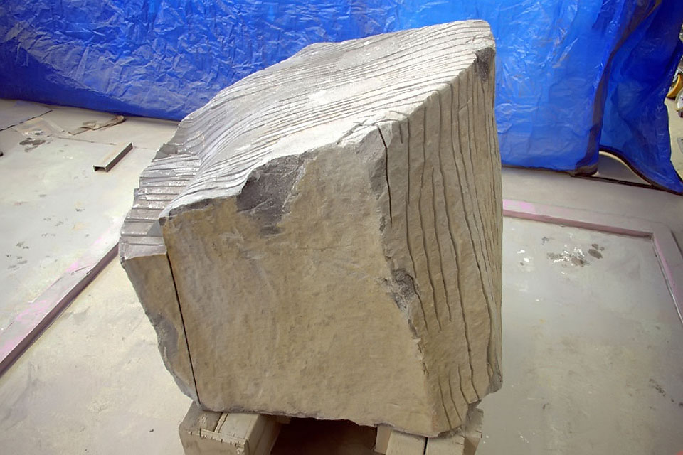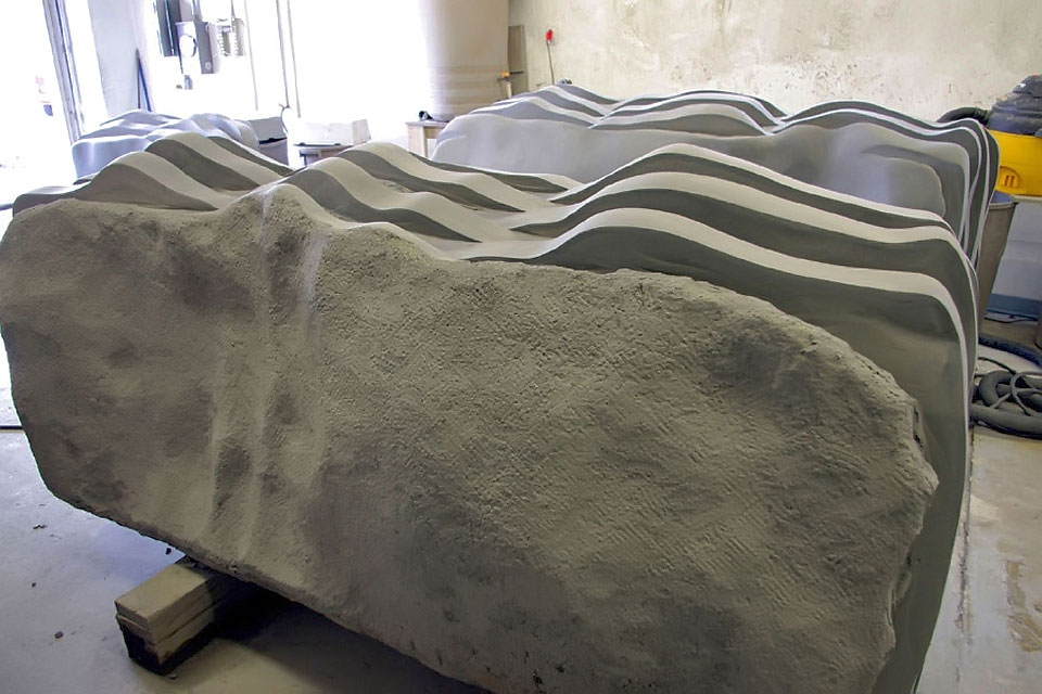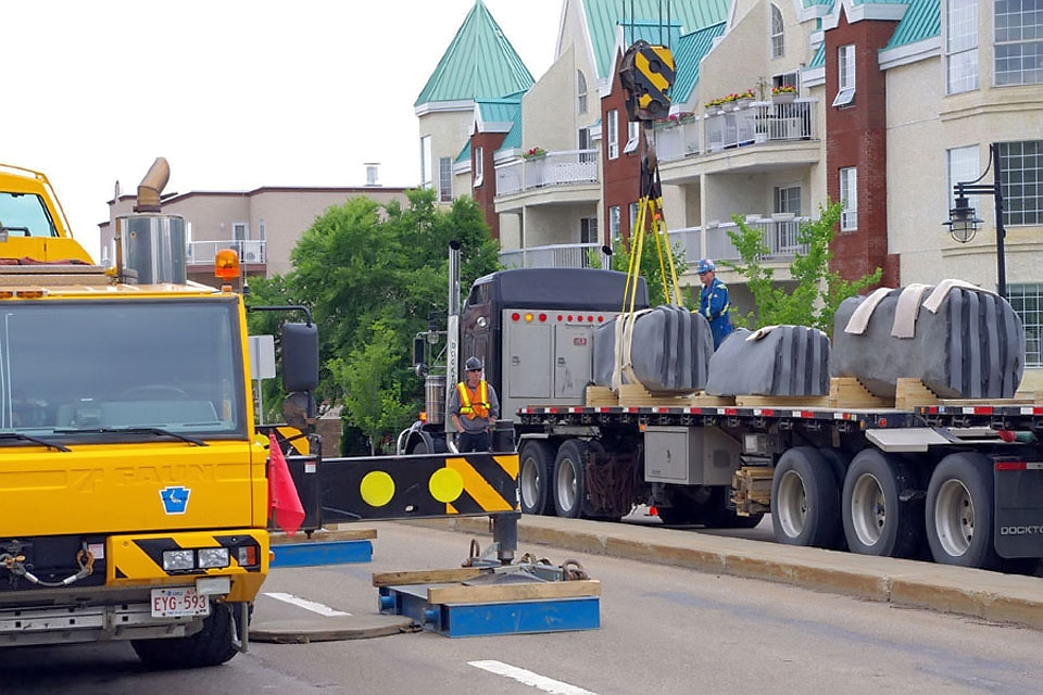 This project took ten months to complete. It was installed with a 120 ton crane in a park in St. Albert, Alberta, Canada in 2011. It consists of five carved basalt columns with a combined weight of 40,000 pounds (20 tons). The largest sculpture weighs 11,500 pounds (5.75 tons) and measures 40 inches high by 8 feet long by 32 inches in depth. Onto two of the sculptures, I carved 114 names of local businesses and individuals whose achievements have been recognized by the citizens of St. Albert. Over the next 25 years, approximately 300 more names will be added until each sculpture is filled. The wavy, displaced ribbons that I carved into each boulder suggest the motion of waves.