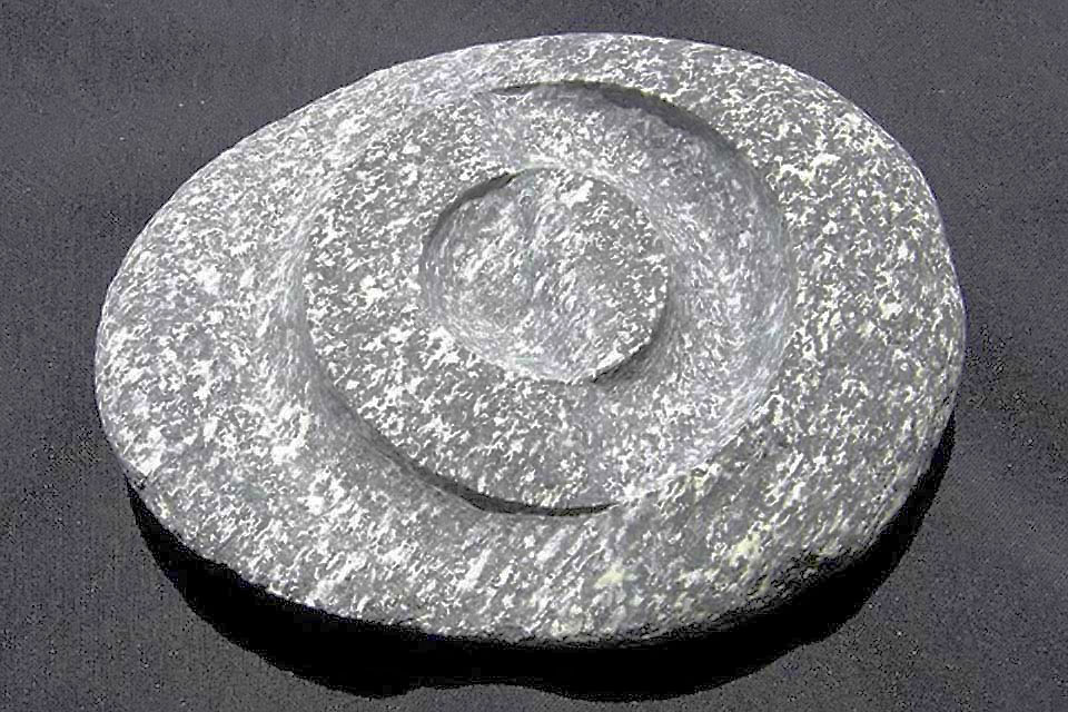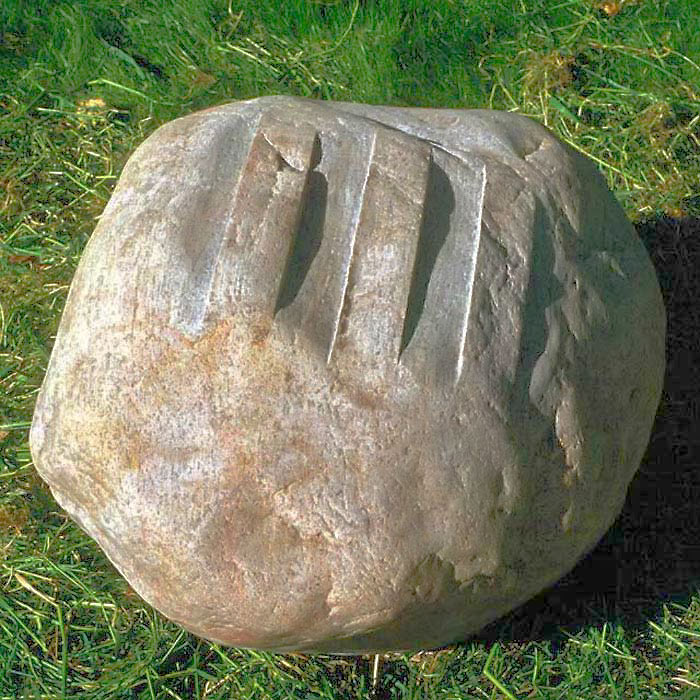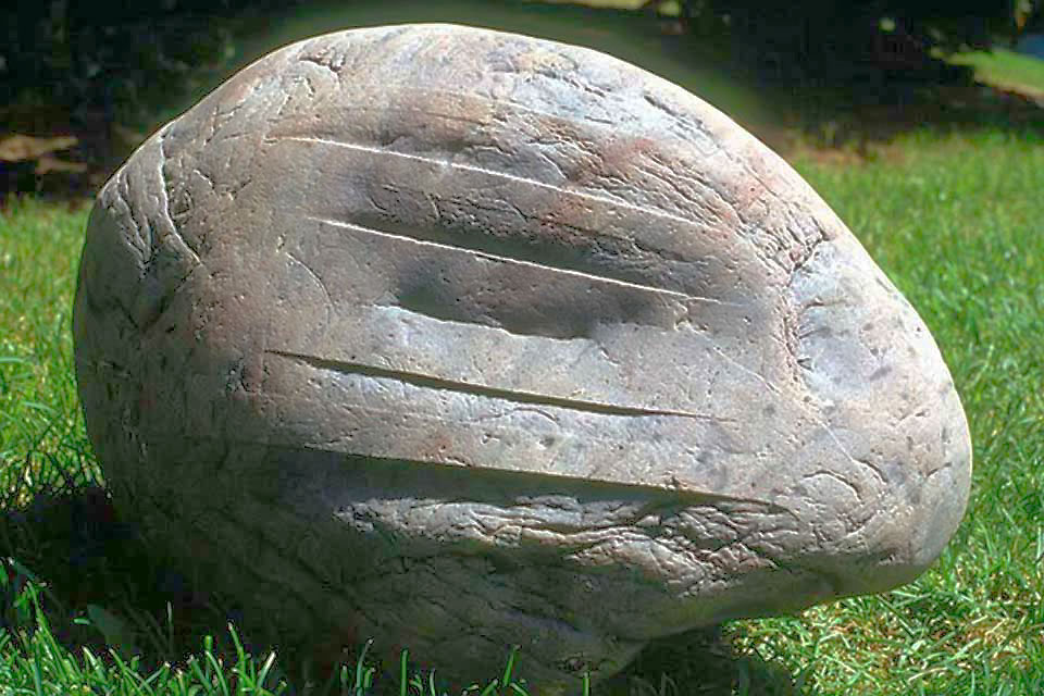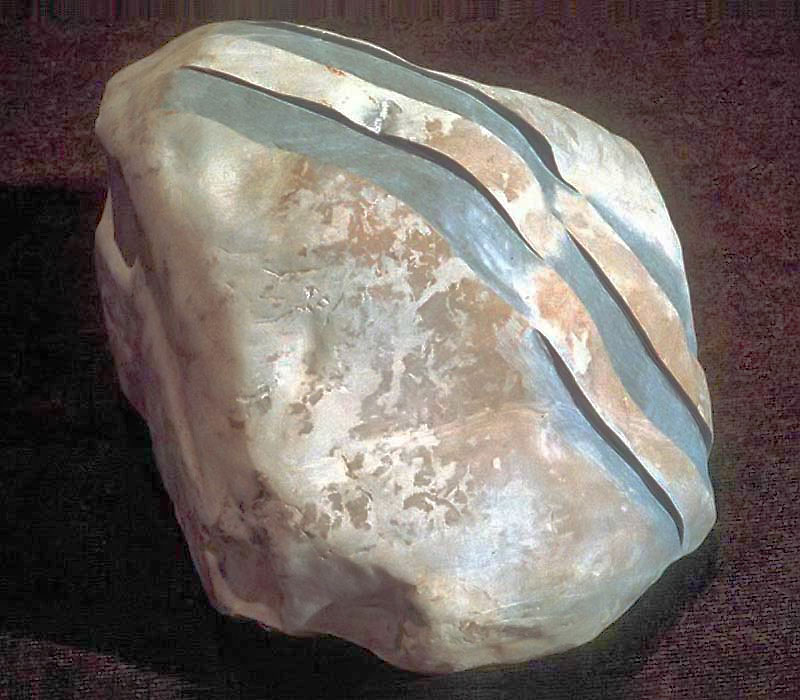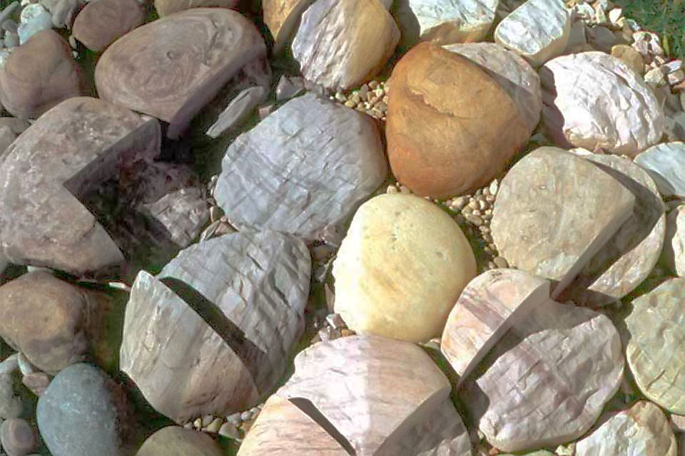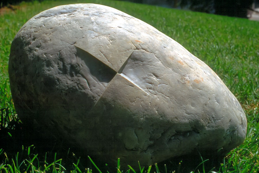 With this in mind, it seems appropriate (if not necessary) that I emphasize a stone's character - its concreteness, materiality, and history - by setting complimentary properties - abstraction, non-materiality, and non-history - next to it. In relation to the object's history, one may say that the ordinariness of a stone's appearance is such that it connects the object to "the everyday", while the marks on its surface - the scars, scratches, chips, and cracks - convey a sense of its connection to the past. From this perspective, its weather-worn contours evoke a sense of the larger context of our planetary evolution and the eons of geologic time that have elapsed in forming these objects. Deeper consideration of the stone's every-dayness - its connection not just to the days of the present and recent past, but to all the days that stretch back to the formation of the earth - imbues the stone with a sense of temporality and actuality and, perhaps, even a sense of sacredness. In carving a shape into the stone, I add another mark, a self-conscious mark, that then becomes a part of the stone's history.