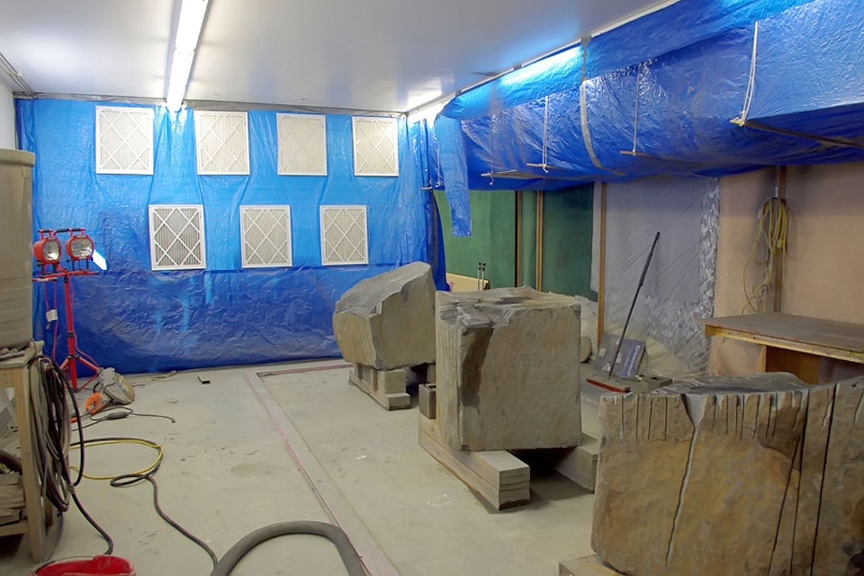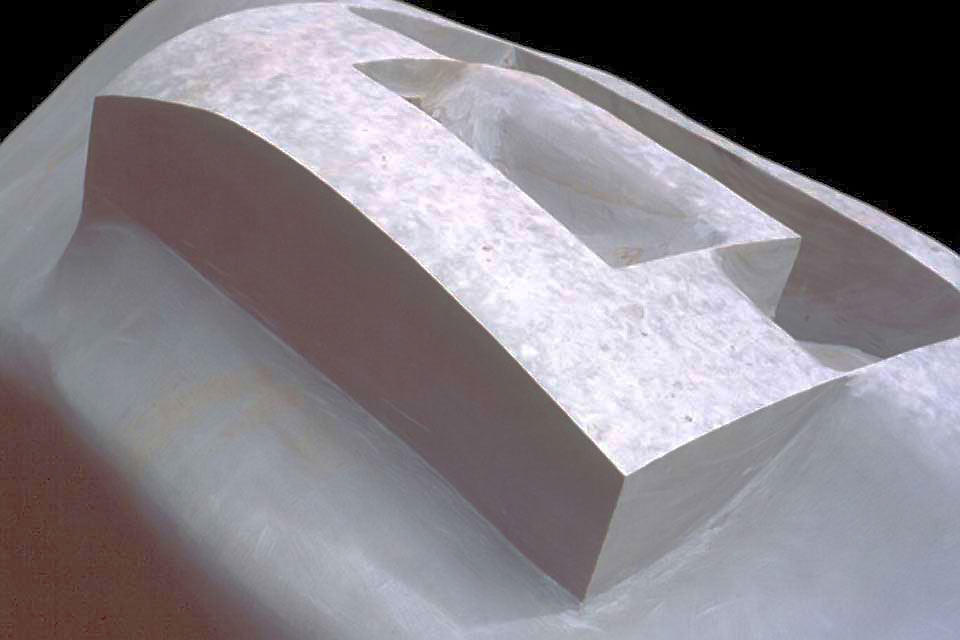 The artwork that I wanted to create for this project would be a triptych carved from basalt stone, the same stone that the Egyptians used to make sarcophagi. Technically, I like basalt because it's a very hard stone that's not easily vandalized. Conceptually, I like basalt because it's ubiquitous in our solar system. It's found on the moon, on Venus, Mercury, Mars and possibly on many smaller bodies around the outer planets. Basalt connects our earth to a much larger context: the dust that we are all made out of. The carving was done with diamond saws and grinders (diamond is the only material hard enough to work basalt).