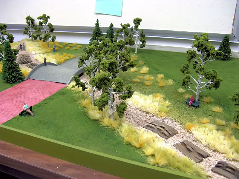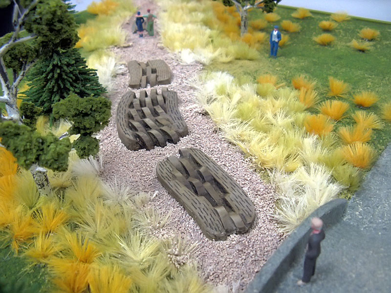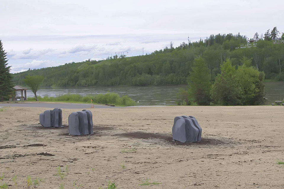 My triptych alludes to the quiet and subtle beauty of the surrounding hills and the Athabasca River. The graceful contours of the land and the flowing water are echoed in the gentle rise and fall of each line in each stone. The work is of human scale so that it doesn't impose itself on the space. Large monuments tend to do that. If it were huge it would dominate the space and would be shouting rather than whispering like the distant hills and the water. The work also tries to encompass a larger theme through its title, "Turned by a Pebble's Edge". This is a line from a beautiful poem, "The Two Streams" by Oliver Wendell Holmes (click this link to read the entire poem). In this poem, Holmes talks about how a seemingly inconsequential thing like a drop of water hitting a pebble and, instead of going west to the Pacific Ocean by way of the Columbia River, is redirected east toward the Arctic Ocean and thereby creates the Athabasca River. The history of countless thousands of people and communities owe their existence to a random quirk of geography. This is equally true of almost every human settlement on earth. It's a humbling thought that makes me want to take better care of the land and the water. This is also similar to the "butterfly effect" wherein a small and random occurrence can have a huge impact down the line as the effect becomes multiplied by numerous chaotic systems.