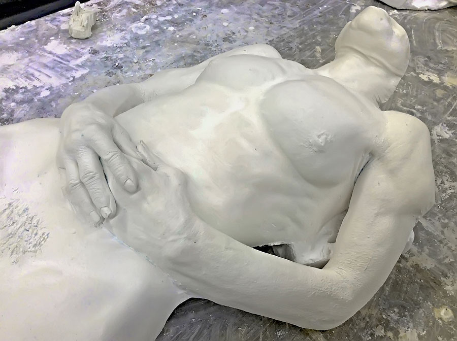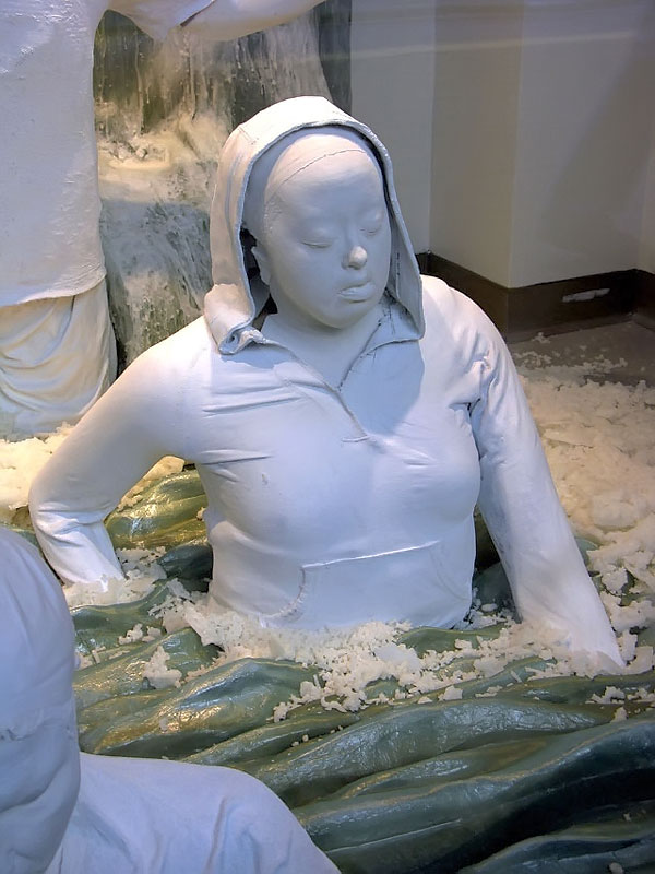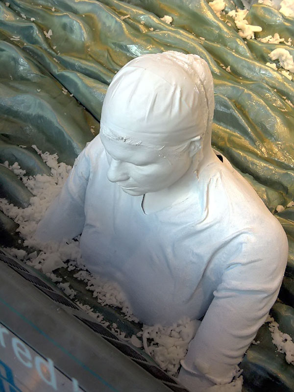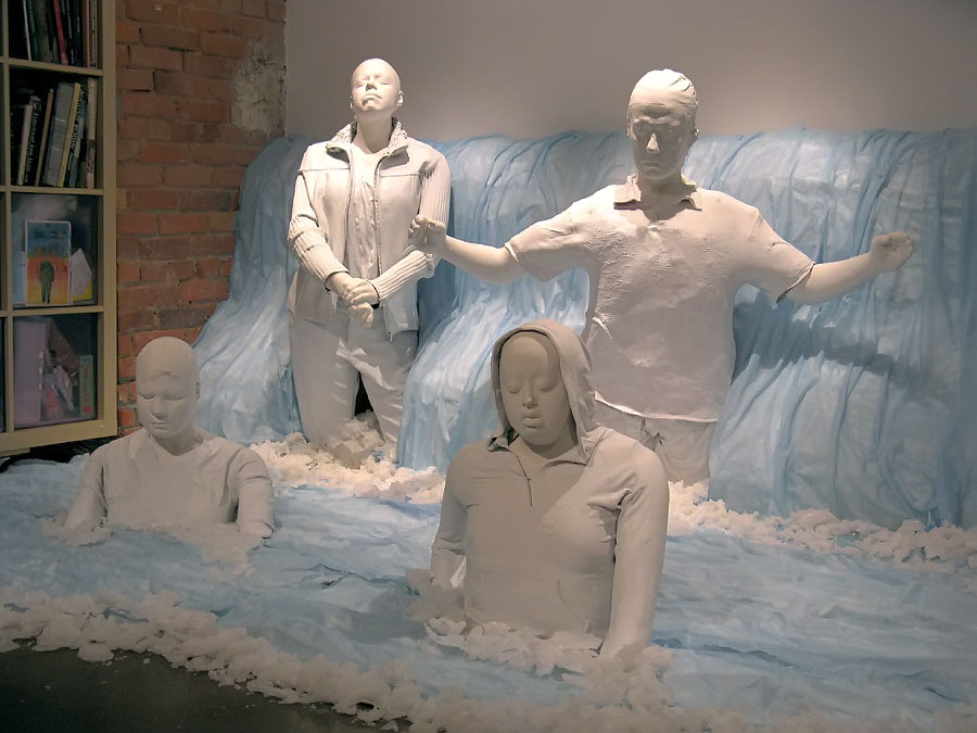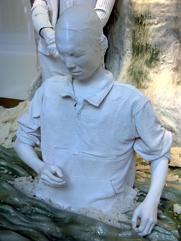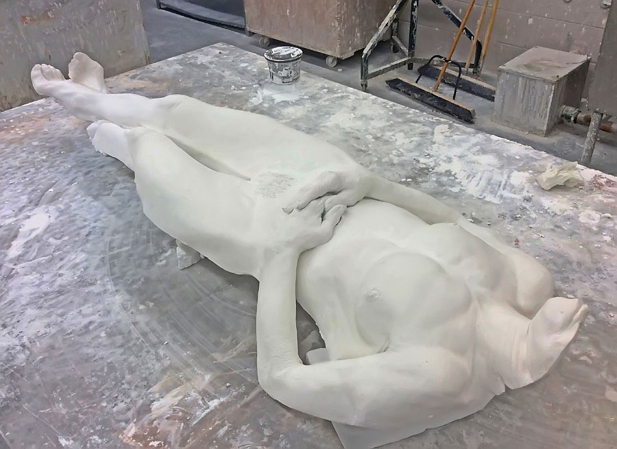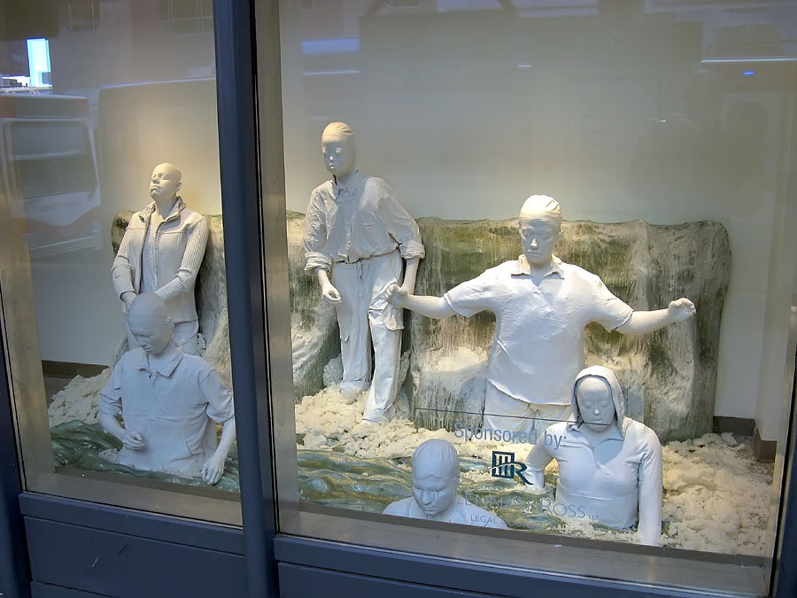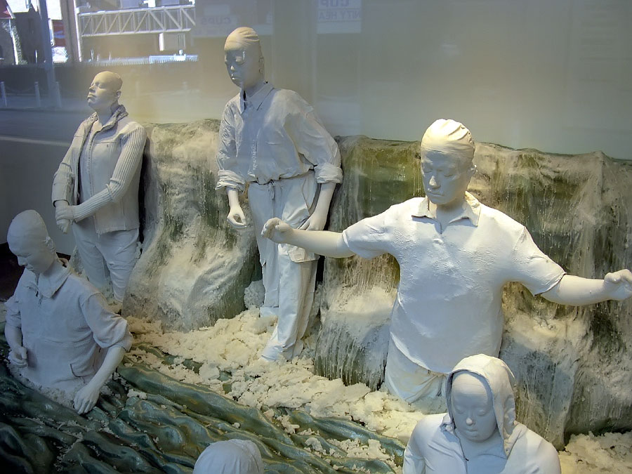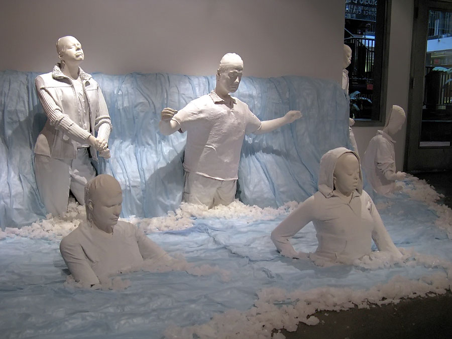 The public art space titled, OPEN SPACES: Window to a View is an ideal location for an art installation that speaks to the experience of taking public transit. I worked with sixty-five artists from Studio C for several months to create life-cast figure sculptures for this space. We made many plaster casts of our limbs and our faces and then attached them to armatures that resembled torsos at various stages of sinking into an imaginary aquatic medium. The end result was a dynamic installation of realistic human forms amidst an undulating surface that resembled roiling ocean waves. Finally, to metaphorically connect public transit to our depiction of individuals merging into an angry sea, we titled the artwork Rush Hour (also a nod to one of the fathers of lifecasting, George Segal).