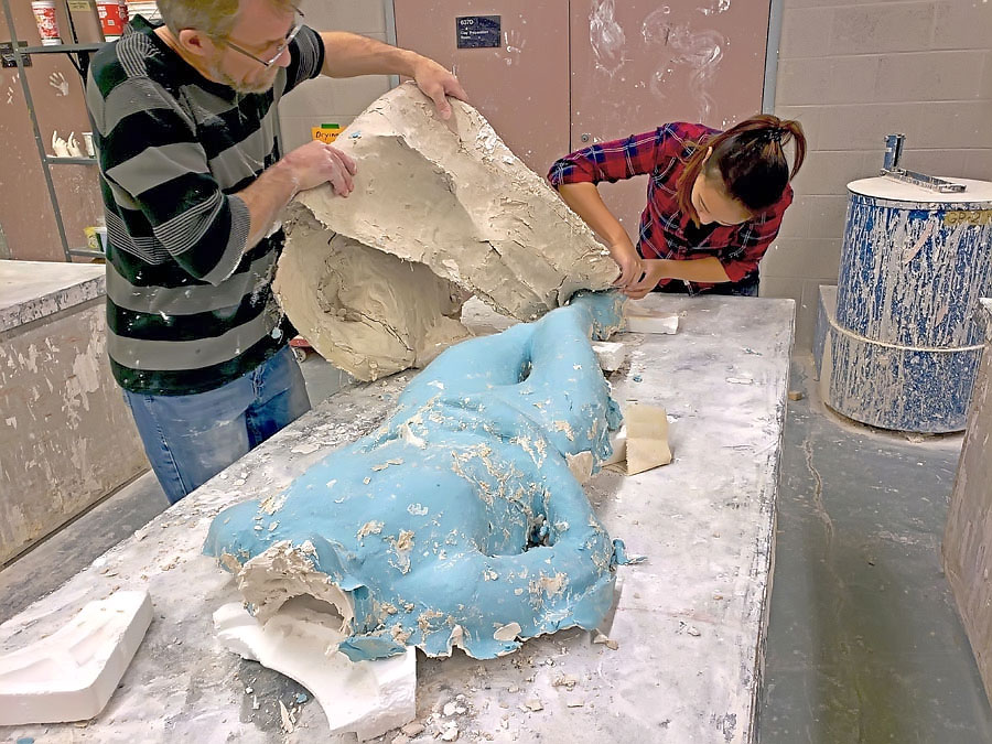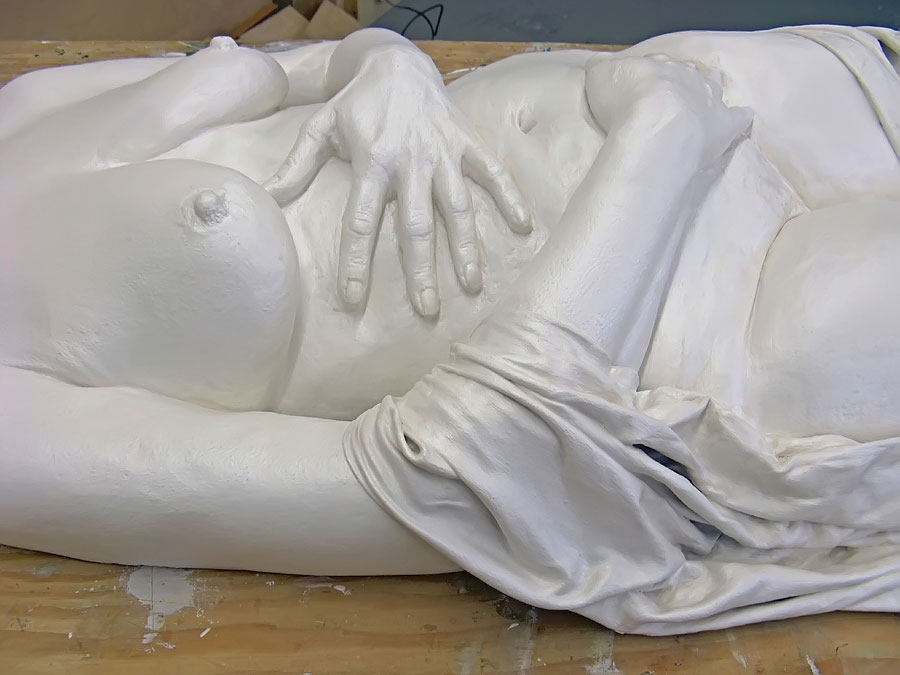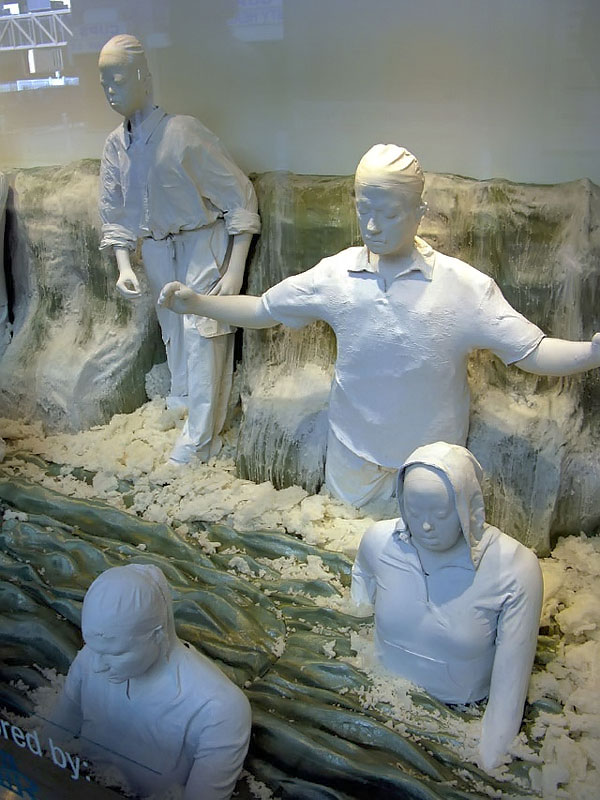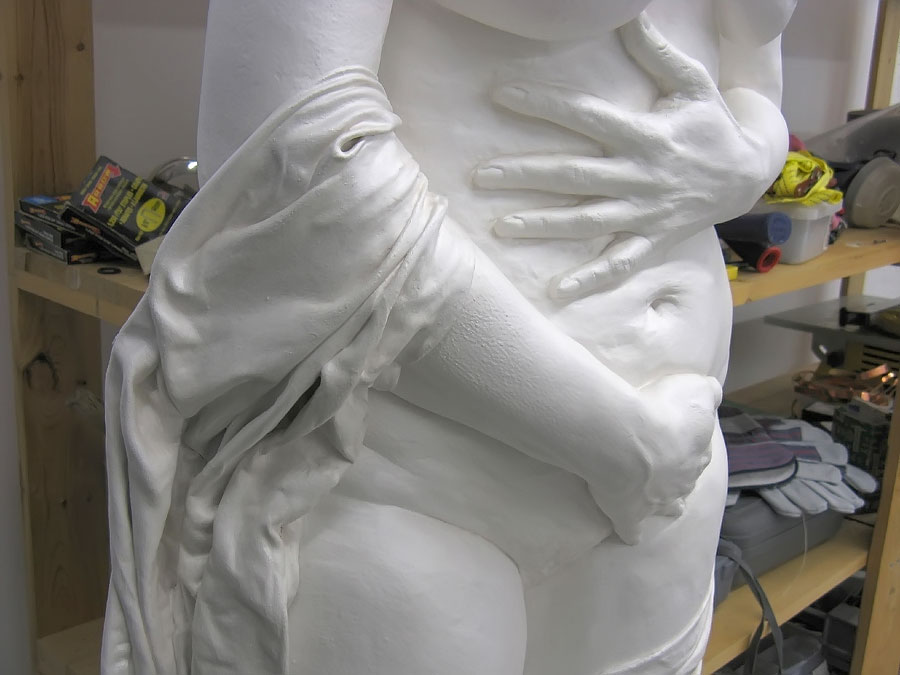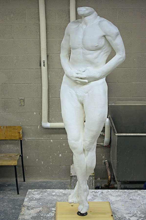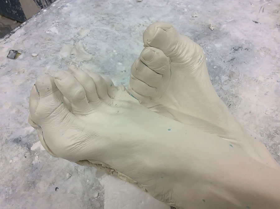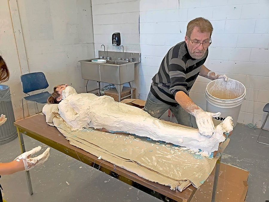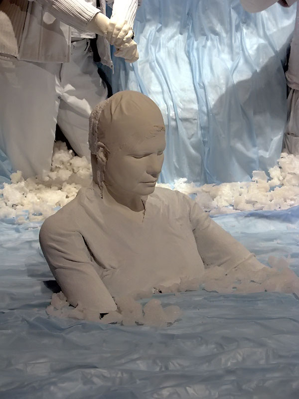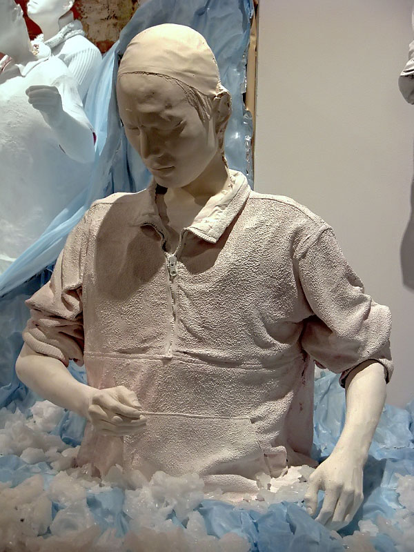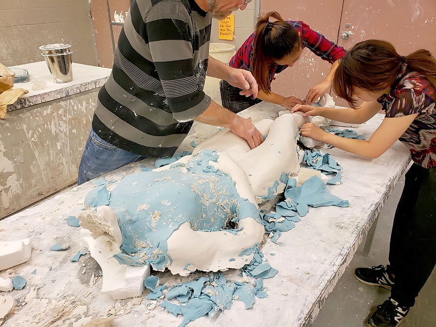 The public art space titled, OPEN SPACES: Window to a View is an ideal location for an art installation that speaks to the experience of taking public transit. I worked with sixty-five artists from Studio C for several months to create life-cast figure sculptures for this space. We made many plaster casts of our limbs and our faces and then attached them to armatures that resembled torsos at various stages of sinking into an imaginary aquatic medium. The end result was a dynamic installation of realistic human forms amidst an undulating surface that resembled roiling ocean waves. Finally, to metaphorically connect public transit to our depiction of individuals merging into an angry sea, we titled the artwork Rush Hour (also a nod to one of the fathers of lifecasting, George Segal).