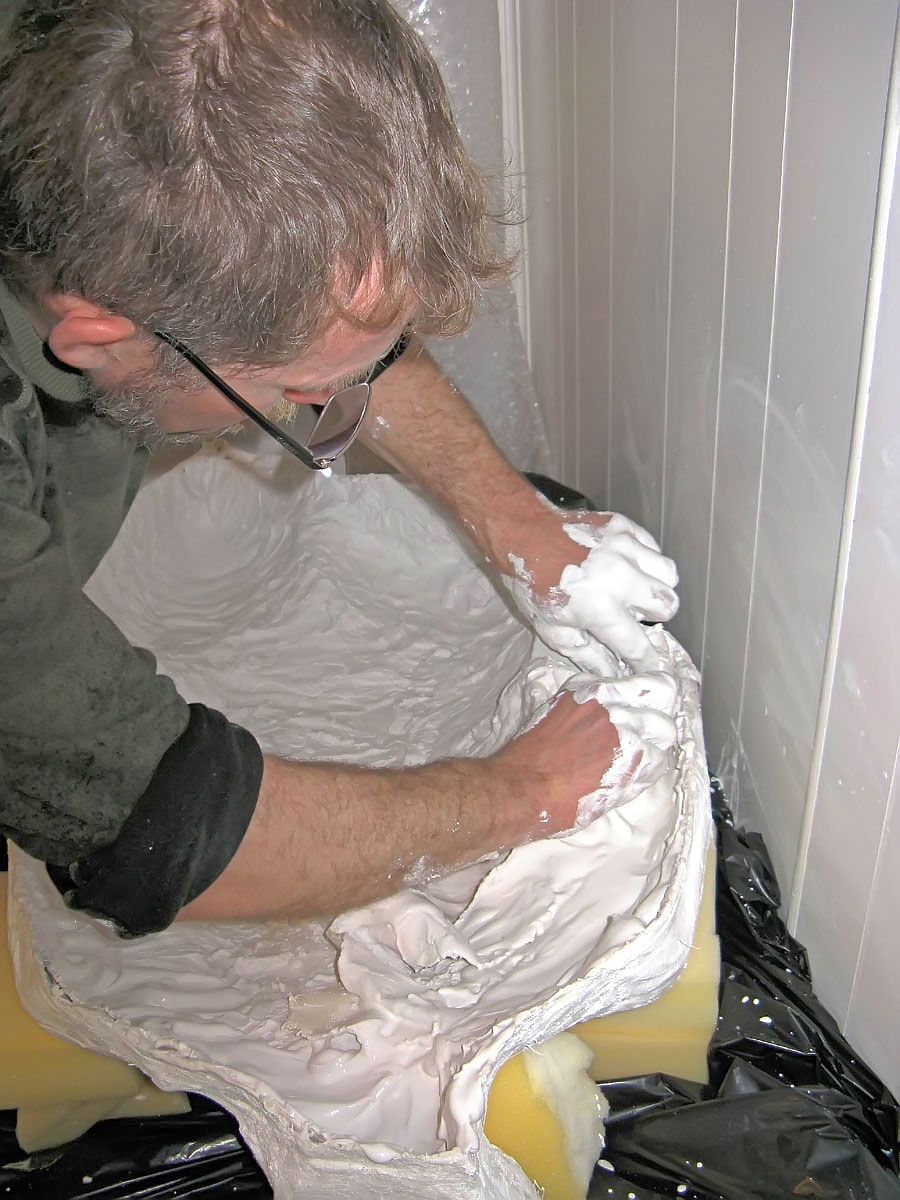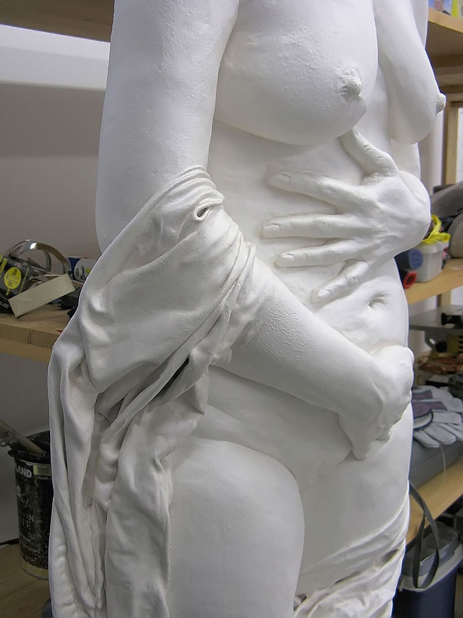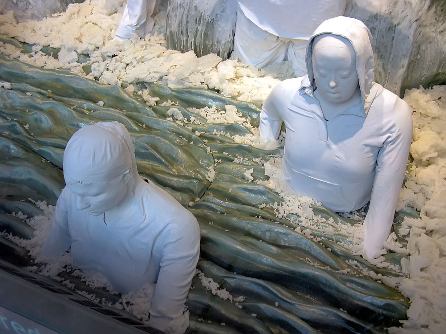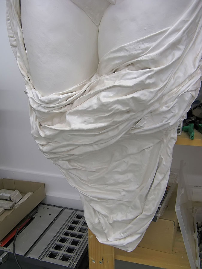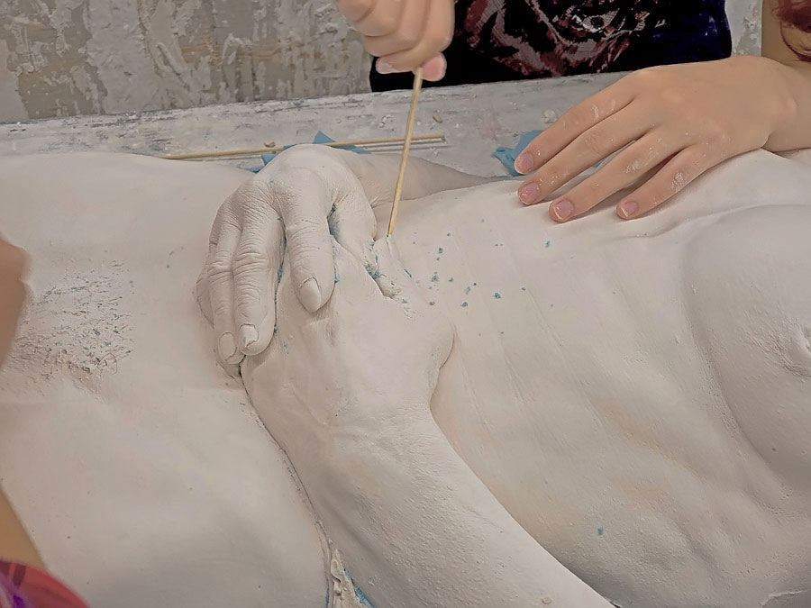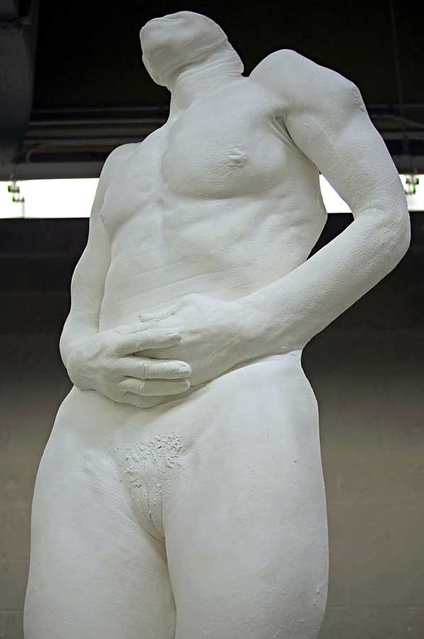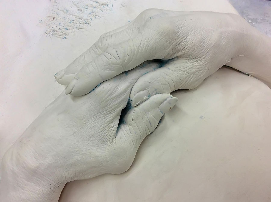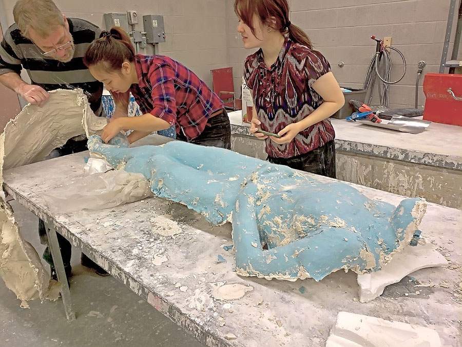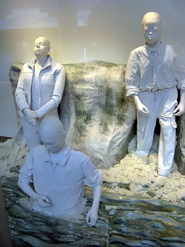 The public art space titled, OPEN SPACES: Window to a View is an ideal location for an art installation that speaks to the experience of taking public transit. I worked with sixty-five artists from Studio C for several months to create life-cast figure sculptures for this space. We made many plaster casts of our limbs and our faces and then attached them to armatures that resembled torsos at various stages of sinking into an imaginary aquatic medium. The end result was a dynamic installation of realistic human forms amidst an undulating surface that resembled roiling ocean waves. Finally, to metaphorically connect public transit to our depiction of individuals merging into an angry sea, we titled the artwork Rush Hour (also a nod to one of the fathers of lifecasting, George Segal).
